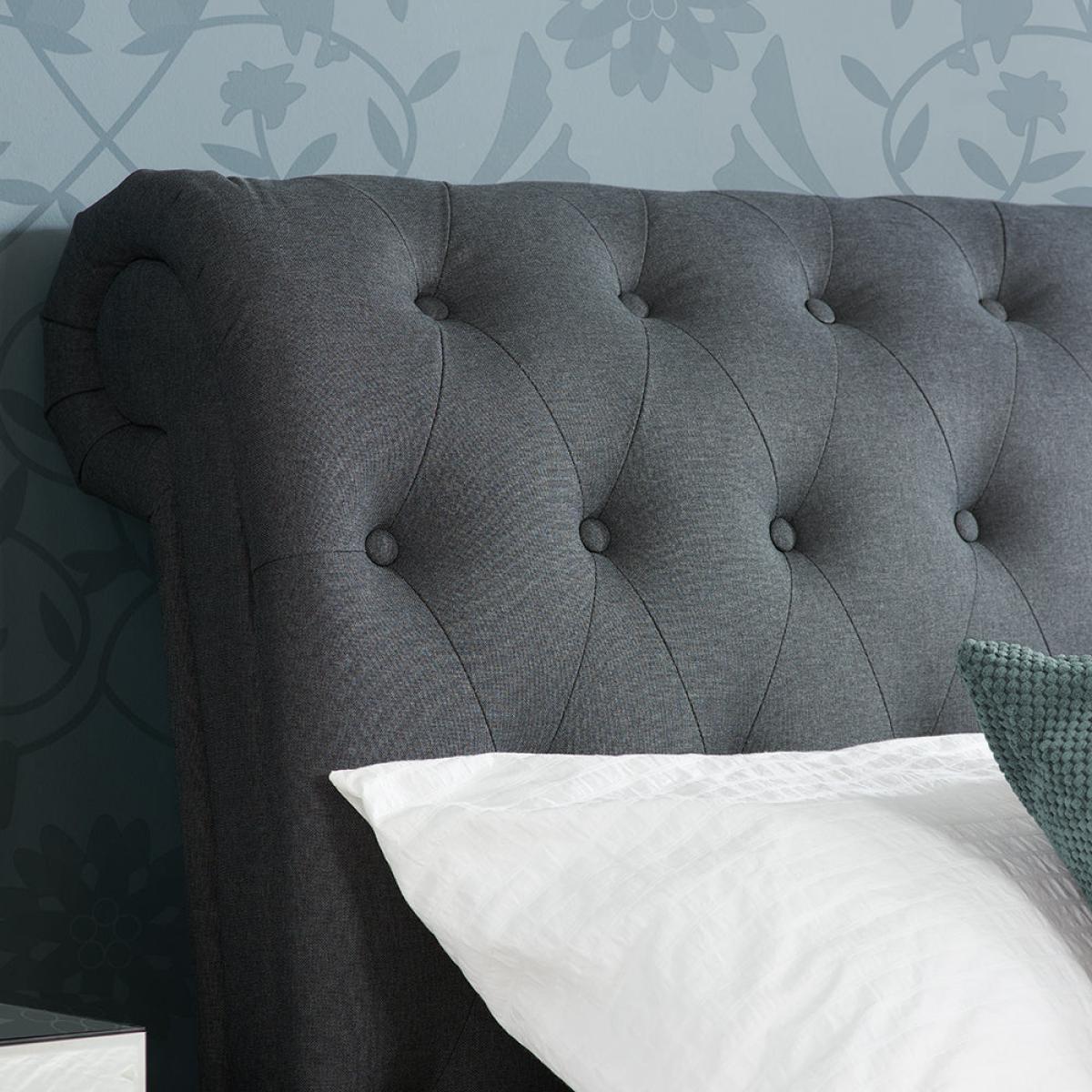 This fantastic bed frame combines practicality with style with its striking rolled headboard and matching foot-end. The platform top ottoman base features gas lift arms which can be fitted to open on either the left or right-hand side of the bedstead giving your customers that extra flexibility. Upholstered in polyester the Caspian side ottoman is available in a steel crushed velvet, charcoal or grey fabric. A protective base board is also included. Please note: Olivia's beds are only suitable for a UK standard size mattress and the recommended maximum mattress height is 200 mm. The mattress needs to be on the bed for the pistons to work. Dimensions: Double - H: 118 x W: 149 x D: 248 cm. Kingsize - H: 118 x W: 163 x D: 259 cm. Super Kingsize - H: 118 x W: 192 x D: 259 cm Materials: Polyester Assembly Required: Yes Care Instructions: Fabric can be gently brushed or lightly vacuumed to remove any dust. With any spilages, take immediate action to remove excess liquid. Do not rub or use any detergents. Always follow cleaning instructions included in the assembly instructions