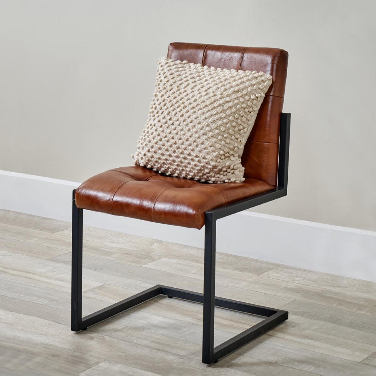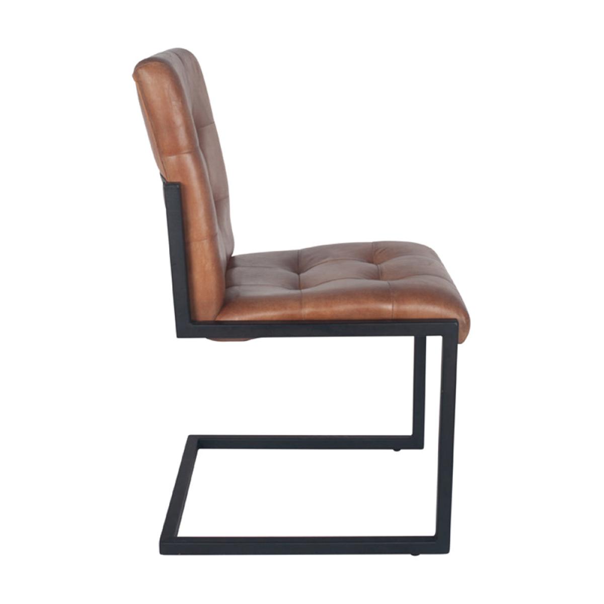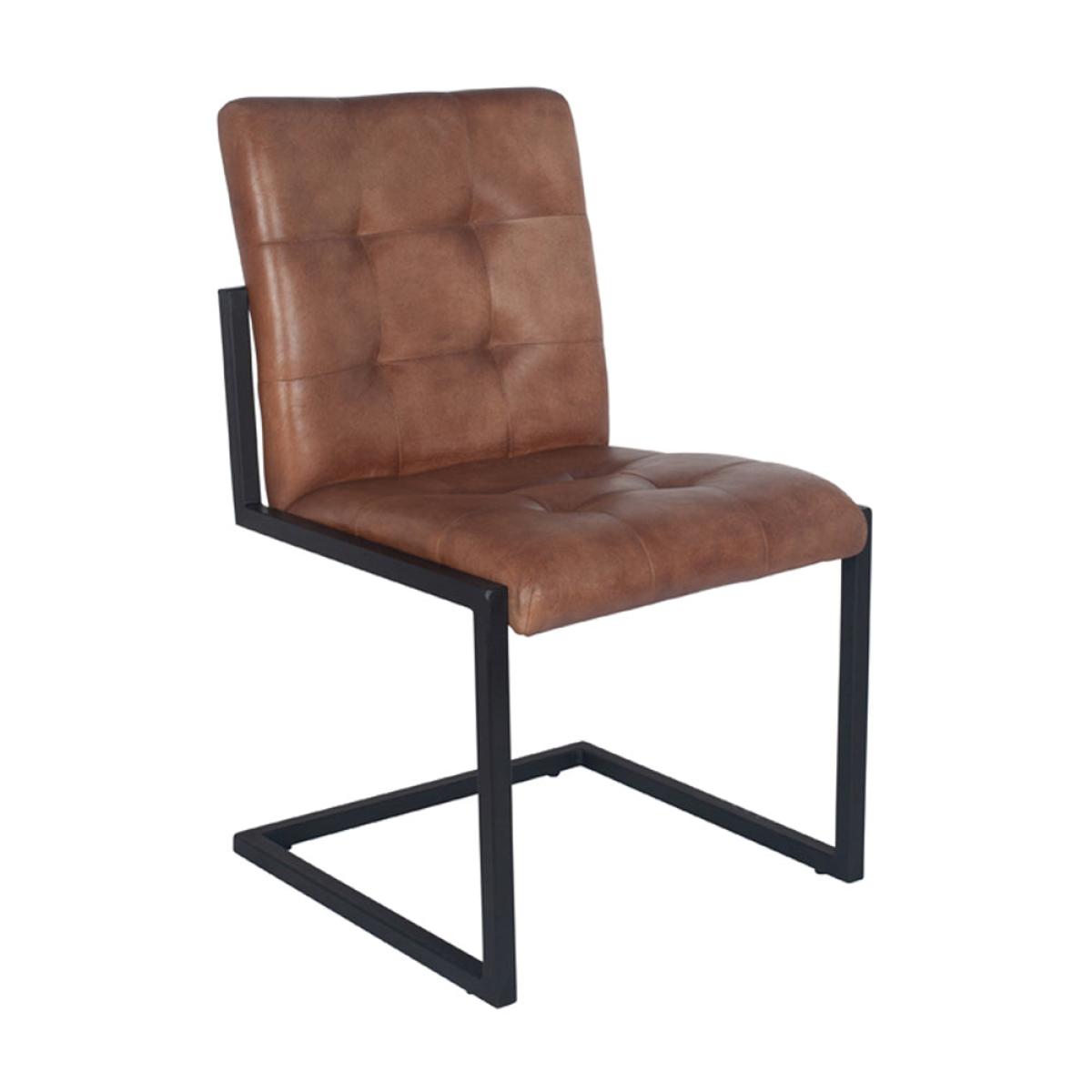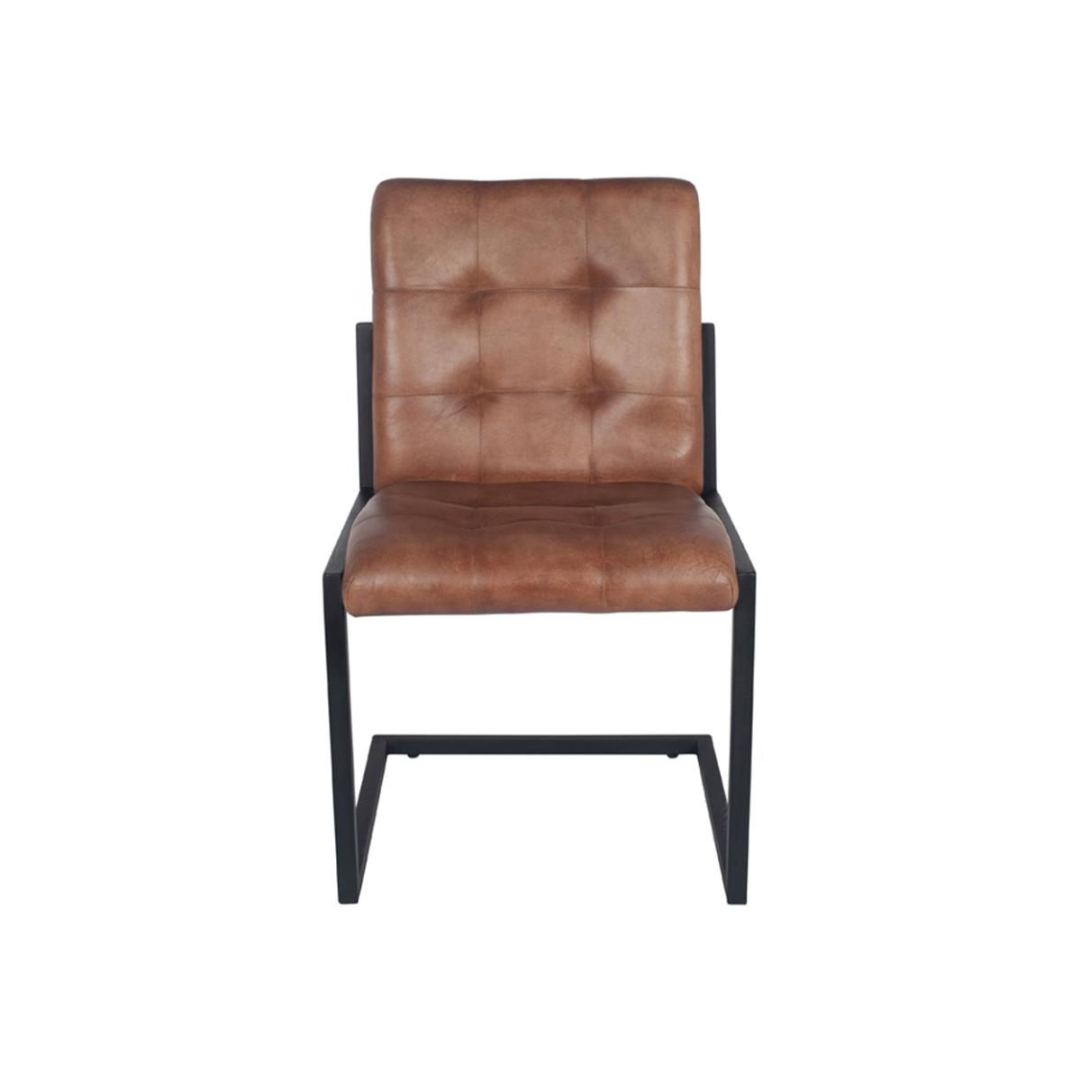 Beautiful vintage brown leather with cushioning detail and matt black metal frame; this chair blends industrial style with comfort and quality. Dining chair in conception; however, it can easily be used as an occasional chair or extra lounge seating. A matching bar stool is also available along with a steel grey colour.