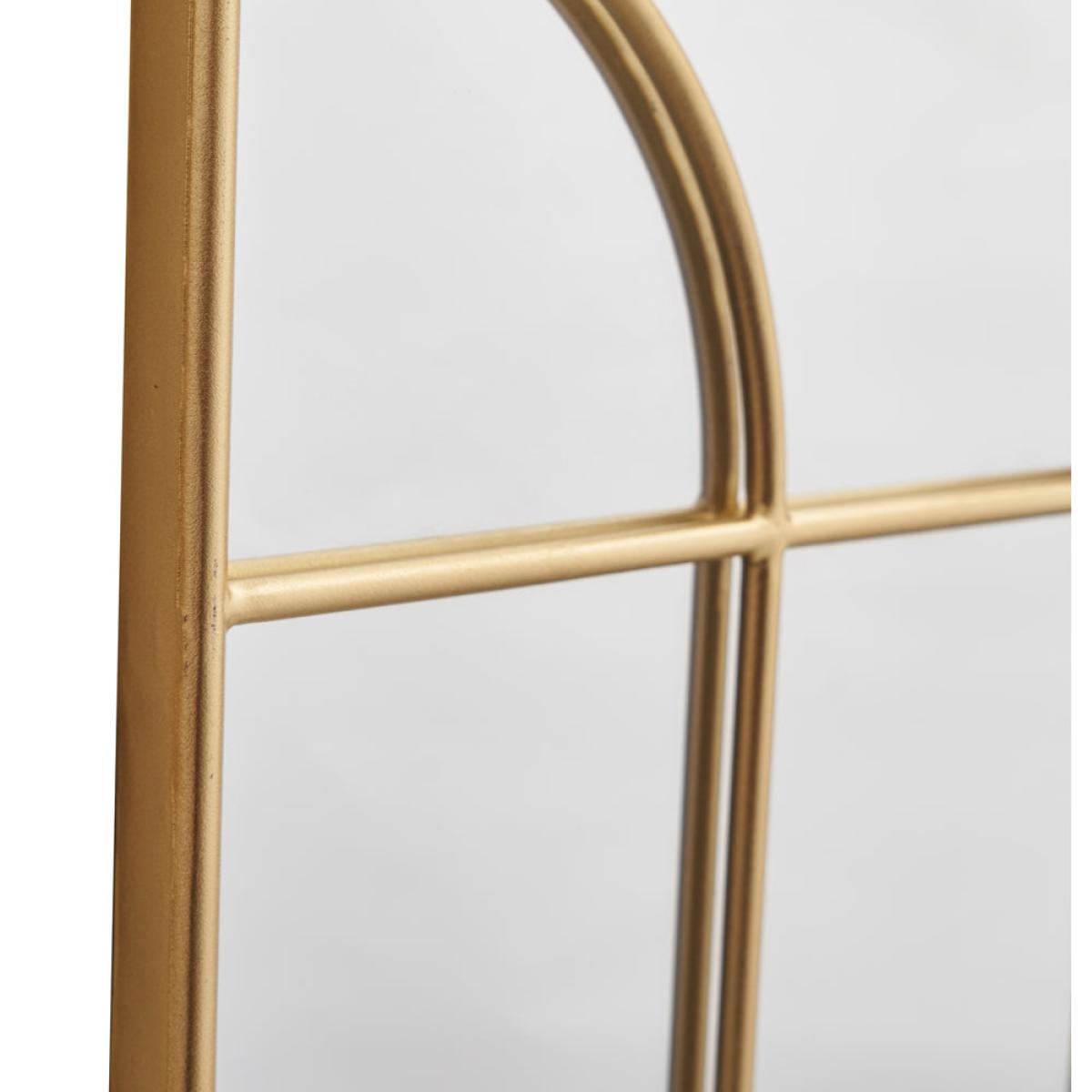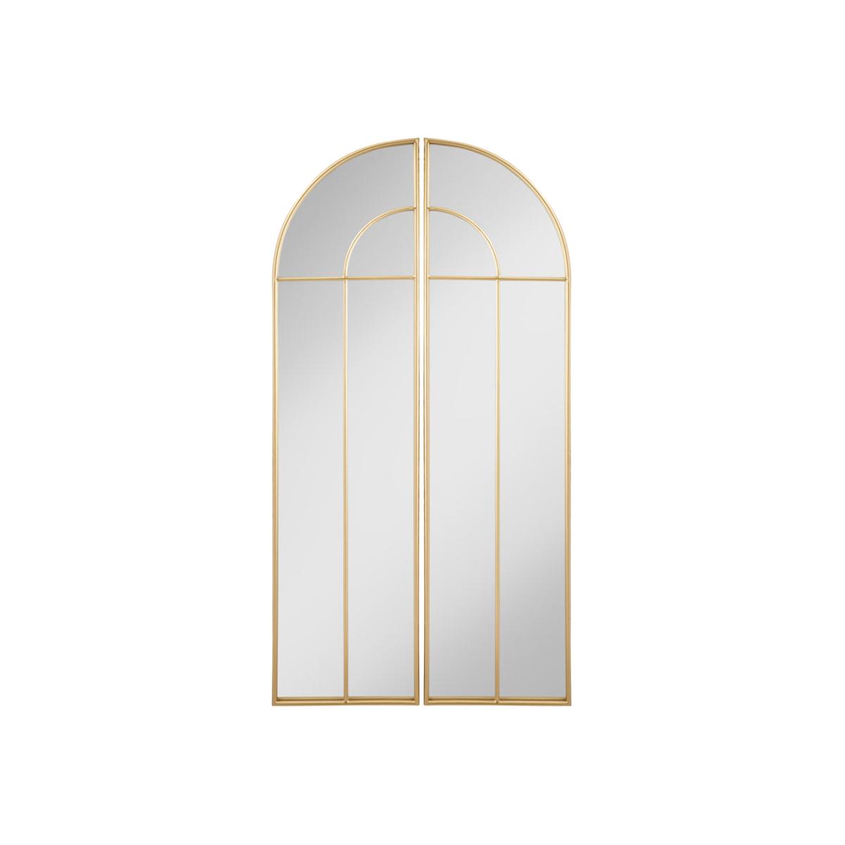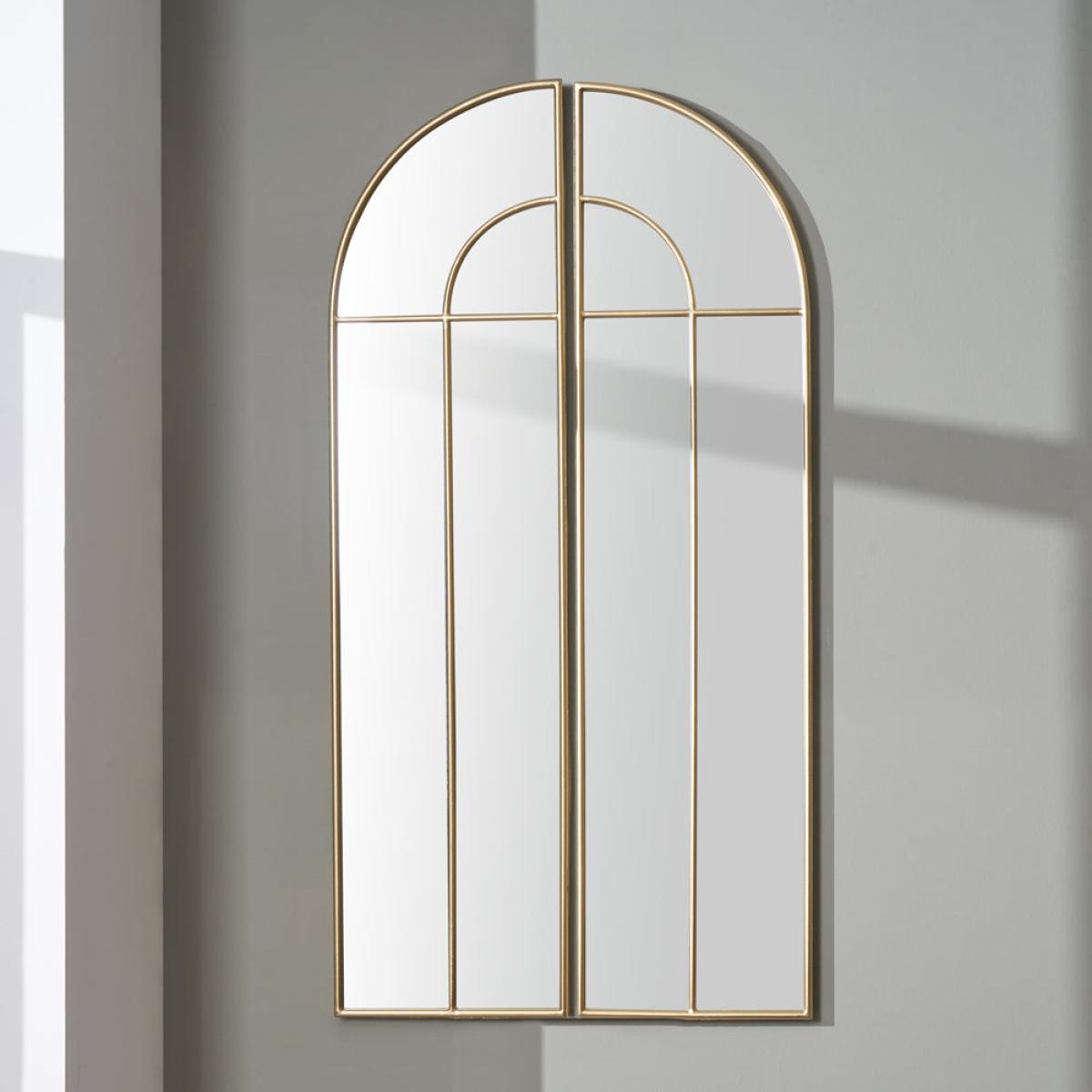 This mirror of two halves with gold metal arched frame and gold metal detailing commands attention with its stunning design and striking proportions. The statement wall mirror is perfect for placing in a bedroom, hallway, or living room and will provide maximum light through your interior.
