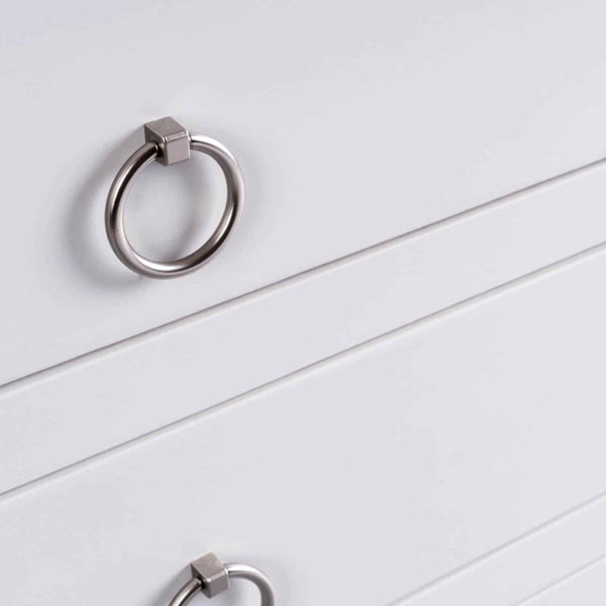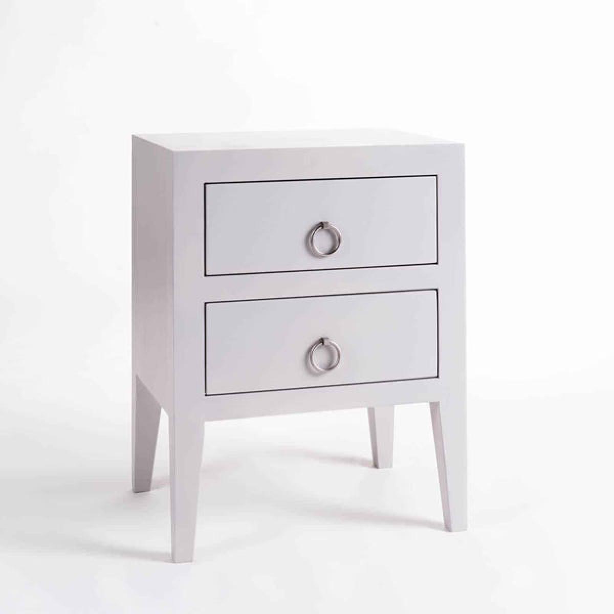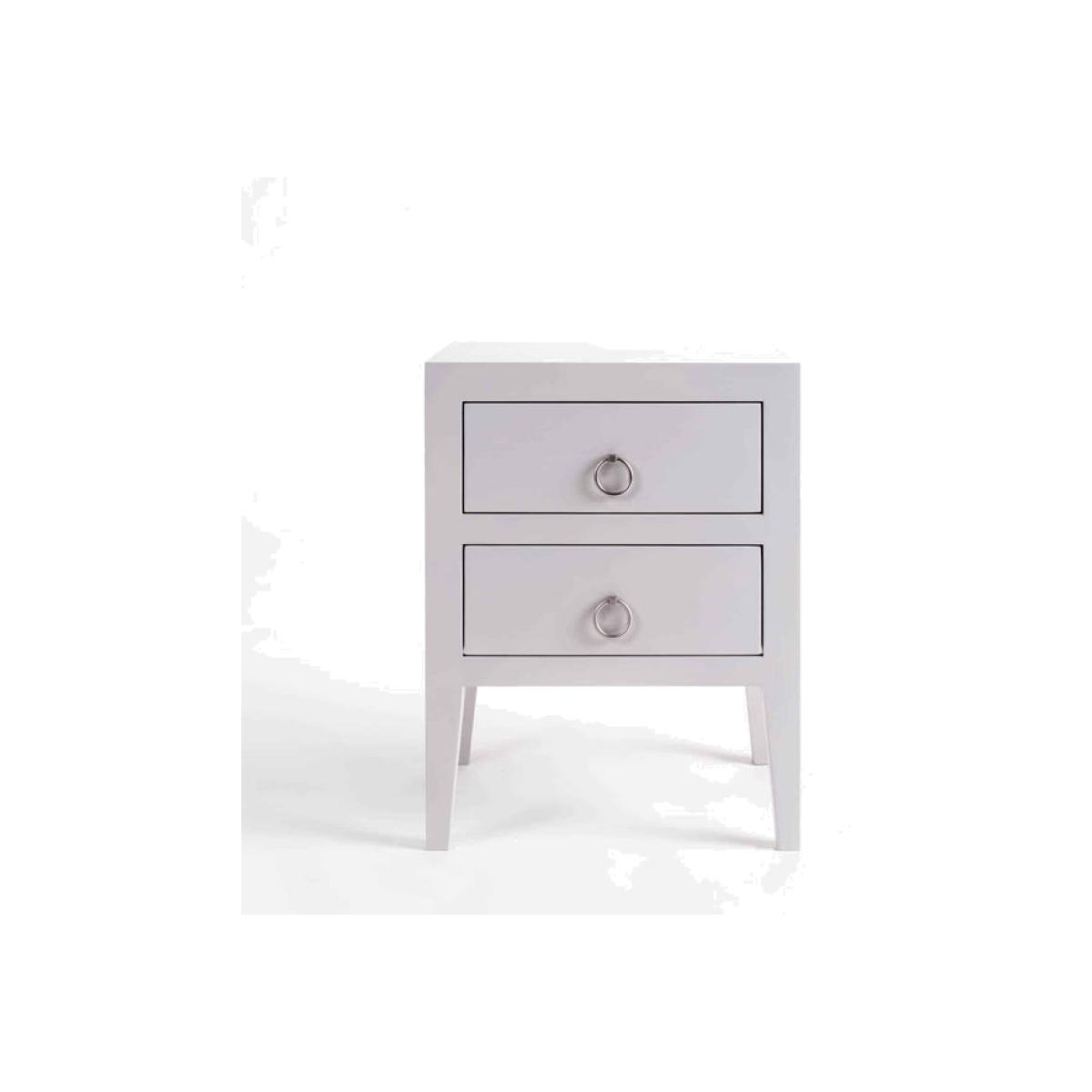 This Cheriton bedside table is a functional and beautiful addition to any bedroom. With two generous drawers on smoothly quiet wooden runners, there is plenty of space to store a wide range of pers. View More. This Cheriton bedside table is a functional and beautiful addition to any bedroom. With two generous drawers on smoothly quiet wooden runners, there is plenty of space to store a wide range of personal items. The drawers also feature attractive, yet durable chrome hoop handles that have a matte finish. Built to last, this bedside table is lovingly constructed from oak veneer and durable solid oak which will yield many years of graceful service. The white finish will add brightness to any bedroom, and the design also highlights the natural wood grain of the oak. The table's legs are tapered for added elegance.