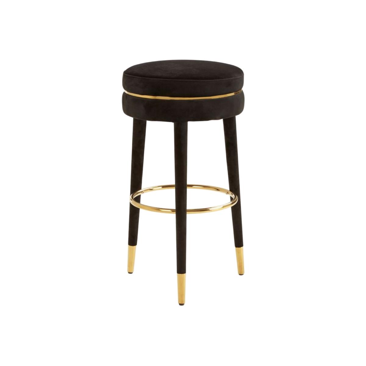 The luxe-style Clara bar stool from Olivia's provides a plush, plump, and pretty place to perch. Finished in contemporary black velvet with gold finished accents this stool is sure to make a statement in any home. Dimensions: H: 79 x W: 46 x D: 46 cm Materials: Rubberwood (Hevea), Stainless Steel, Polyester Velvet Assembly Required: No Care Instructions: Keep dry, Keep away from fire and avoid exposure, Do not bleach, clean with soft clean damp cloth. Capacity: 136kg