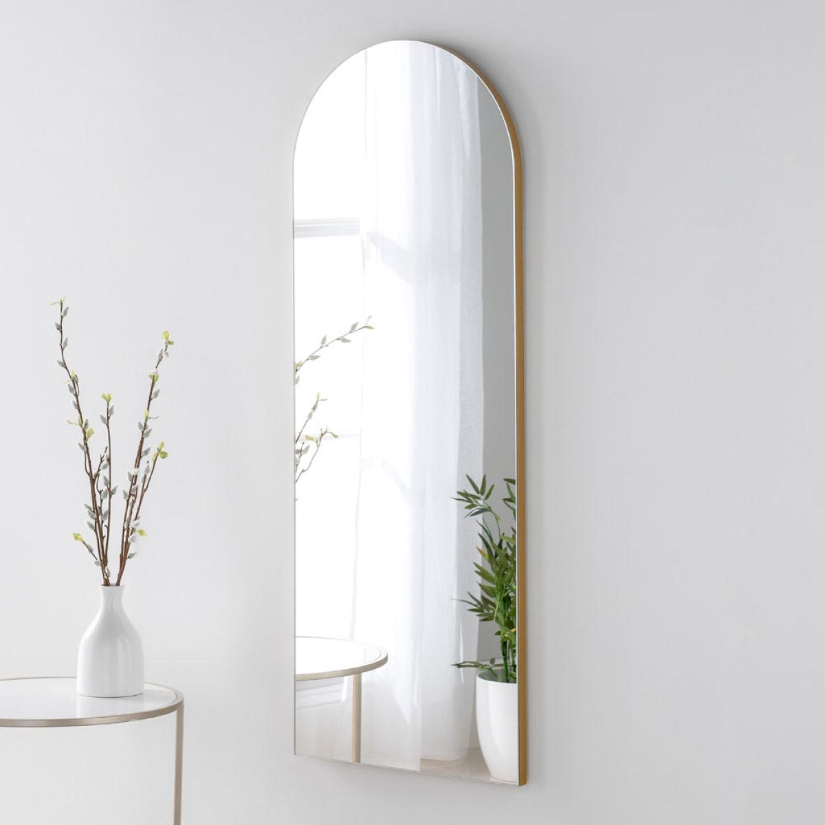 Minimal Arched top Vertical wall mirror. Available in a selection of three frame colour finishes to best suit your interior. The craftsmanship is clear to see with it's simple and sophisticated quality of finish. Only the finest quality raw materials have been used to construct this beautifully delicate looking wall mirror. It's simple design allows this mirror to be extremely versatile and would work in most room settings with a mix of different interior styles. Enhancing the interior to give a light and airy feel is what this mirror does best. Add a touch of the light and airy feel with this ultra stylish minimalistic wall mirror. Dimensions: H: 120 x W: 45 x D: 2 cm Materials: Wood/MDF/Glass. Orientation: Portrait. Fixing Type: Care Instructions:Wipe mirror glass clean with damp non-abrasive cloth. Wipe frame clean with no abrasive dry cloth