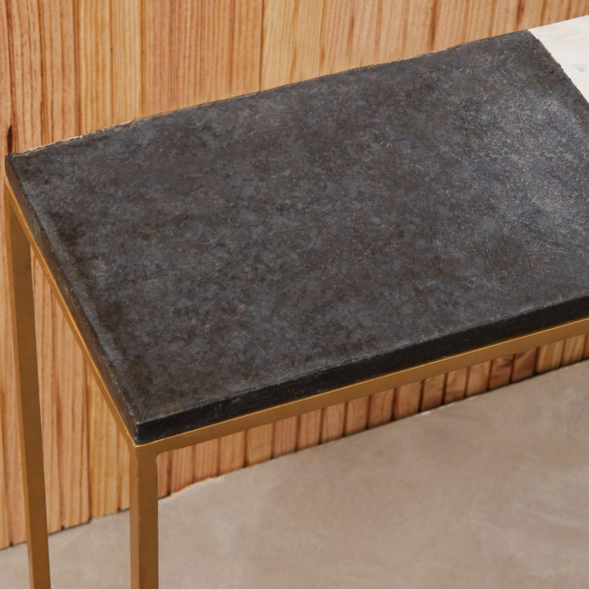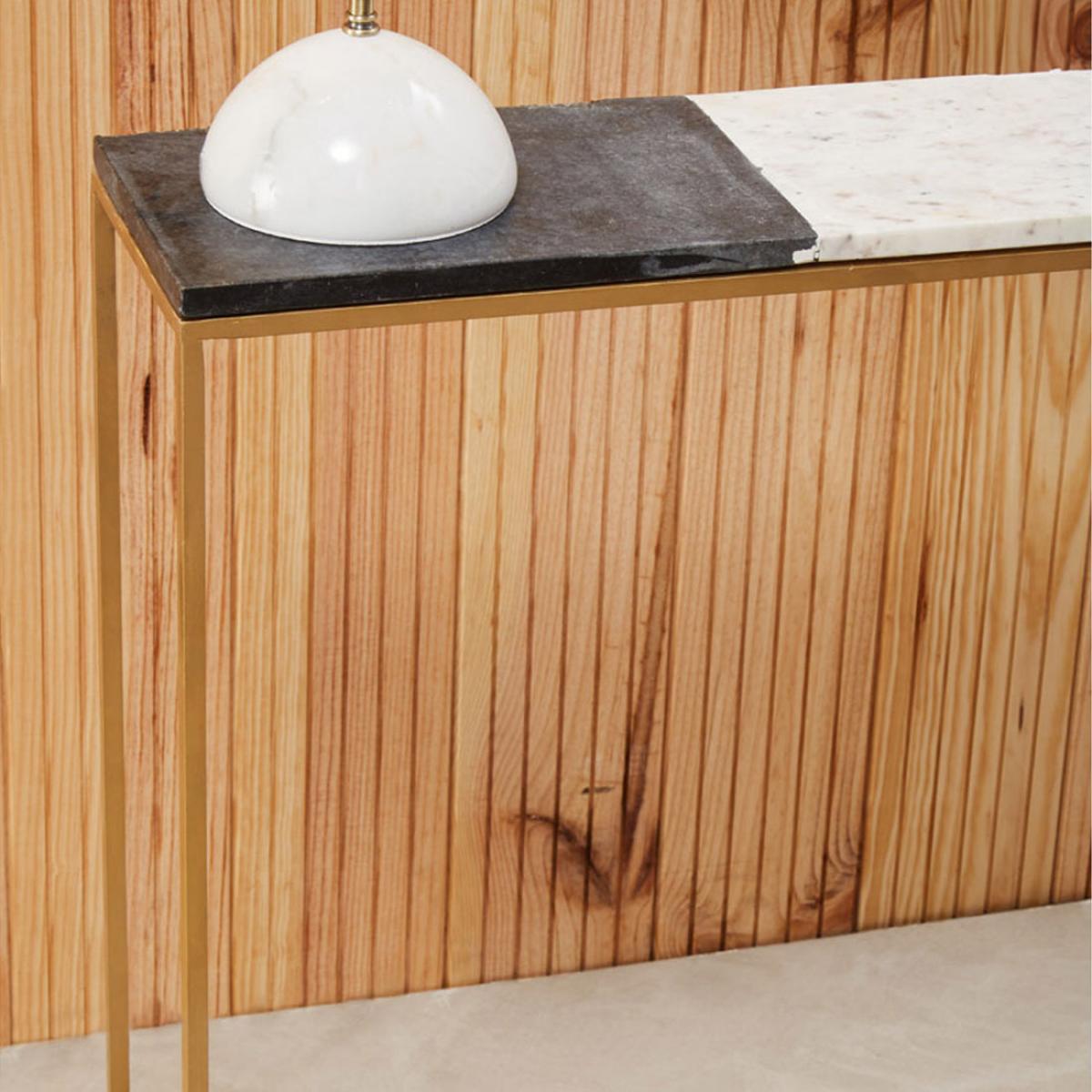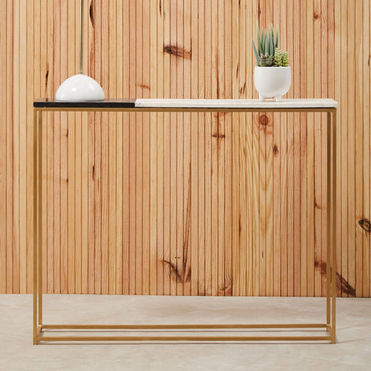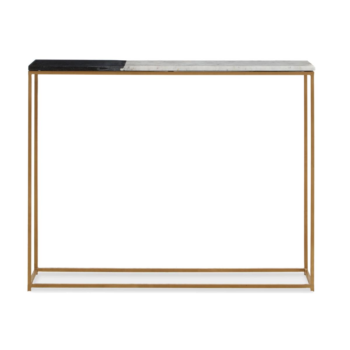 This console table creates a modern look with its streamlined metal frame in black and luxe gold finish. Made from black and white marble, the rectangular top coordinates with the minmalist open ba. View More. This console table creates a modern look with its streamlined metal frame in black and luxe gold finish. Made from black and white marble, the rectangular top coordinates with the minmalist open base and furthers the sleek sophistication.
