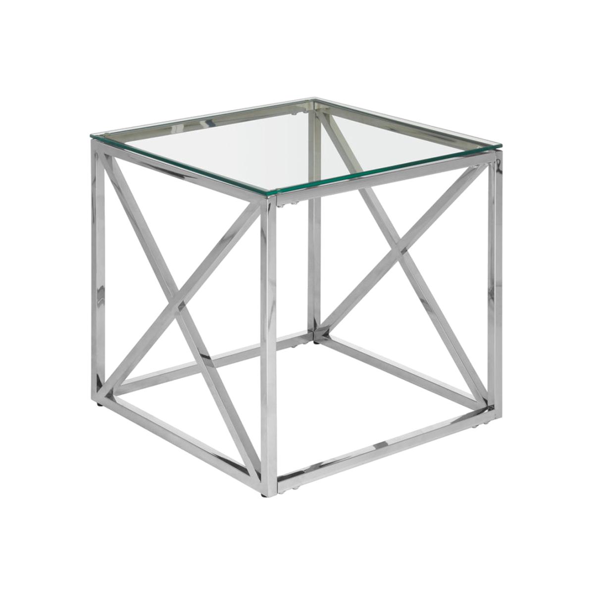A sleekly contemporary combination of glass and silvery chrome, Olivia's Cross Side Table is a versatile and glamorous piece of furniture which will complement a range of decors with its timeless a. View More. A sleekly contemporary combination of glass and silvery chrome, Olivia's Cross Side Table is a versatile and glamorous piece of furniture which will complement a range of decors with its timeless appeal. Beautifully designed, the airy configuration of this table is perfect for compact rooms which will be brightened by its light-reflecting surfaces. Whether as an enduring support for lamps, vases of flowers or collectibles, this side table will be a stunning accent in any room of your home. Finished to the highest standards, the table will look classy next to a sofa, and a pair of them could look elegant as bedside tables.