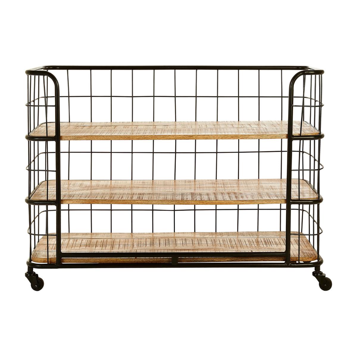 Its three shelves are made from renewable mango wood and offer an earthy contrast to the black iron wire structure that wraps around them. The shelves have a four panel configuration and have a golden colour and rich grain. Braked castor wheels at the base further contribute to its factory floor aesthetic. Dimensions: H: 91 x W: 45 x D: 120 cm Materials: Iron, Wood Assembly Required: No Care Instructions: Please note, This product composition contains natural wood, variations in colour may apply.