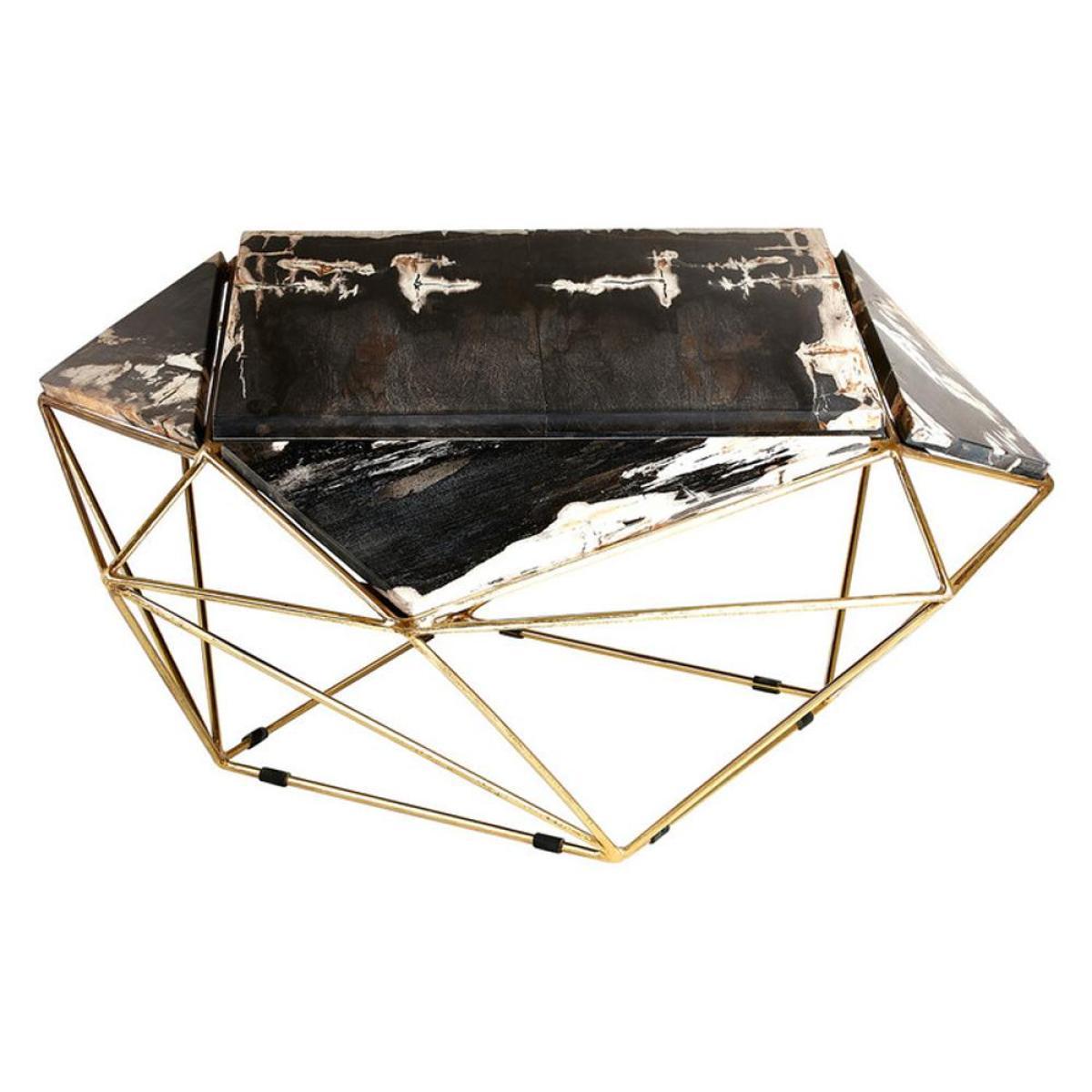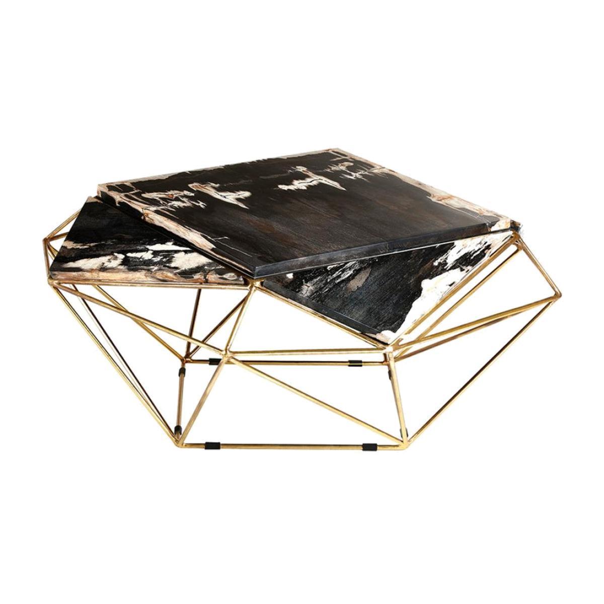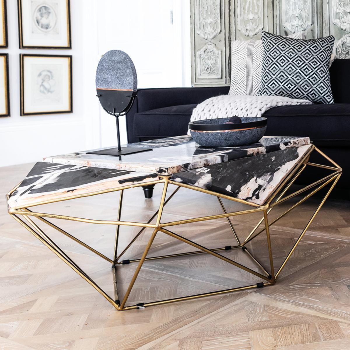 This striking geometric base coffee table from renowned brand, Olivia's is created from dark petrified wood, and it can be staged as a centrepiece in your contemporary living space. Eye-catching and bold with the dark petrified wood and the delightful brass finish iron base, this table is both functional and aesthetically pleasing. Stage a floral display and magazines, or use it when friends and family visit for afternoon tea or evening cocktails. It will immediately create a striking living area, and it will blend in with modern furnishings. Adaptable to any colour of décor, it measures H: 42 x W: 95 x D: 95 cm. *Moot Trading Ltd is not a lender and acts only as an introducer. The credit product is provided by Klarna Bank AB (publ). Credit is only available to permanent UK residents aged 18 and over, subject to status. Terms and conditions apply. Please note that the following products are not regulated by the FCA: Pay in 30 days and Pay in 3 instalments. Read More.