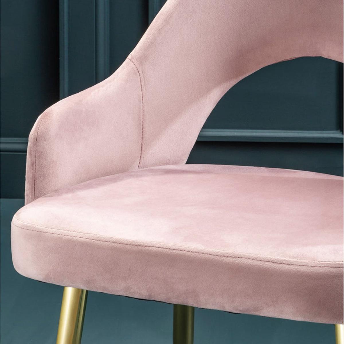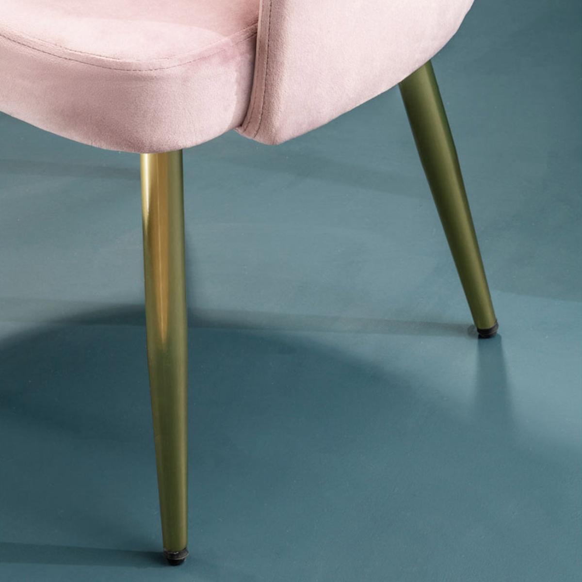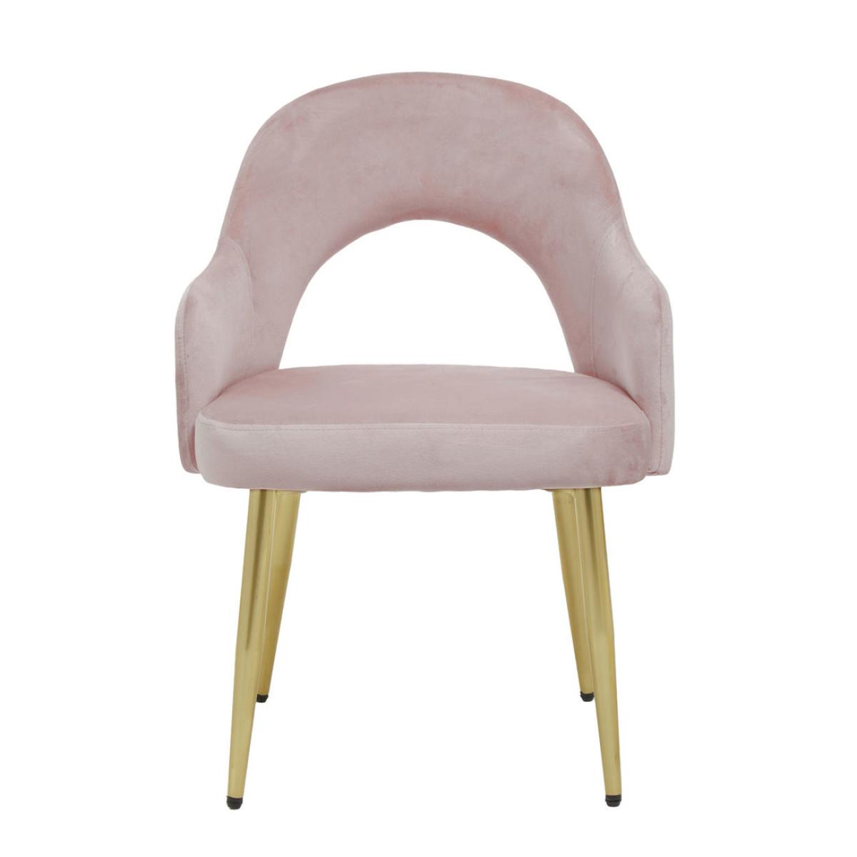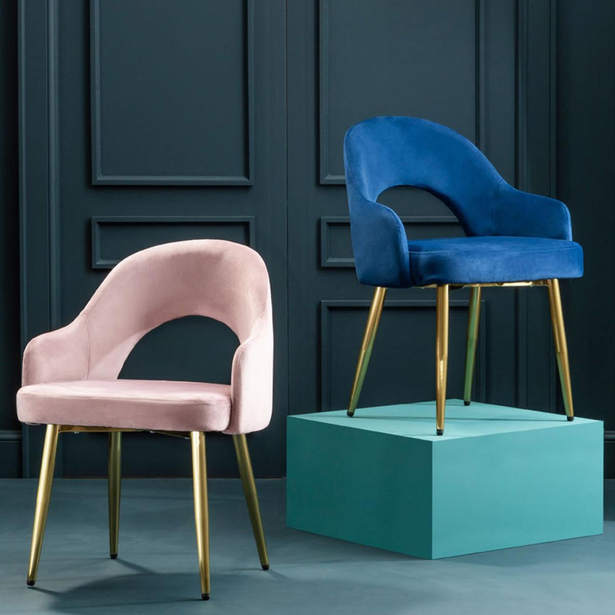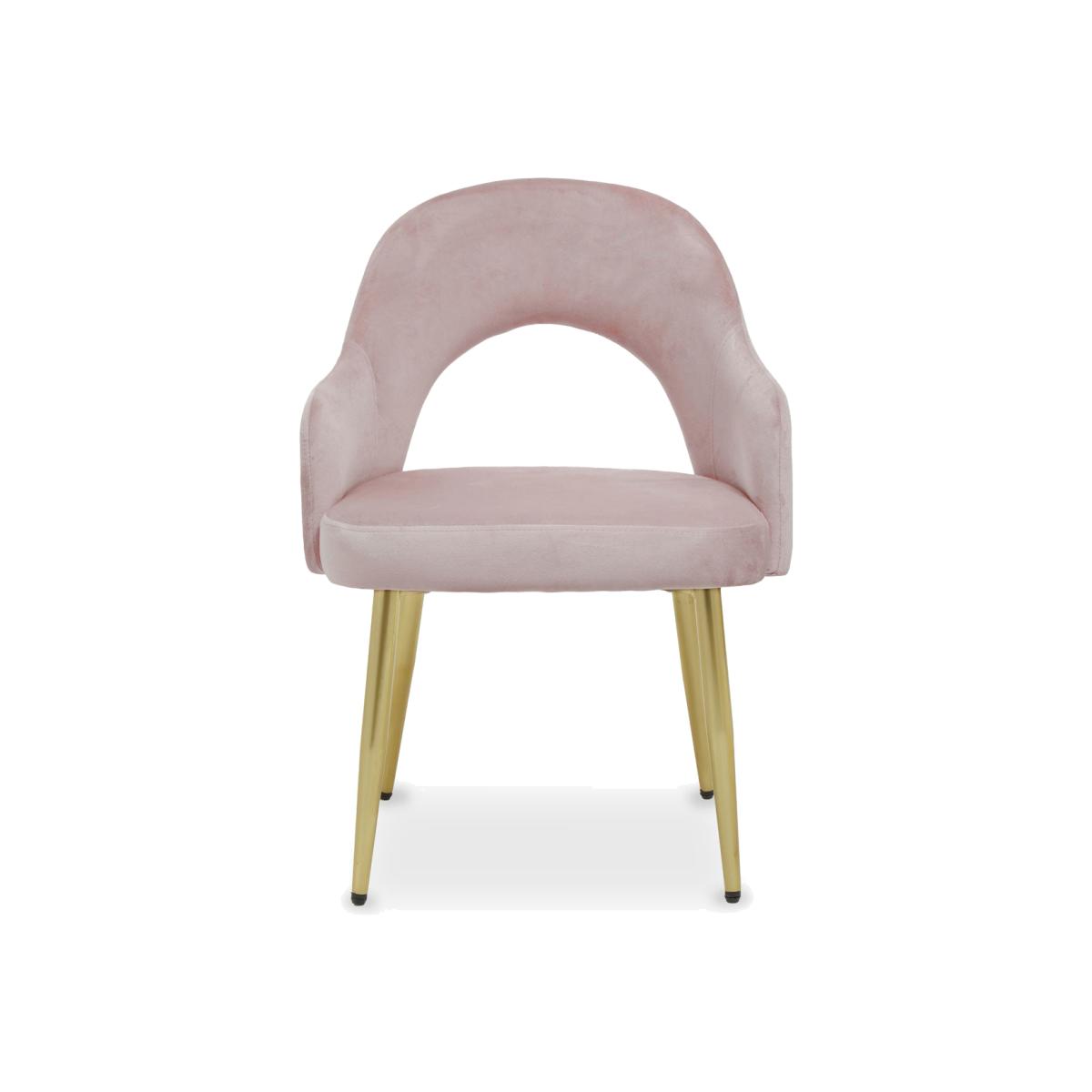 This dusky pink velvet dining chair has foam filled open back that curves to form raised arms, matched with the padded seat. The upholstery blends with luxe brushed gold angular legs which enhance. View More. This dusky pink velvet dining chair has foam filled open back that curves to form raised arms, matched with the padded seat. The upholstery blends with luxe brushed gold angular legs which enhance the mid-century aesthetic.