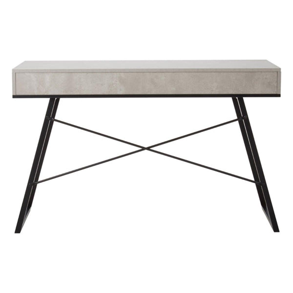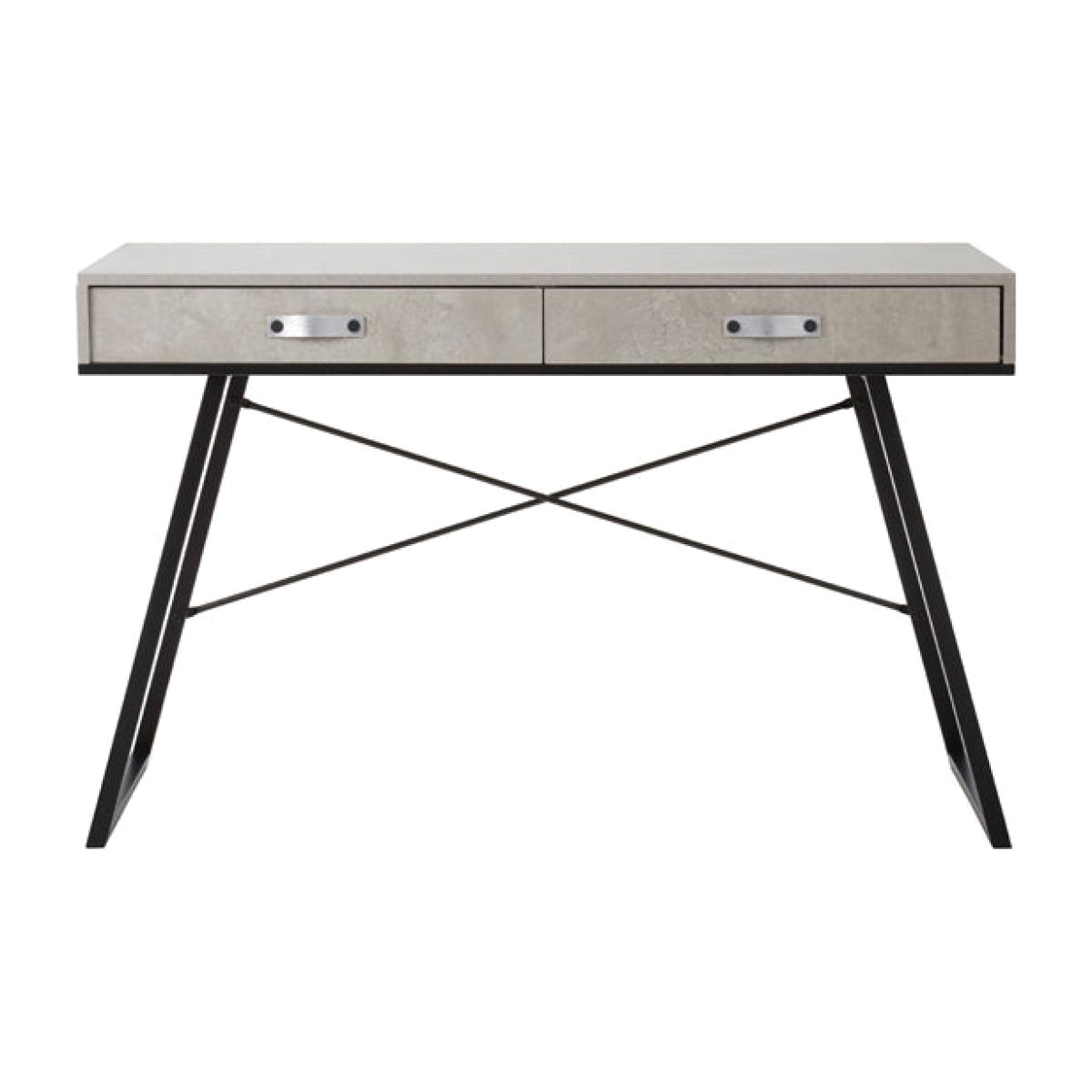 This desk brings efficiency and organisation to the home office. The rectangular top of this desk has a concrete veneering effect which articulates its subtle industrial appeal. A cross pattern structure adds stability to the metal frame of the desk. Artisan assembled, the Bradbury desk is equipped with a discreet storage solution to keep the workspace clutter-free.