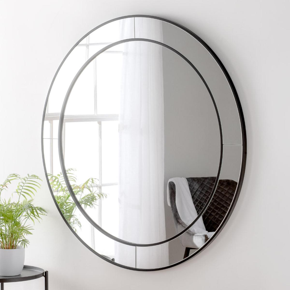 Contemporary Round statement mirror with sectional boarders sunk into a wooden frame. Constructed from high quality raw materials here in the UK. Finished in a sumptuous black leaf frame which has a stunning profile on the inner and outer of the mirror. Beautifully crisp high quality reflective mirror that has wall mounting hardware attached to the back ready for hanging. The frame itself has a solid wooden backing. Dimensions: H: 120 x W: 120 x D: 2 cm Materials: Wood/MDF/Glass. Orientation: Portrait. Fixing Type: Care Instructions:Wipe mirror glass clean with damp non-abrasive cloth. Wipe frame clean with no abrasive dry cloth