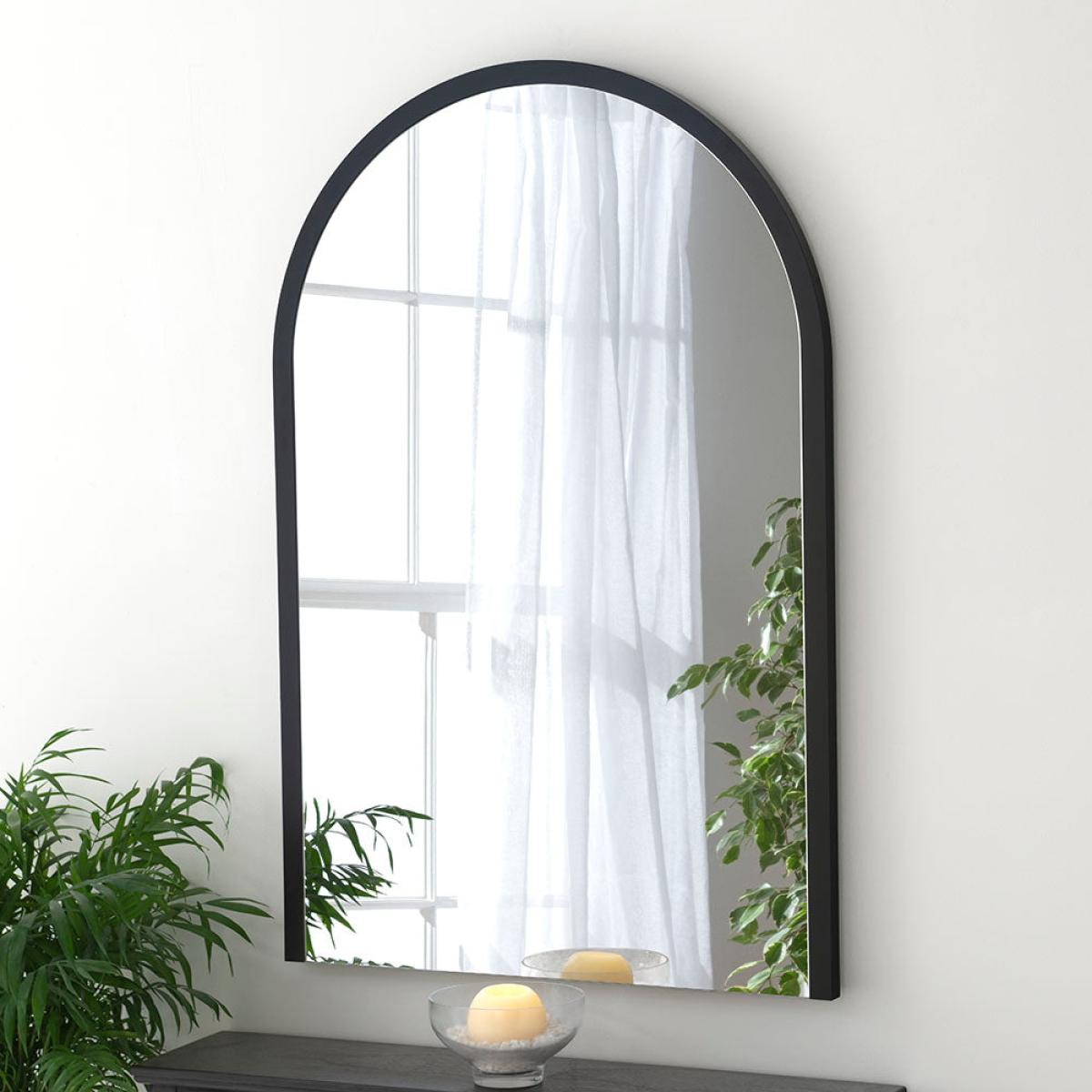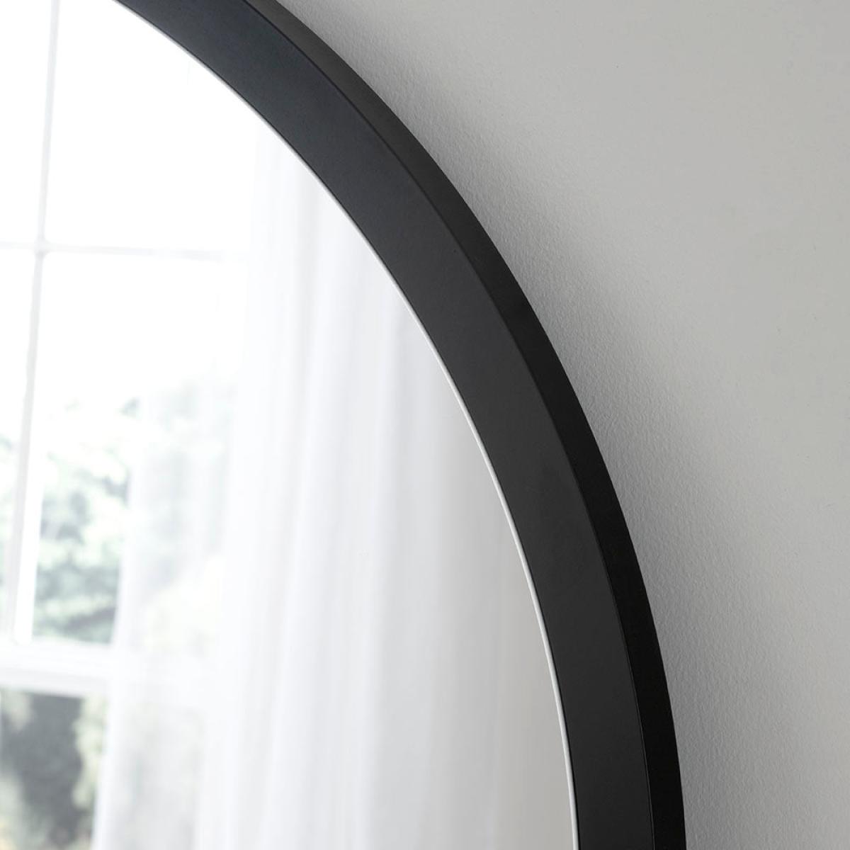 Olivia's Ember Arch Wall Mirror in Black is a captivating fusion of distinctive design and masterful craftsmanship. This unique arch-shaped wall mirror boasts a seamless, endless finish that draws the eye and adds an element of sophistication to any space. The wooden frame, beautifully finished in a sumptuous black, elegantly emphasizes the mirror's graceful curvature. Its design extends straight to the bottom, providing a sleek and continuous look. For convenience and versatility in installation, the mirror is equipped with hanging hooks on the back, one on each side, facilitating easy wall mounting. Each piece is handcrafted in the UK by skilled artisans, ensuring that Olivia's Ember Arch Wall Mirror is not only a functional item for everyday use but also a work of art, reflecting unparalleled craftsmanship and contemporary elegance. Additional Information
