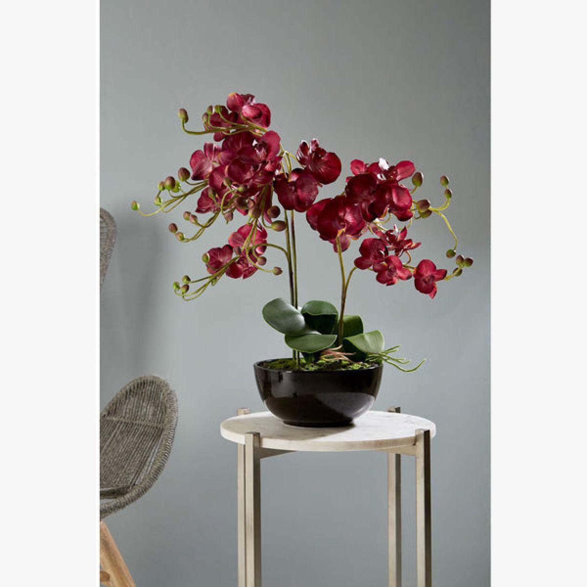This faux botanical is a highly realistic representation of the exotic orchid, a flower traditionally associated with love and luxury. It stands in a round bowl made from smooth ceramic, with a black finish that accentuates the verdant greens and rich purple tones of the plant. Embrace the green trend and use it to add a lush accent to a room setting. Dimensions:W:40 x D:50 x H:85 cm