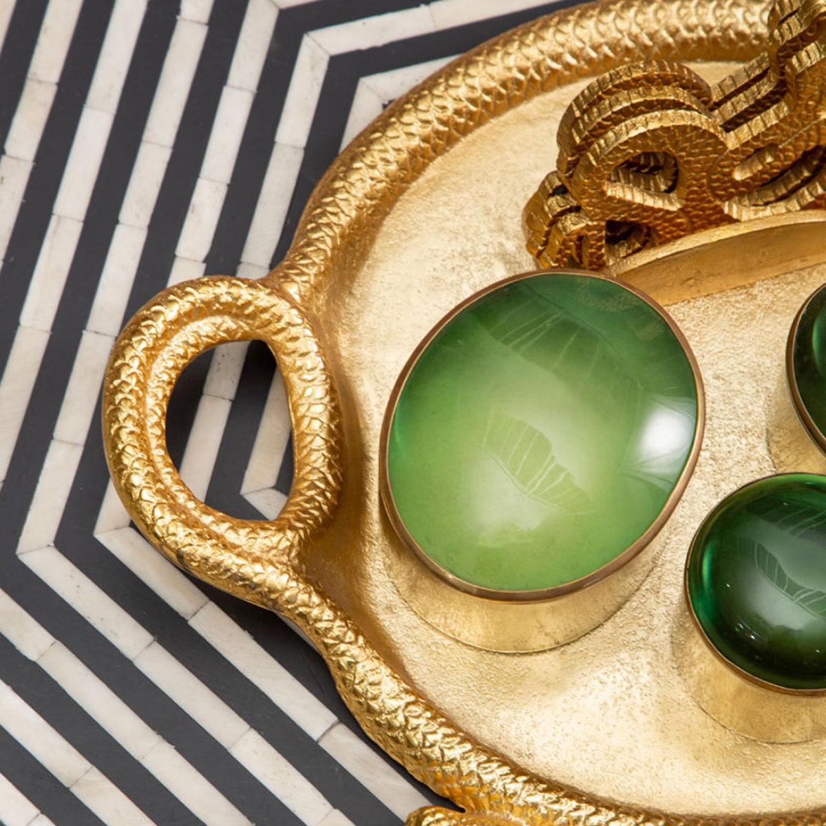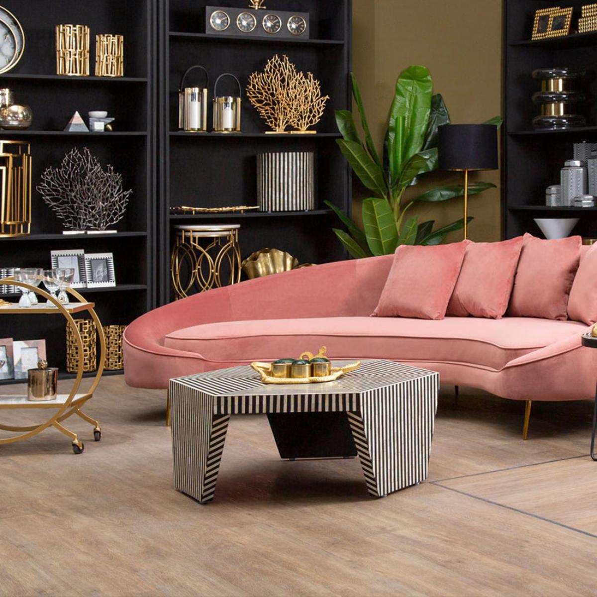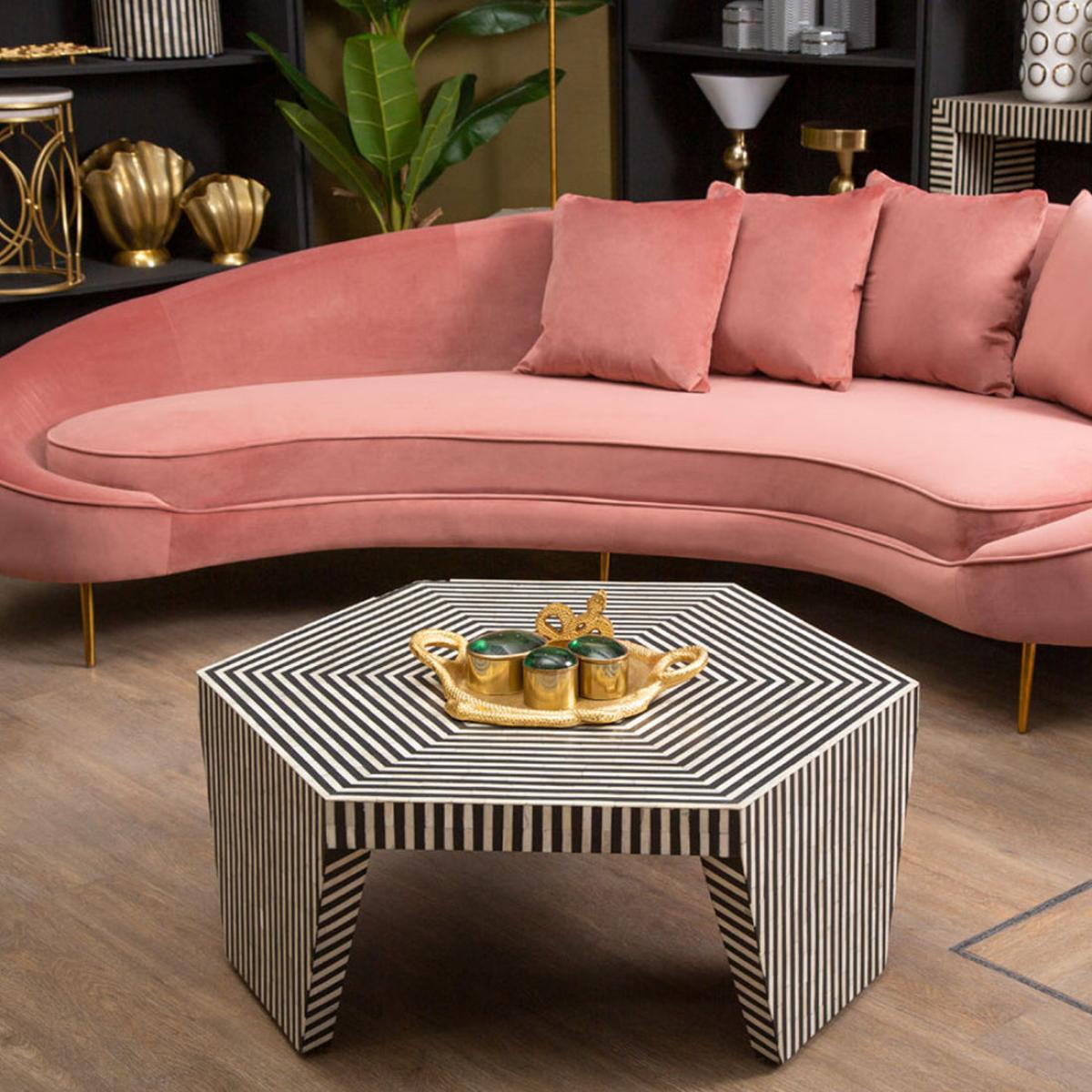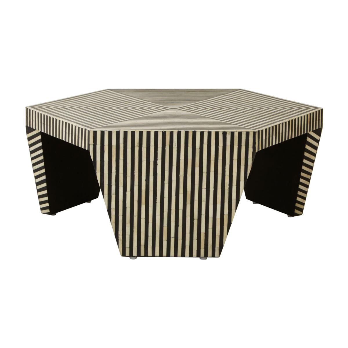This coffee table has a hexagonal top adorned with carved bone inlay detailing and black MDF, forming a hypnotic pattern. The geometric top is supported with tapered legs in matching vertical strip. View More. This coffee table has a hexagonal top adorned with carved bone inlay detailing and black MDF, forming a hypnotic pattern. The geometric top is supported with tapered legs in matching vertical stripes adding a slight variation to the table’s design aesthetic.