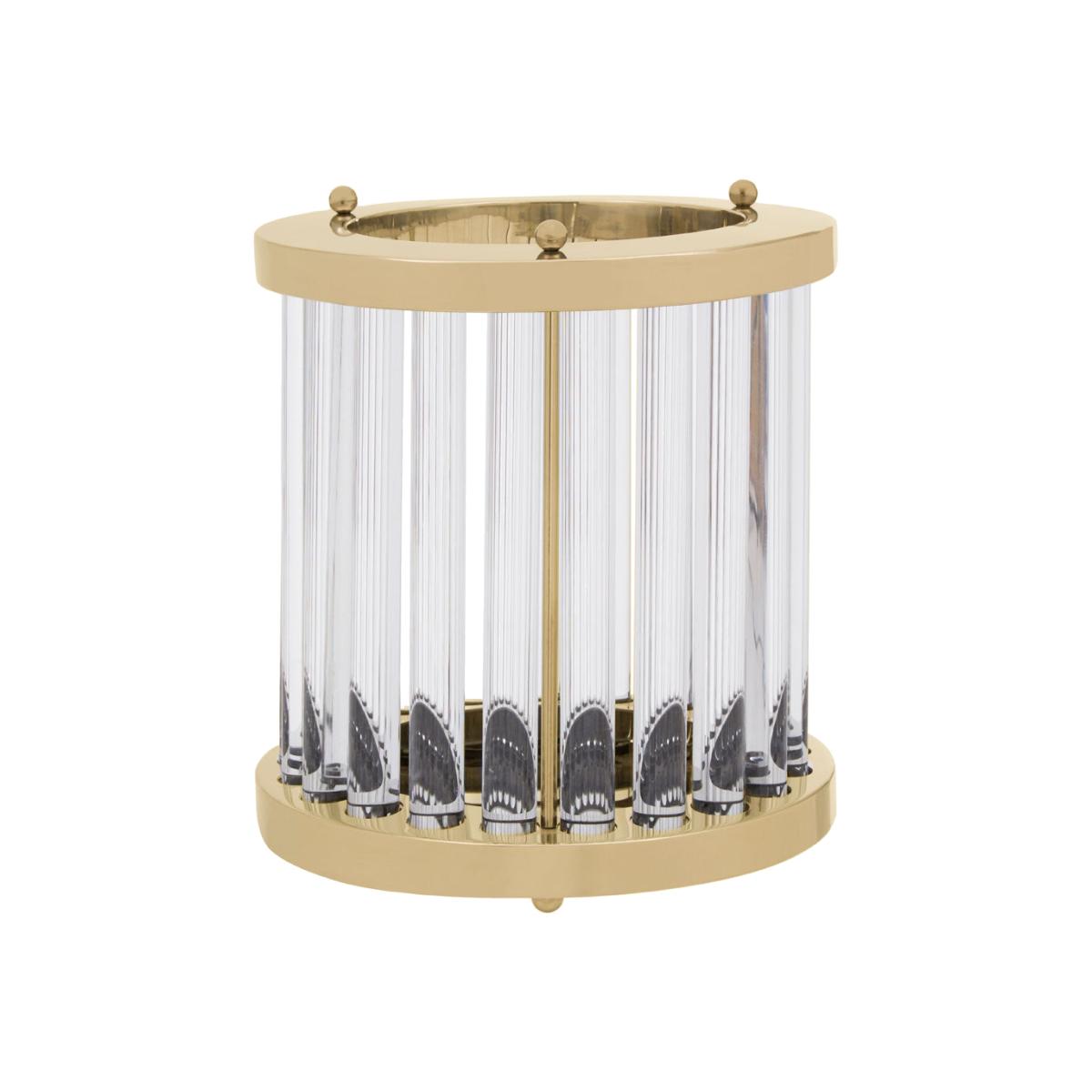 This small candle holder has a rounded design featuring a series of fluted glass that refracts light and provides a warm glow. The symmetrical construction of glass tubes is securely held by gold f. View More. This small candle holder has a rounded design featuring a series of fluted glass that refracts light and provides a warm glow. The symmetrical construction of glass tubes is securely held by gold finish stainless steel rings on the top and bottom.