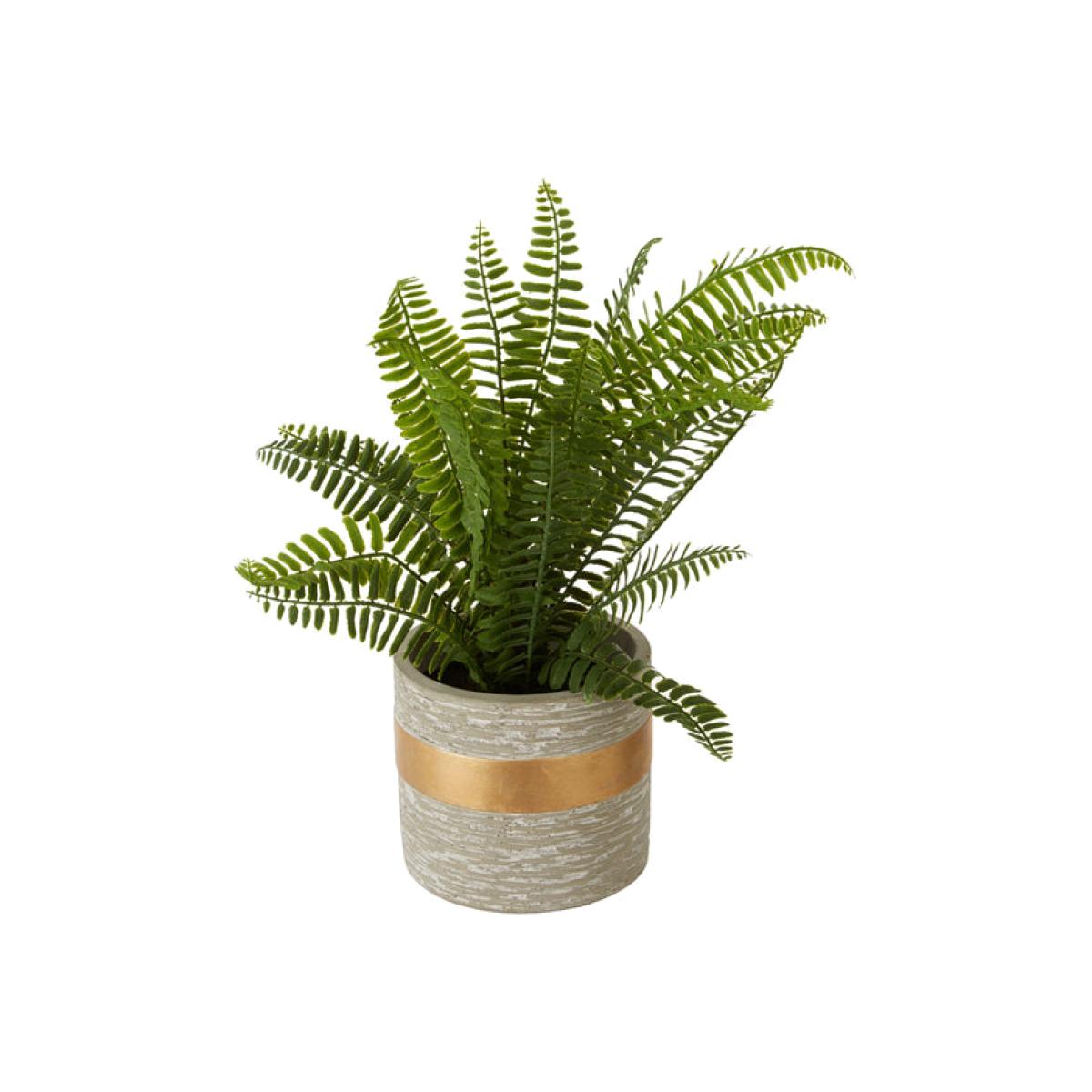 This boston fiori fern gives relevance close to a real plant with its delicately designed lush green leaves which stand upright and spread outward. The plant is nestled inside the cement planter with minimal texture and gold finish decorative band in its centre.
