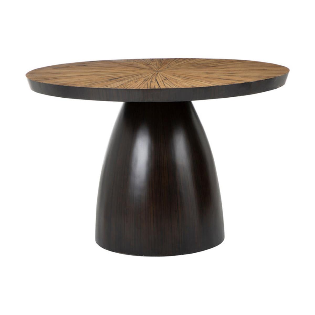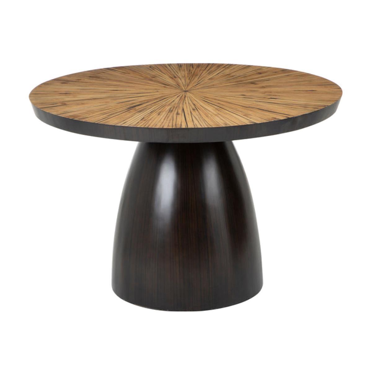 Dine in style whilst seated at the Gabe Dining Table from the Olivia's collection. The gorgeous circular table top is bedecked with a stunning bamboo pattern radiating out from its centre, whilst t. View More. Dine in style whilst seated at the Gabe Dining Table from the Olivia's collection. The gorgeous circular table top is bedecked with a stunning bamboo pattern radiating out from its centre, whilst the sturdy rounded base sits comfortably underneath. The warm ebony and natural tones of the wood bring a sensation of natural peace whilst tying in with a wide range of design and colour schemes and will look amazing when laid with your favourite tableware. Measuring 75cm in height, 120cm in width and 120cm in depth, the Gabe Dining Table is perfectly proportioned to make an extremely special and attractive addition to any dining space.