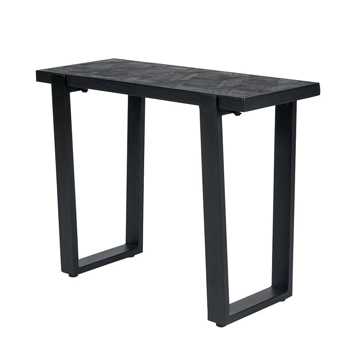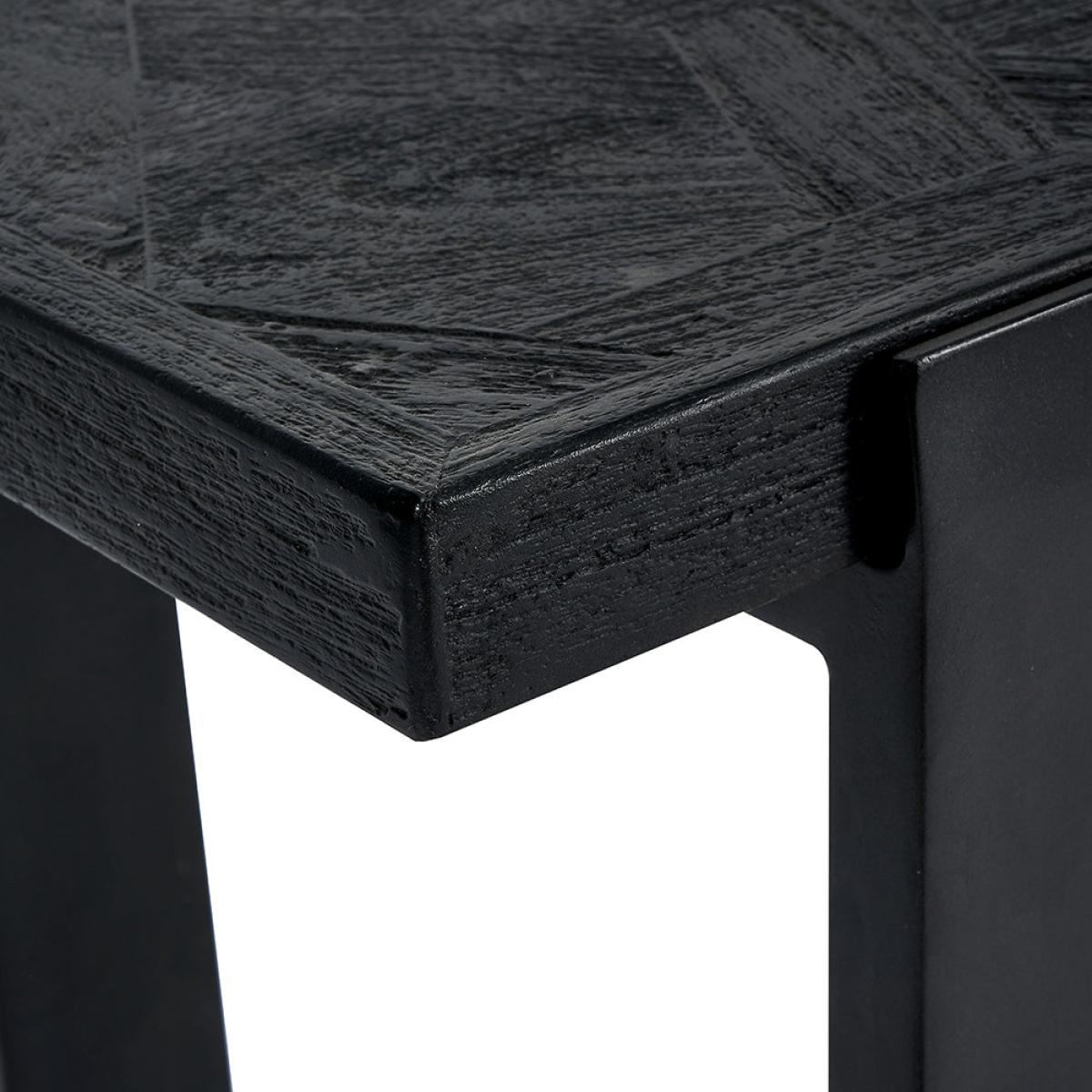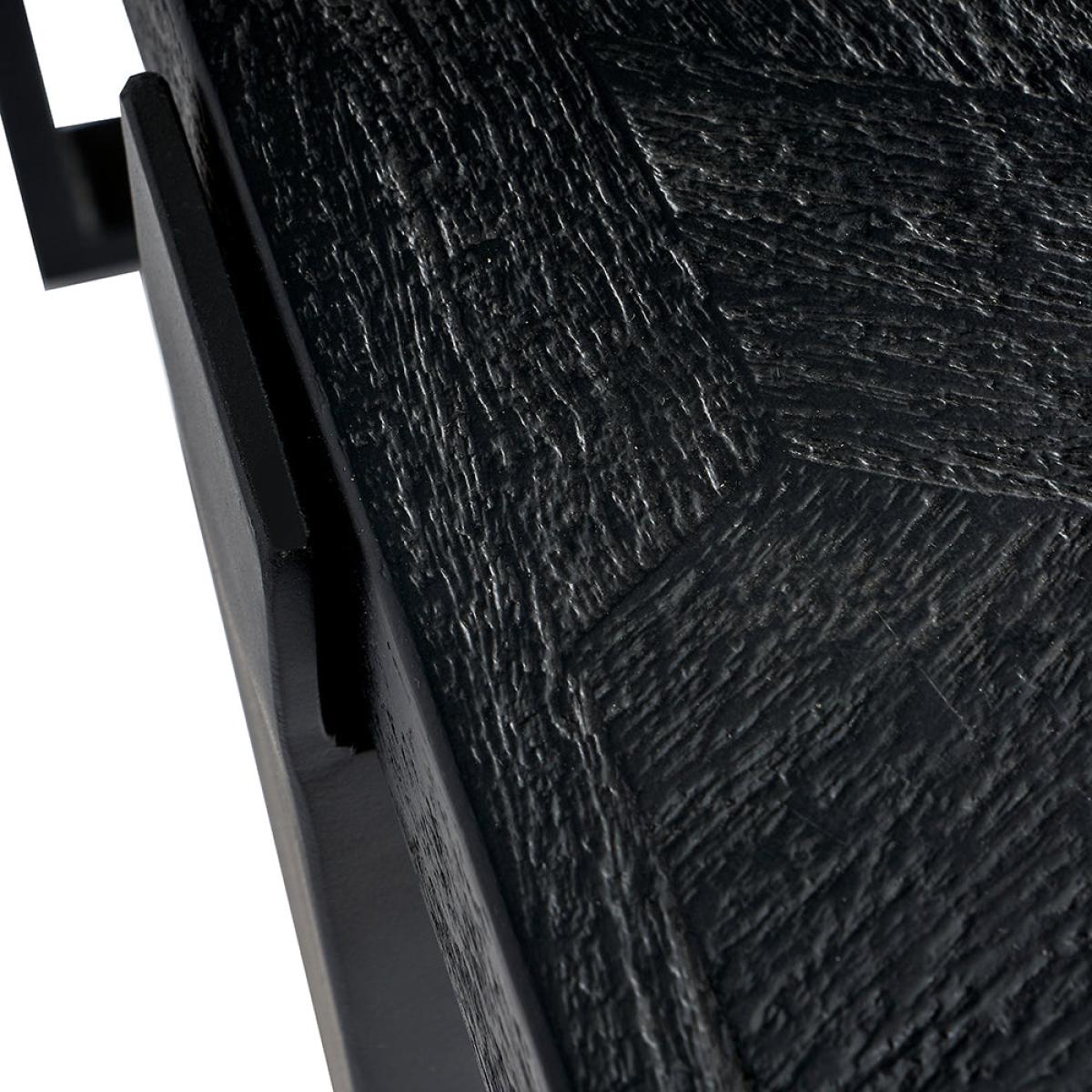 This sophisticated matt black mango wood and black metal console table will instantly create a focal point within your room. The beautifully crafted inlaid top has a geometric design that produces a tactility and texture to this otherwise sleek design. Matching dining table available.