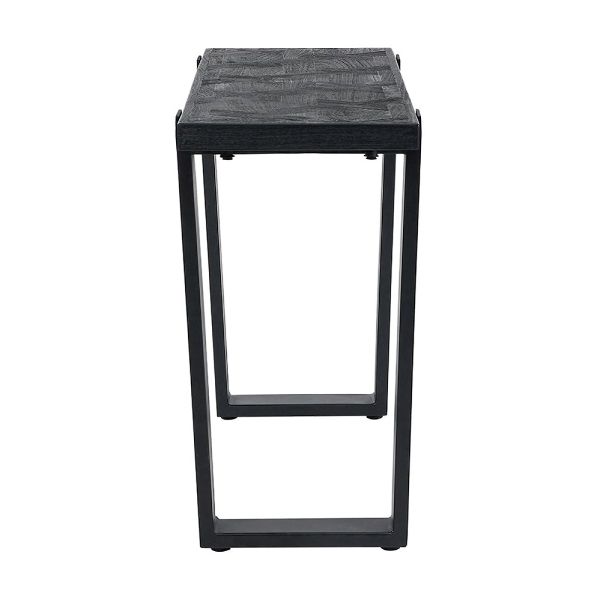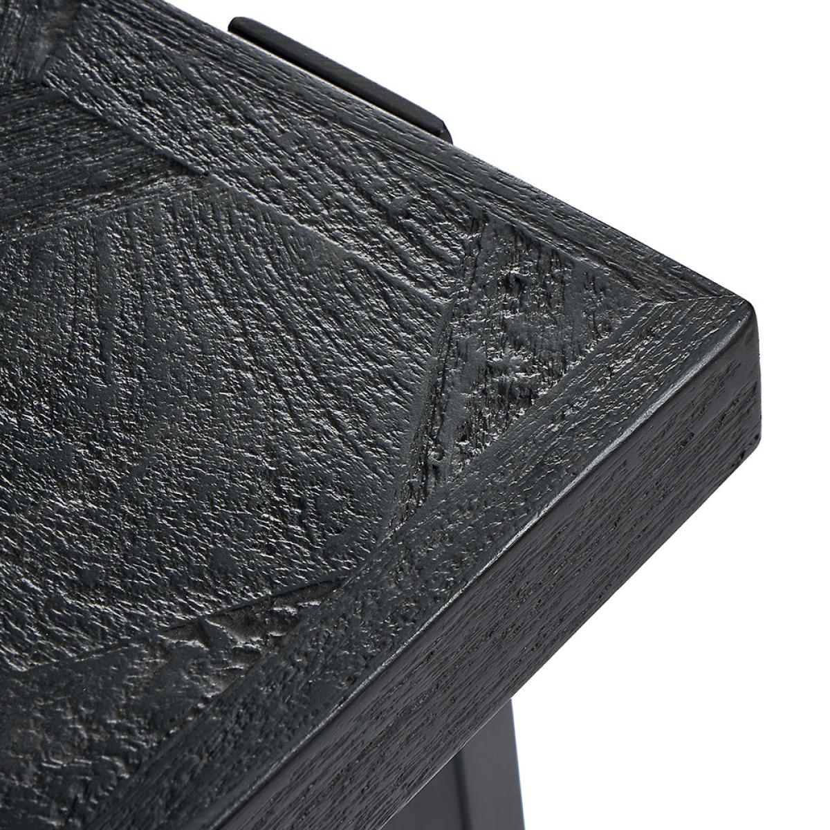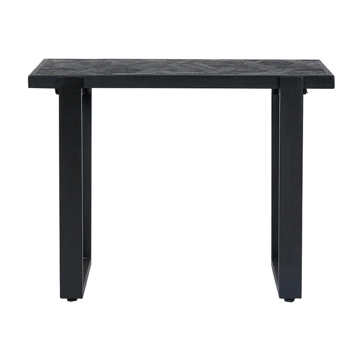 This sophisticated matt black mango wood and black metal console table will instantly create a focal point within your room. The beautifully crafted inlaid top has a geometric design that produces a tactility and texture to this otherwise sleek design. Matching dining table available.