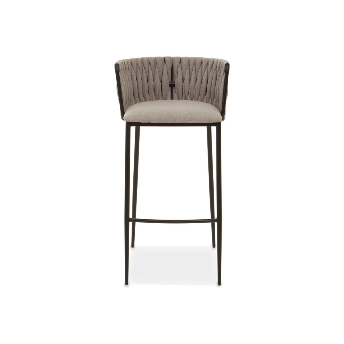 This bar chair has a padded seat upholstered in muted grey fabric. The sumptuous seat matches a curved backrest in a seamless woven pattern. Sleek black finish legs are angled to create mid-century styling. Dimensions: H: 96 x W: 50 x D: 55 cm. Seat Height: 73cm Materials: Metal, Textile, Wood Assembly Required: No Care Instructions: Keep Dry And Clean. Please note, This product composition contains natural wood, variations in colour may apply.