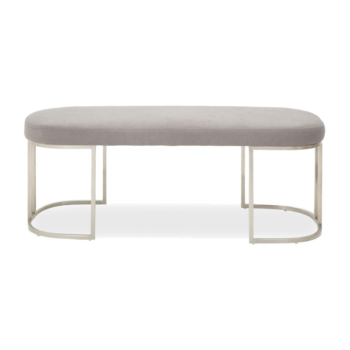 This bench boasts grey fabric upholstery enhanced with high density sumptuous padding. The rectangular seat has gentle curves that coincide with C shaped sides in the brushed silver finish. Dimensio. View More. This bench boasts grey fabric upholstery enhanced with high density sumptuous padding. The rectangular seat has gentle curves that coincide with C shaped sides in the brushed silver finish.