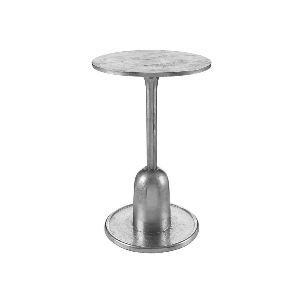 The table is made from strong aluminium and complements metallic table lamps and ornaments thanks to its silver finish. Its round base matches the top but the table achieves an asymmetrical look th. View More. The table is made from strong aluminium and complements metallic table lamps and ornaments thanks to its silver finish. Its round base matches the top but the table achieves an asymmetrical look thanks to the rounded mount that supports the tubular stand. Each unit is crafted by hand, meaning that it displays its own unique variations. *This item is handcrafted so please expect slight variations to the finish*.
