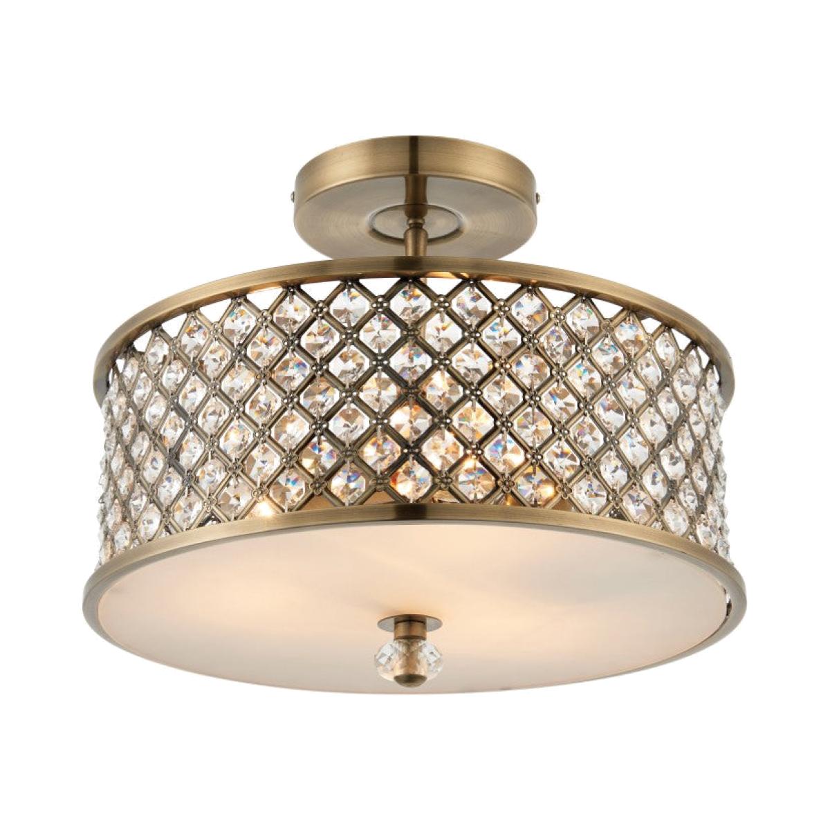 The Olivia's Hudson ceiling lamp is a stylish and sophisticated way to light up your living space. The lamp is available finished in either antique brass or sleek, modern chrome, but whichever version you choose you're guaranteed an elegant piece that will make any setting look that bit more luxurious. The geometric patterning on the shade features crystalline embellishments and is distinctly palatial. A single crystal finishes the bottom of the lamp, and the piece is ringed with smoothly contoured high shine brass or chrome, which complements the intricate shade beautifully. This piece is 40.5cm wide, 34 cm high and 40.5cm deep. Dimensions:W:40.5 x D:40.5 x H:34 cm Bulb Type: 3 x 60W E27 GLS (Dimmable) - not included Materials: Crystal glass, Steel