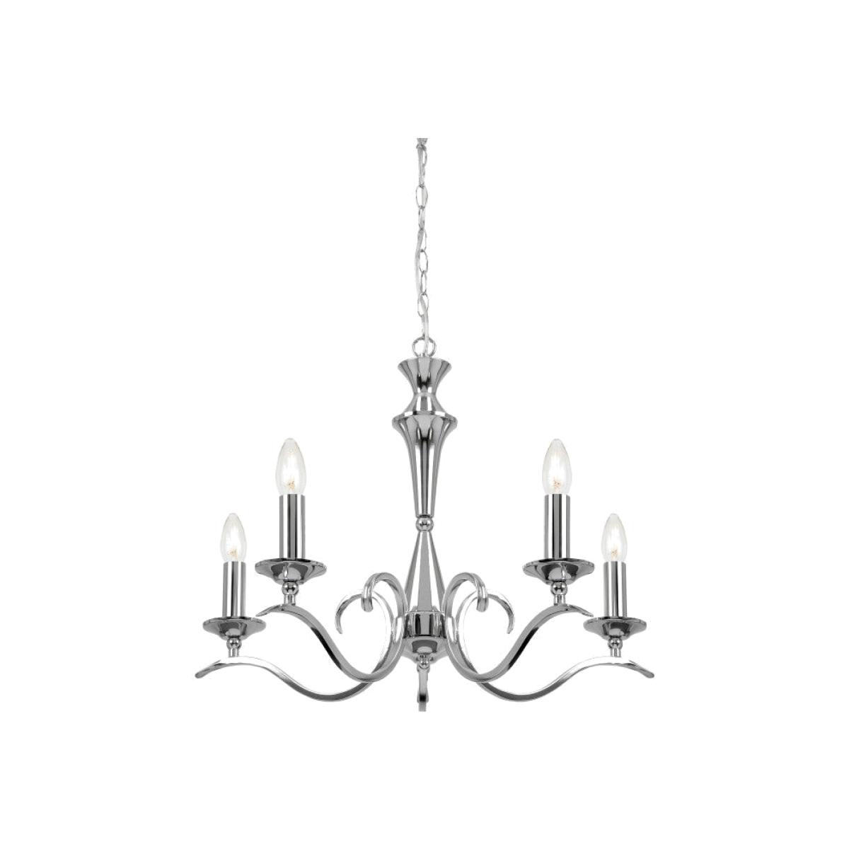 This amazing pendant light blends the perfect combination of modern industrial feel with olde world charm. It has been created using an ornate centre piece from which four separate candles are attached, which angle the available light in different directions, lighting up dark corners and making the room come to life wonderfully. The style of the piece certainly makes it look traditional and charming. However, as this is fashioned from bright silver chrome, it adds a modern, industrial twist to the traditional design. This piece can be used to create an interesting contrast in either a modern or traditional space. Dimensions: W:61 x D:61 x H108.5 cm Bulb Type: 5 x 40W E14 candle (Dimmable) - not included. Cable Length: 5cm. Material: Steel