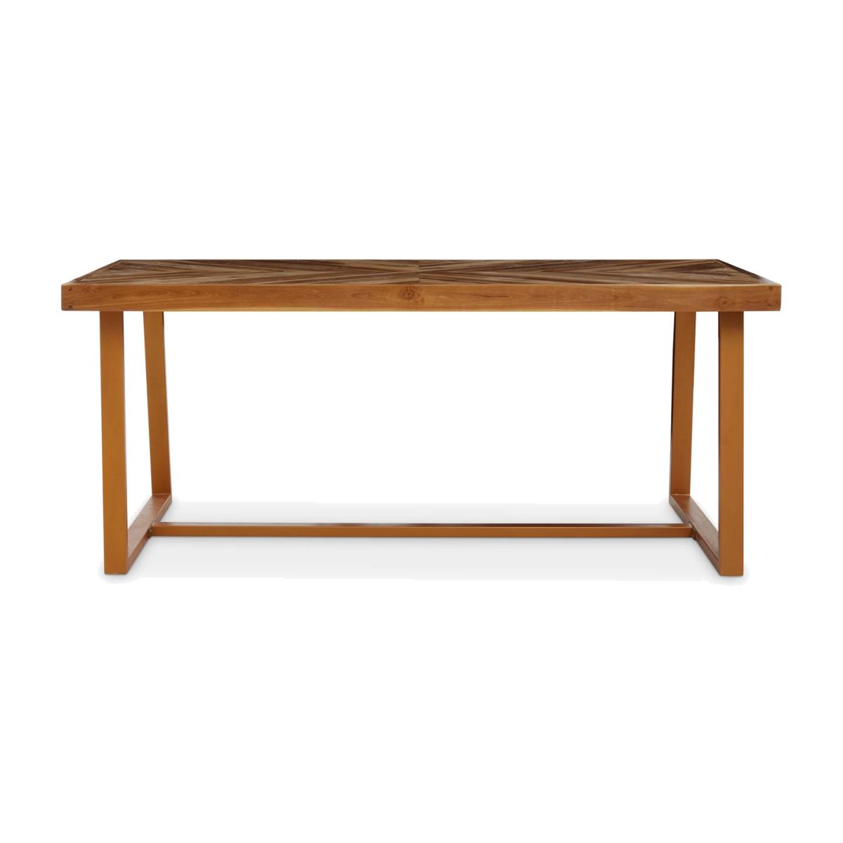 The rectangular top of this dining table is handcrafted expertly from individual slats of natural teak wood, forming a herringbone pattern. The richly textured top of this table is perched upon a g. View More. The rectangular top of this dining table is handcrafted expertly from individual slats of natural teak wood, forming a herringbone pattern. The richly textured top of this table is perched upon a gold finish angular metal frame to add style with stability.