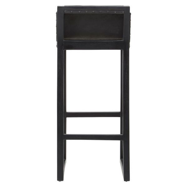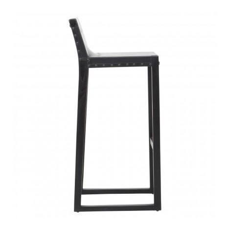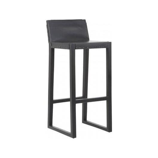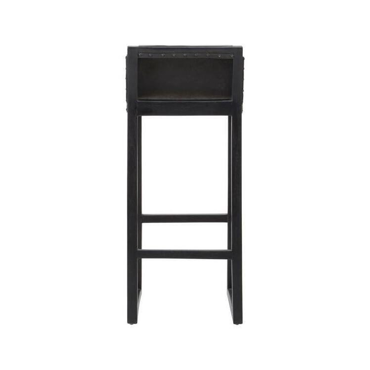 Its sleek black palette gives the Kendall bar stool a contemporary, brooding character. The black leather which is used to dress the seat and backrest is trimmed with matching metallic studs. Its tall legs are crafted from sustainable teak wood, have a matching black finish, and feature a footrest for added comfort.