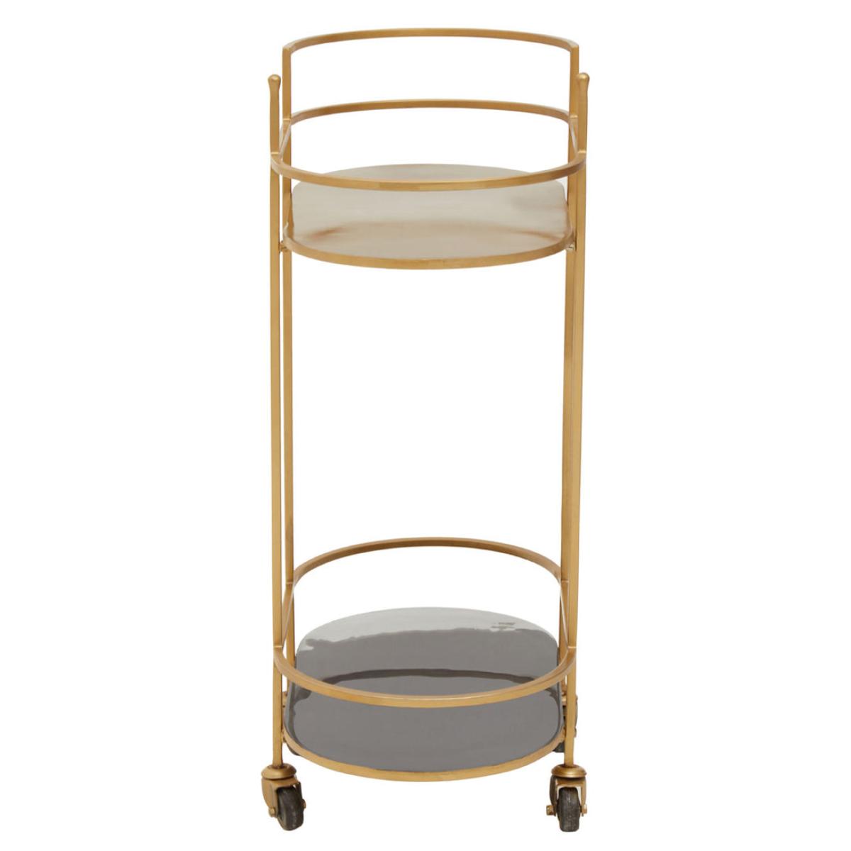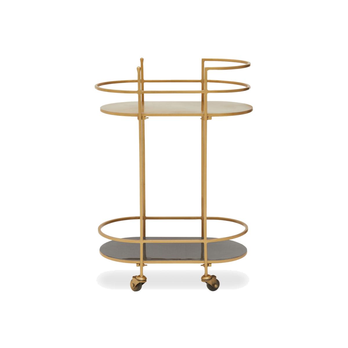 The matte gold finish of the Korba trolley creates a chic statement to the living area. This trolley boasts a clean line slender metal frame supported by castors, and the storage shelves in a grey enamel coating are ideal for serving and organising. Dimensions: H: 83 x W: 58 x D: 33 cm Materials: Metal Assembly Required:Yes Care Instructions:Wipe with a soft and dry cloth. Do not use abrasive cleaners