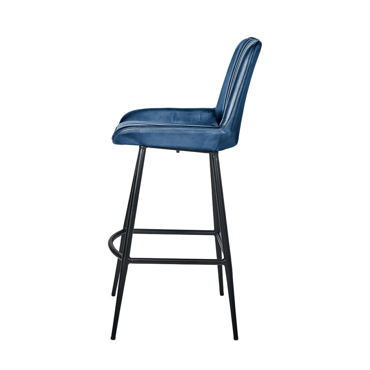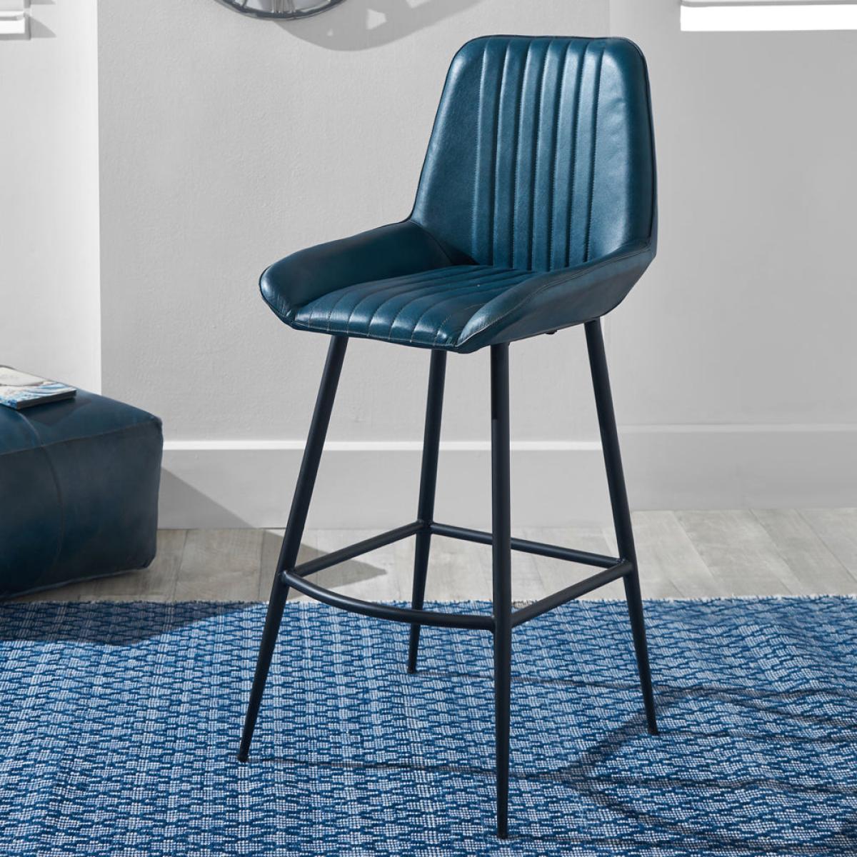 The Liberty bar stool is a modern and stylish prussian blue leather stool with ribbed effect cushioning. The stool with it's sleek black metal legs will look fantastic at any kitchen island or breakfast bar. Also available in other colours.