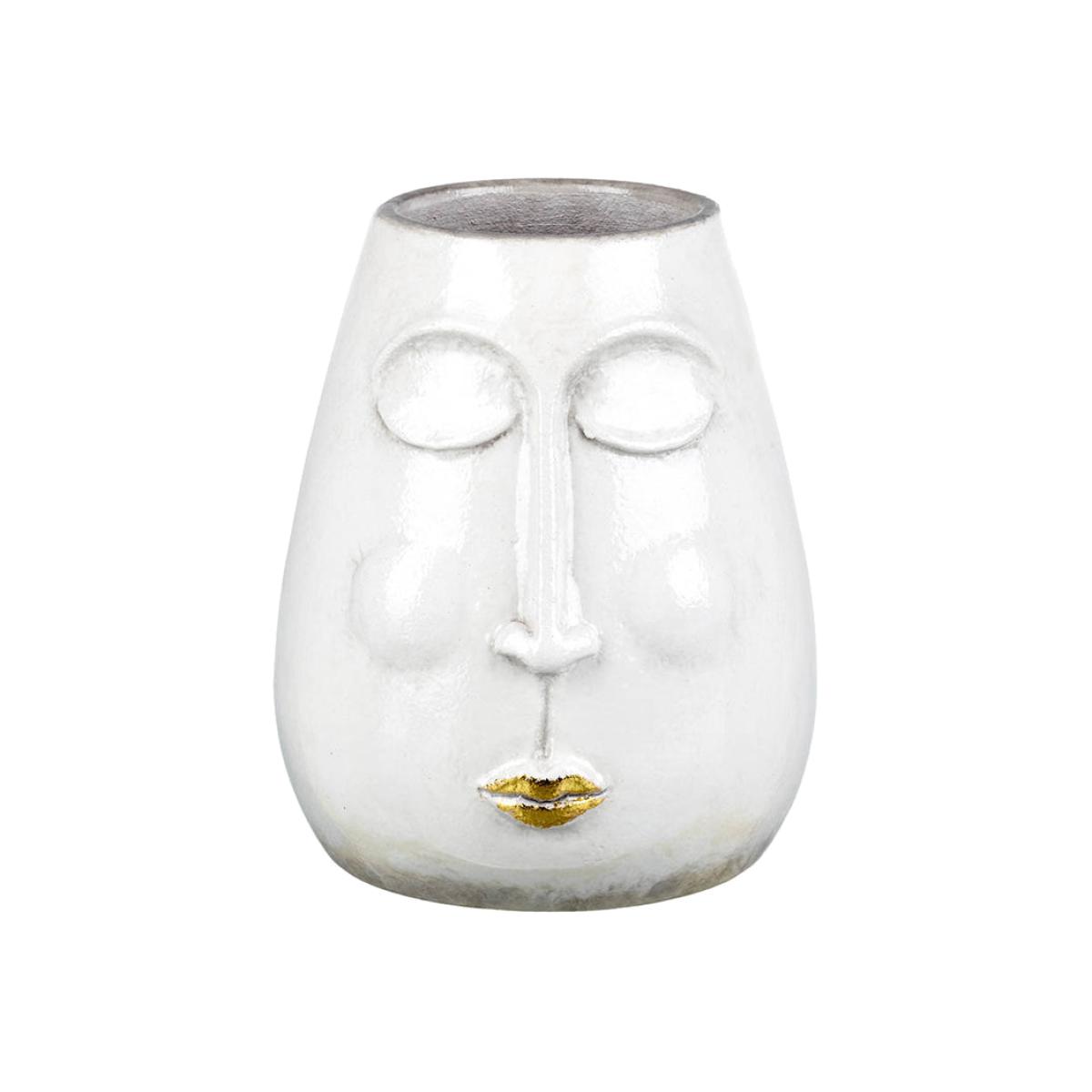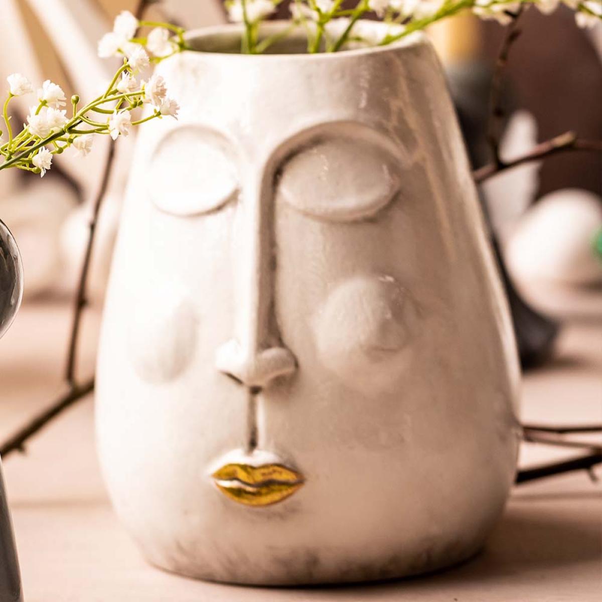 Add a delightfully quirky touch to any space with this Olivia's Lippy vase in white and gold. This stylish vase features an on-trend face design complete with a set of lips highlighted in a statement golden sheen. The rest of this funky vase is crafted in a sophisticated white tone, ensuring a fresh and contemporary ambience. Admirers of the sculptural look will love how the vase boasts a subtle three-dimensional design. Ideal for use in a living area, hallway or dining space, this charming vase will make a statement displaying your favourite flowers; alternatively, it will make a wonderful gift. Dimensions: H:20 W:17 cm