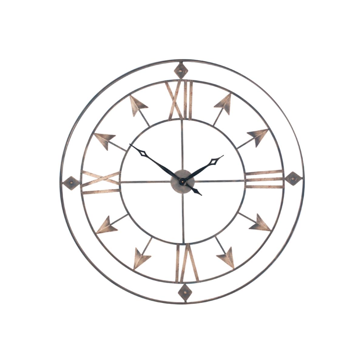 Make a statement on your wall with this classically designed large metal wall clock finished in Antique Grey and Gold. The beautiful detail of the delicate double frame with a cut-out Roman numerals and arrow design creates a traditional feel and a feature piece to a room.