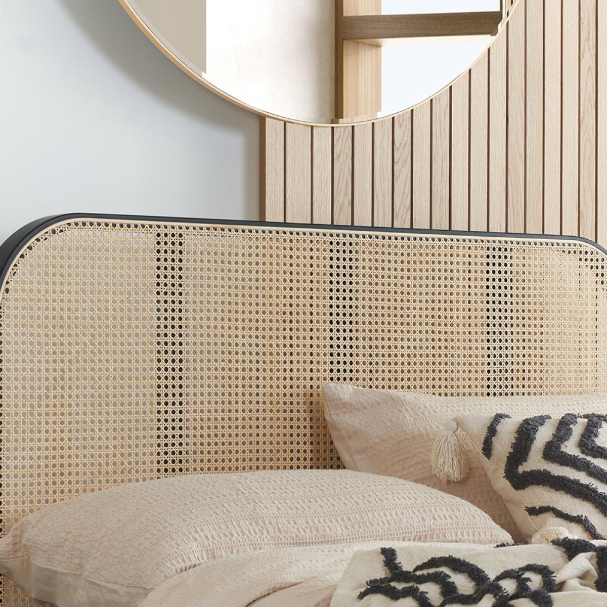A distinctive design with a contemporary feel, the Maggie rattan bed frame is the centrepiece for a modern styled bedroom. The curved rattan headboard offers a contrast against the solid, smooth lines of the frame. This frame also has a sprung slatted base to give natural bounce, adjusting to where pressure is most exerted to provide greater comfort. Please note: Olivia's beds are only suitable for a UK standard size mattress. Dimensions: Double - H: 115 x W: 142 x D: 201 cm. Kingsize - H: 115 x W: 157 x D: 210 cm. Super Kingsize - H: 115 x W: 188 x D: 210 cm Materials: Oak Assembly Required: Yes Care Instructions: Never use silicon or wax based furniture polish as this will leave a residue behind on the product. Gently dust using a soft buffing cloth. Make sure spills are blotted away quickly to avoid lasting stains. To remove any marks use a clean, slightly damp cloth. Never use detergents on any wood surfaces. Always follow cleaning instructions provided in the assembly instructions