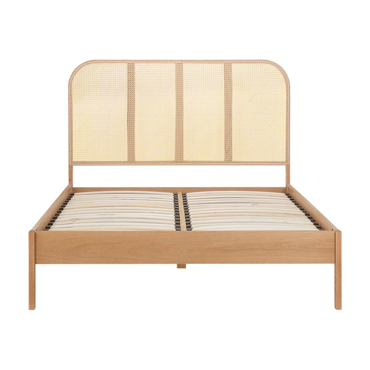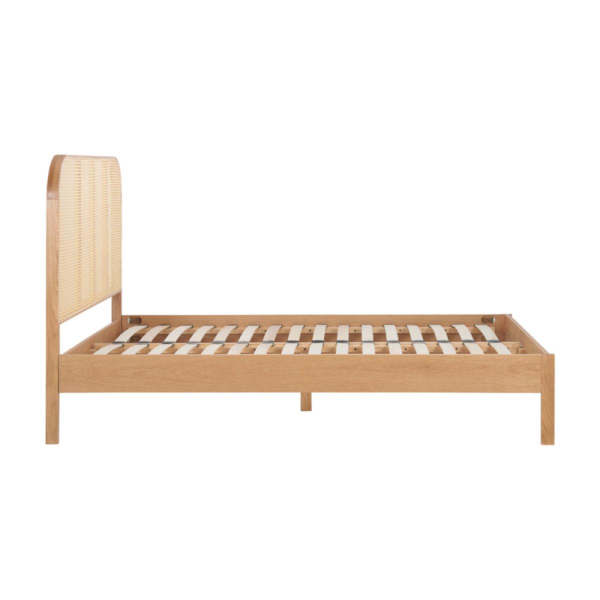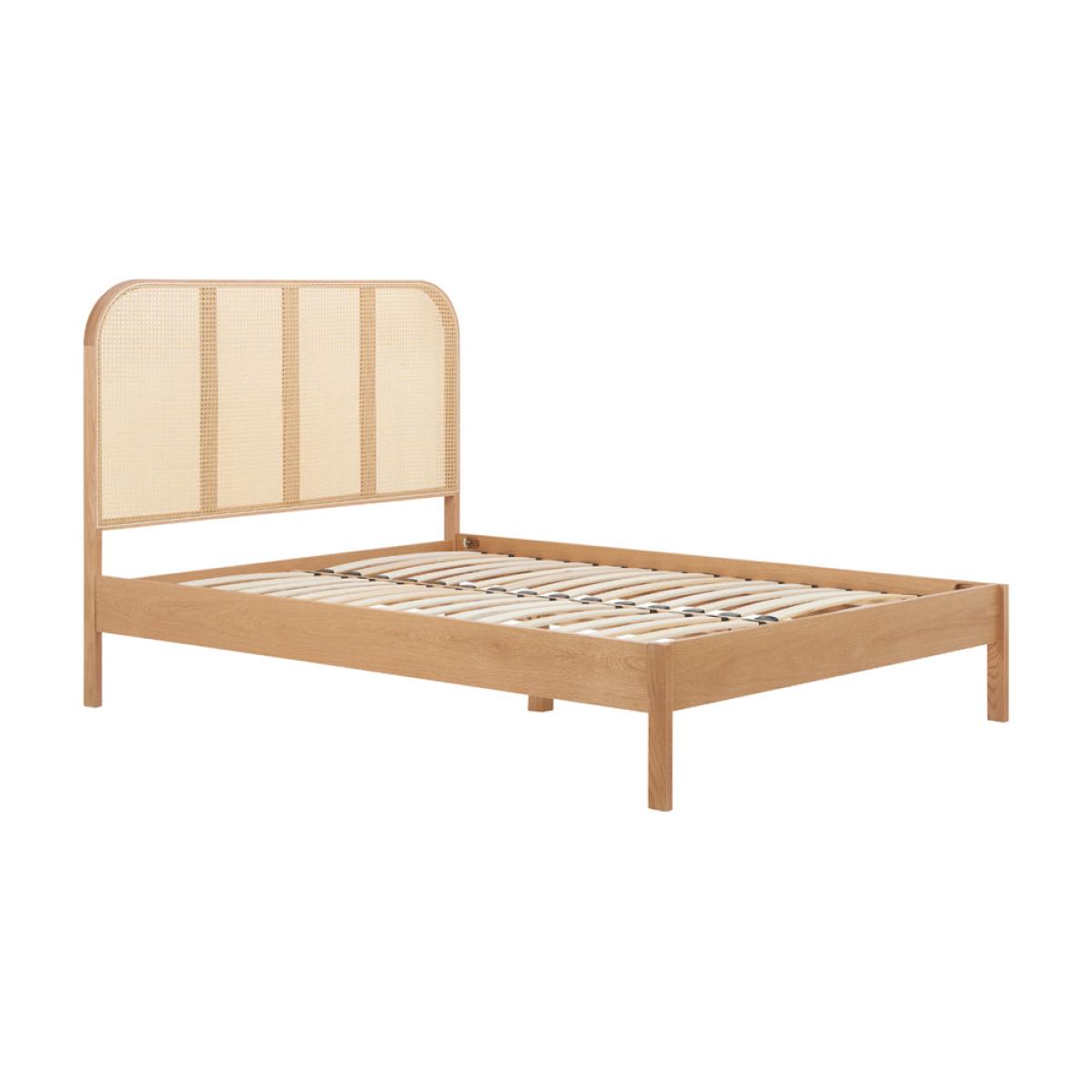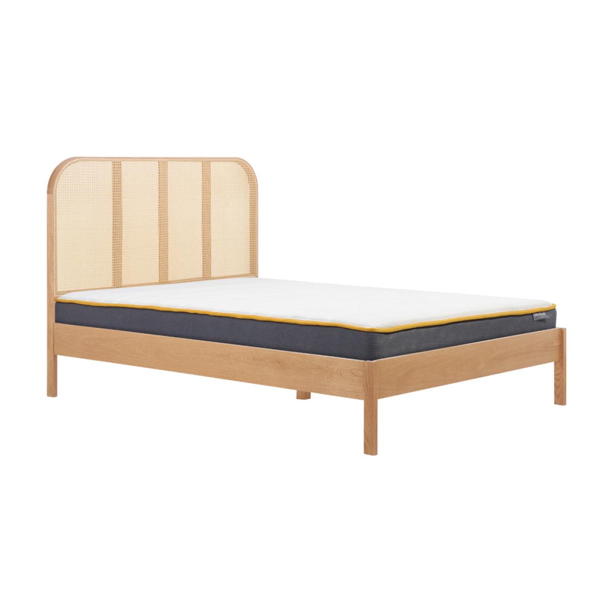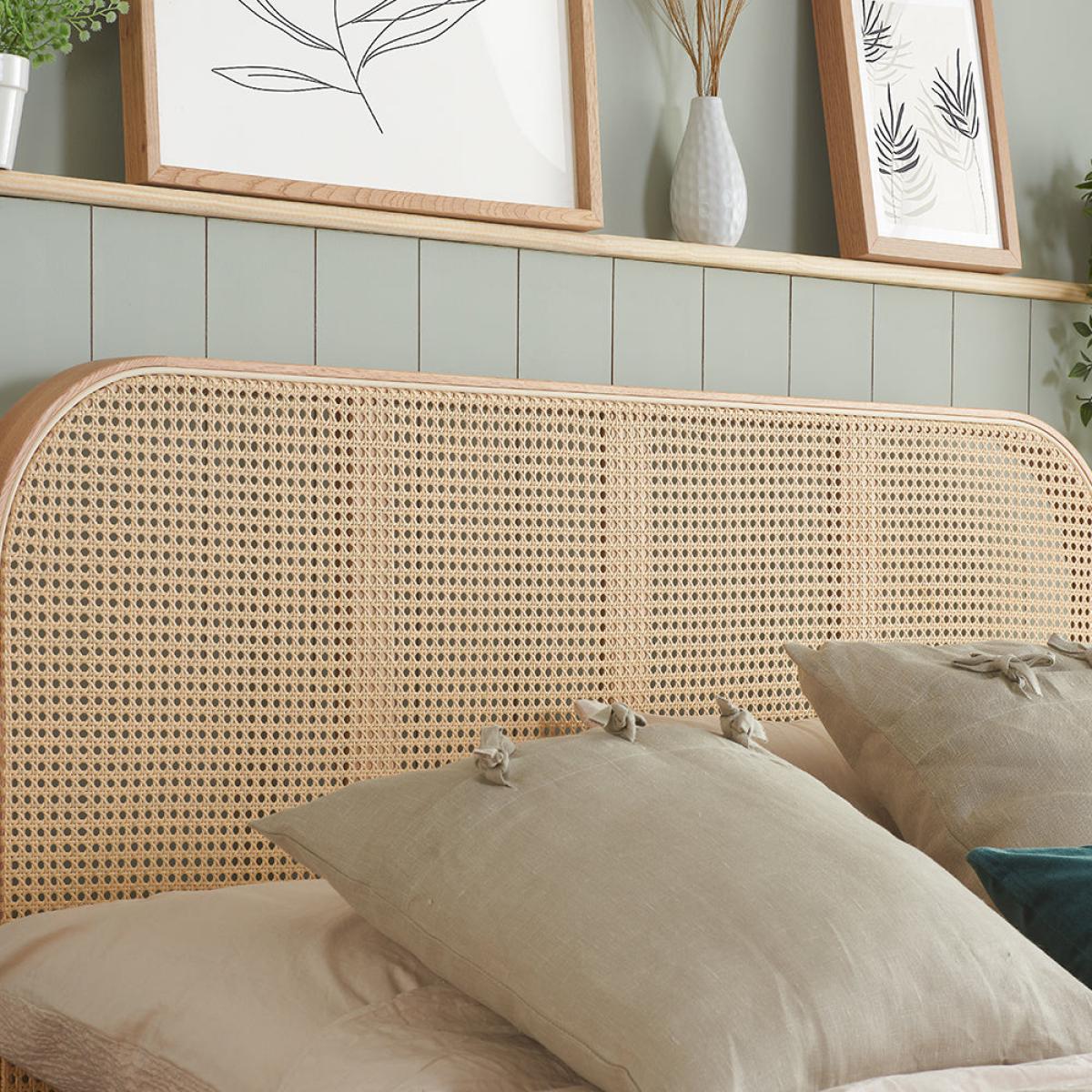 A distinctive design with a contemporary feel, the Maggie rattan bed frame is the centrepiece for a modern styled bedroom. The curved rattan headboard offers a contrast against the solid, smooth lines of the frame. This frame also has a sprung slatted base to give natural bounce, adjusting to where pressure is most exerted to provide greater comfort. Please note: Olivia's beds are only suitable for a UK standard size mattress. Dimensions: Double - H: 115 x W: 142 x D: 201 cm. Kingsize - H: 115 x W: 157 x D: 210 cm. Super Kingsize - H: 115 x W: 188 x D: 210 cm Materials: Oak Assembly Required: Yes Care Instructions: Never use silicon or wax based furniture polish as this will leave a residue behind on the product. Gently dust using a soft buffing cloth. Make sure spills are blotted away quickly to avoid lasting stains. To remove any marks use a clean, slightly damp cloth. Never use detergents on any wood surfaces. Always follow cleaning instructions provided in the assembly instructions