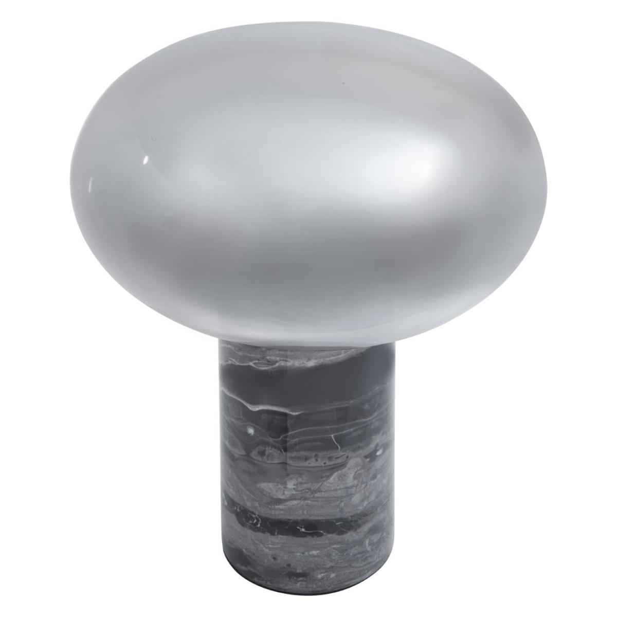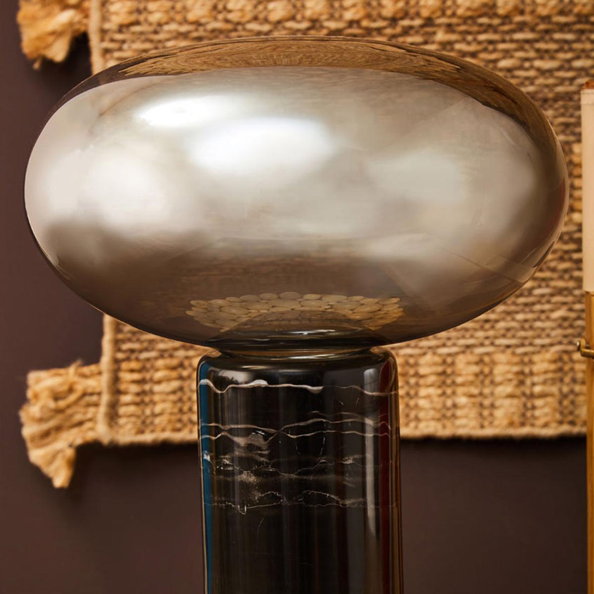 This table lamp showcases a geometric profile that will enhance the ambience of the living area. A black smoked glass round shade is fixed neatly on a cylindrical black marble base. Dimensions: H: 3. View More. This table lamp showcases a geometric profile that will enhance the ambience of the living area. A black smoked glass round shade is fixed neatly on a cylindrical black marble base.