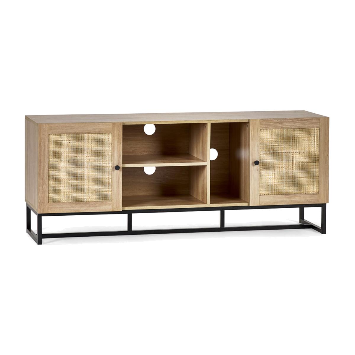 Fusing modern construction with retro design elements, the Naturo collection will exquisitely complement any styled home. The natural rattan fronts and industrial-style base collaborate perfectly to leave a warm yet chic aesthetic in your home. This range includes a bedside, 3 drawer chest, 6 drawer chest, wardrobe, coffee table, TV unit, sideboard, and tall bookcase. Also available in a black finish. Dimensions: H: 60 x W: 150 x D: 40 cm Materials: Melamine With Rattan Front & Metal Base Assembly Required:Yes Care Instructions:Wipe with a clean damp cloth. Avoid household cleaners & abrasives