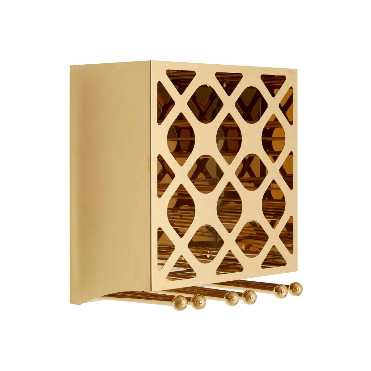 Created from strong steel, the Novo wine rack boasts a stylish gold finish that adds a luxurious feel. The front of the rack features a smooth, latticework style design, with twelve pointed oval op. View More. Created from strong steel, the Novo wine rack boasts a stylish gold finish that adds a luxurious feel. The front of the rack features a smooth, latticework style design, with twelve pointed oval openings for storing wine and spirits bottles. Metallic rails below allow for stemware to be efficiently hung via their base.