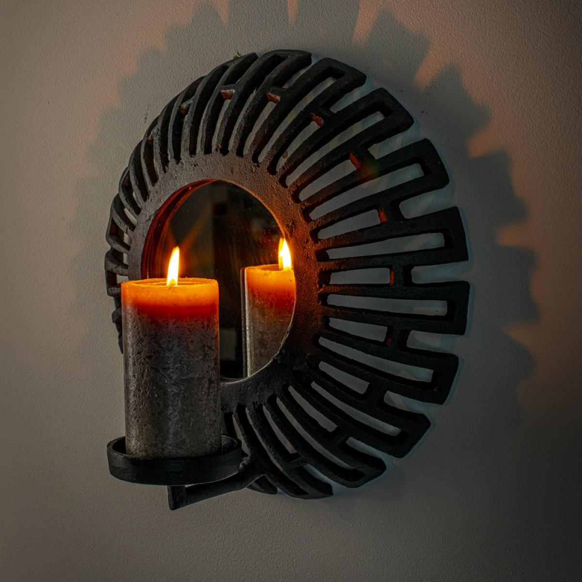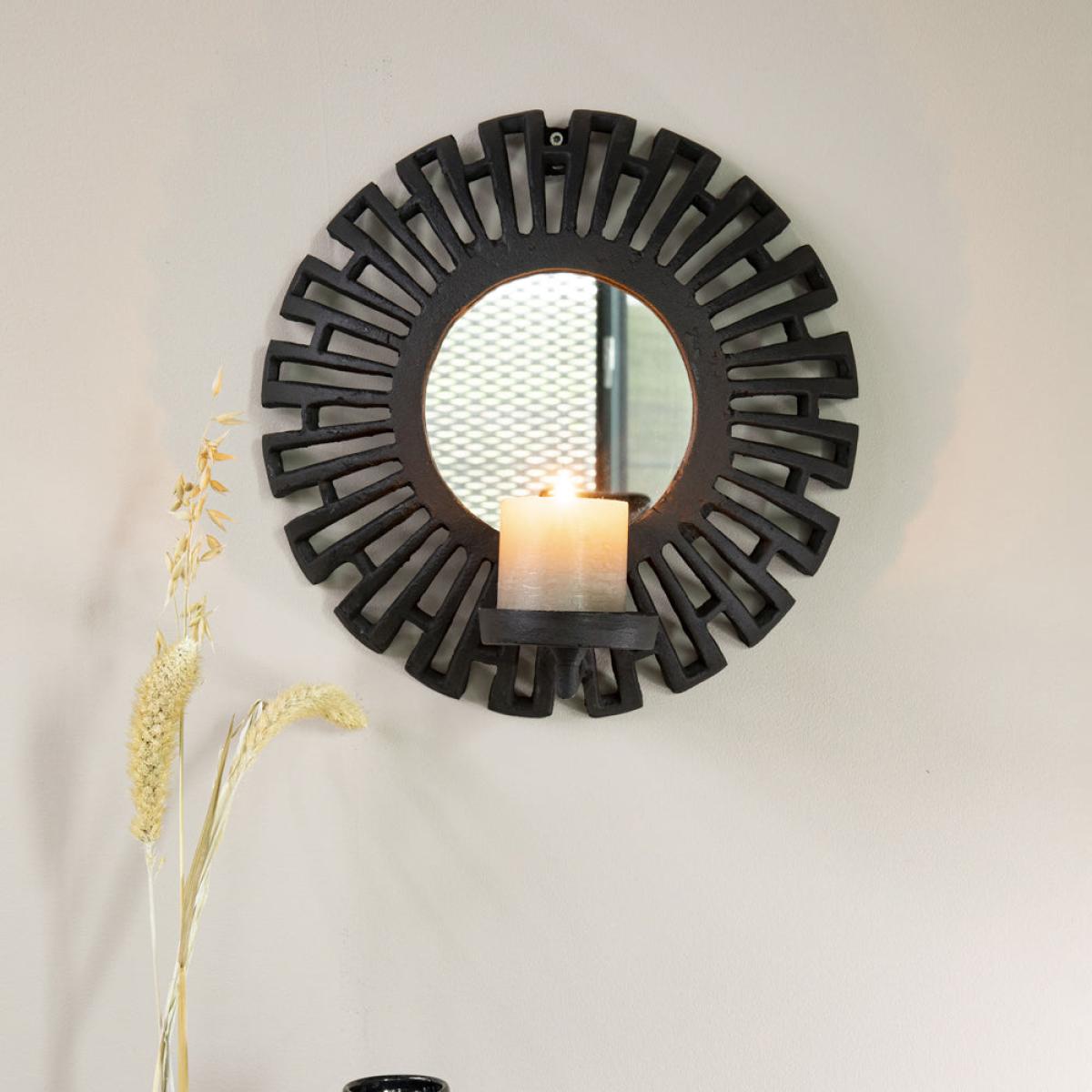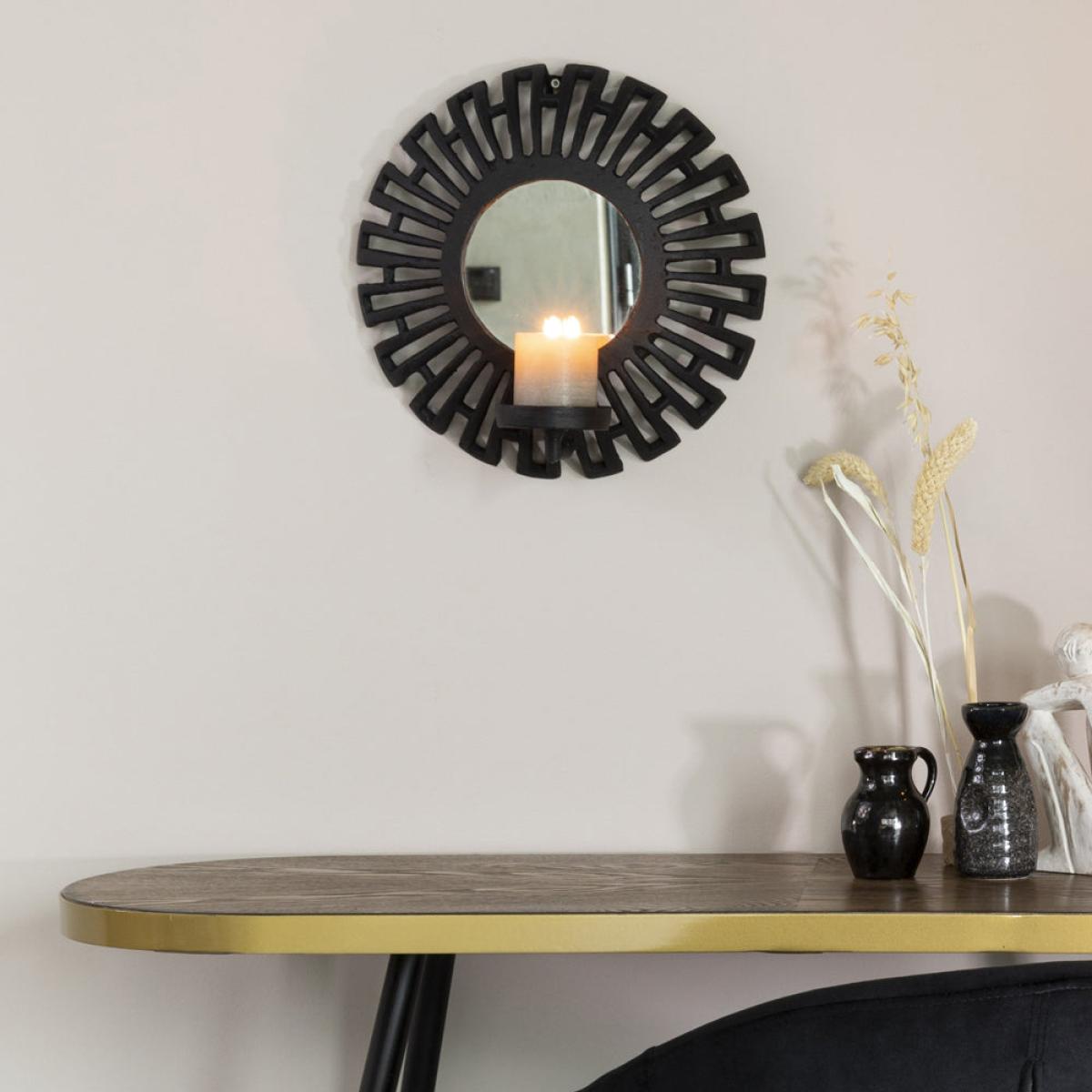 Add a striking focal point to your living space with this Aria Candle Holder in Black. It has a stunning Aztec design and a mirrored circular centre, with the added benefit of reflecting the warm a. View More. Add a striking focal point to your living space with this Aria Candle Holder in Black. It has a stunning Aztec design and a mirrored circular centre, with the added benefit of reflecting the warm and welcoming ambience from the candlelight back into the room. This piece will draw the eye and serve as a talking point for guests. This Aria Candle Holder from Olivia’s Nordic Living Collection is finished in black plated aluminium, and with a diameter of 18cm, it will be the perfect finishing touch to a hallway, living room or bedroom, complementing a variety of interior styles and colour palettes.