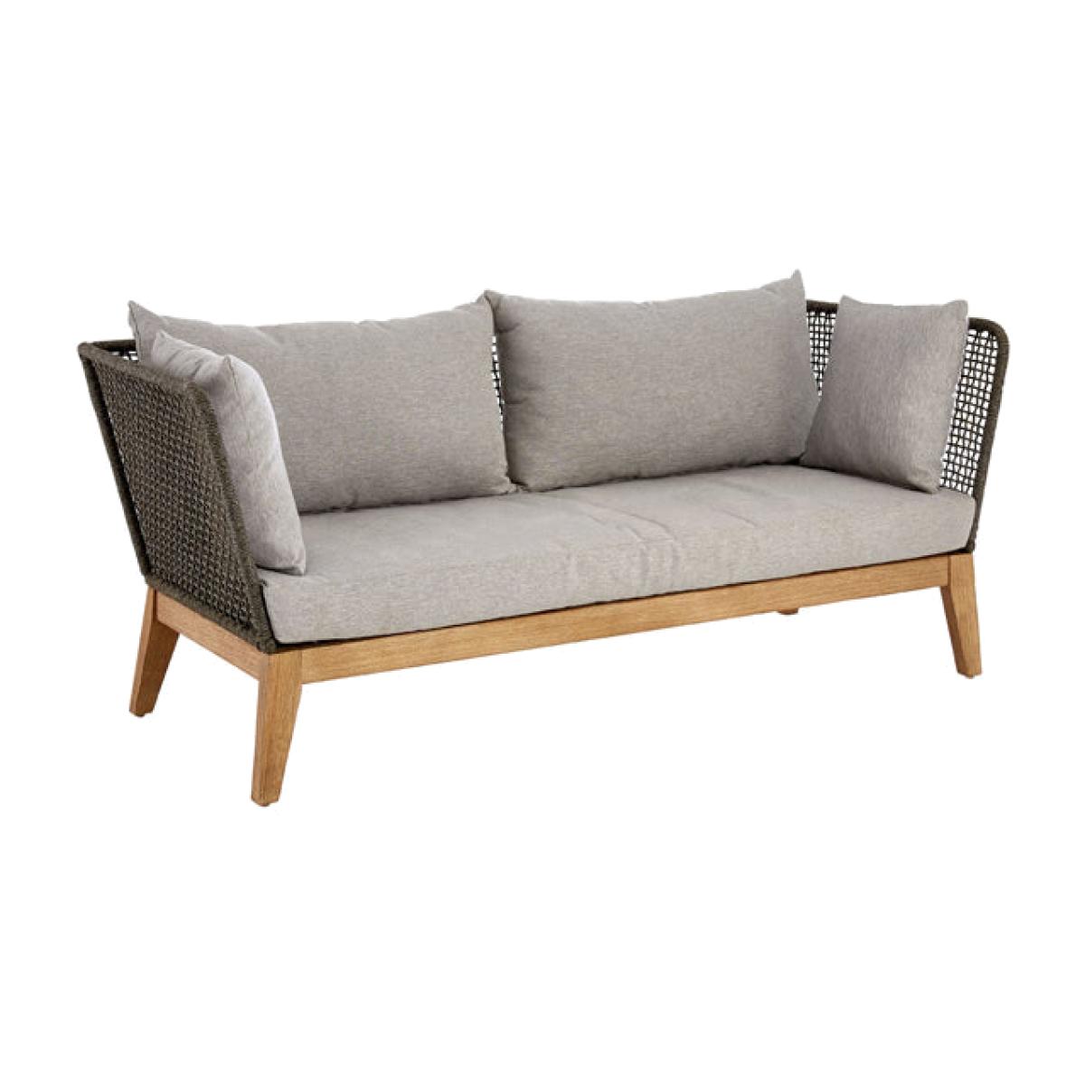 Its backrest and armrest are made from woven grey rope, complemented by the grey fabric padded seat and scatter cushions. The legs are crafted from sustainable eucalyptus wood and are angled to coordinate with the slanted armrest and leaned backrest of the chair. Coordinate with the Oona armchair. We would recommend that this furniture be covered or brought back inside when not in use. They should not be left exposed outside. Dimensions: H:71 x W:174 x D:75 cm