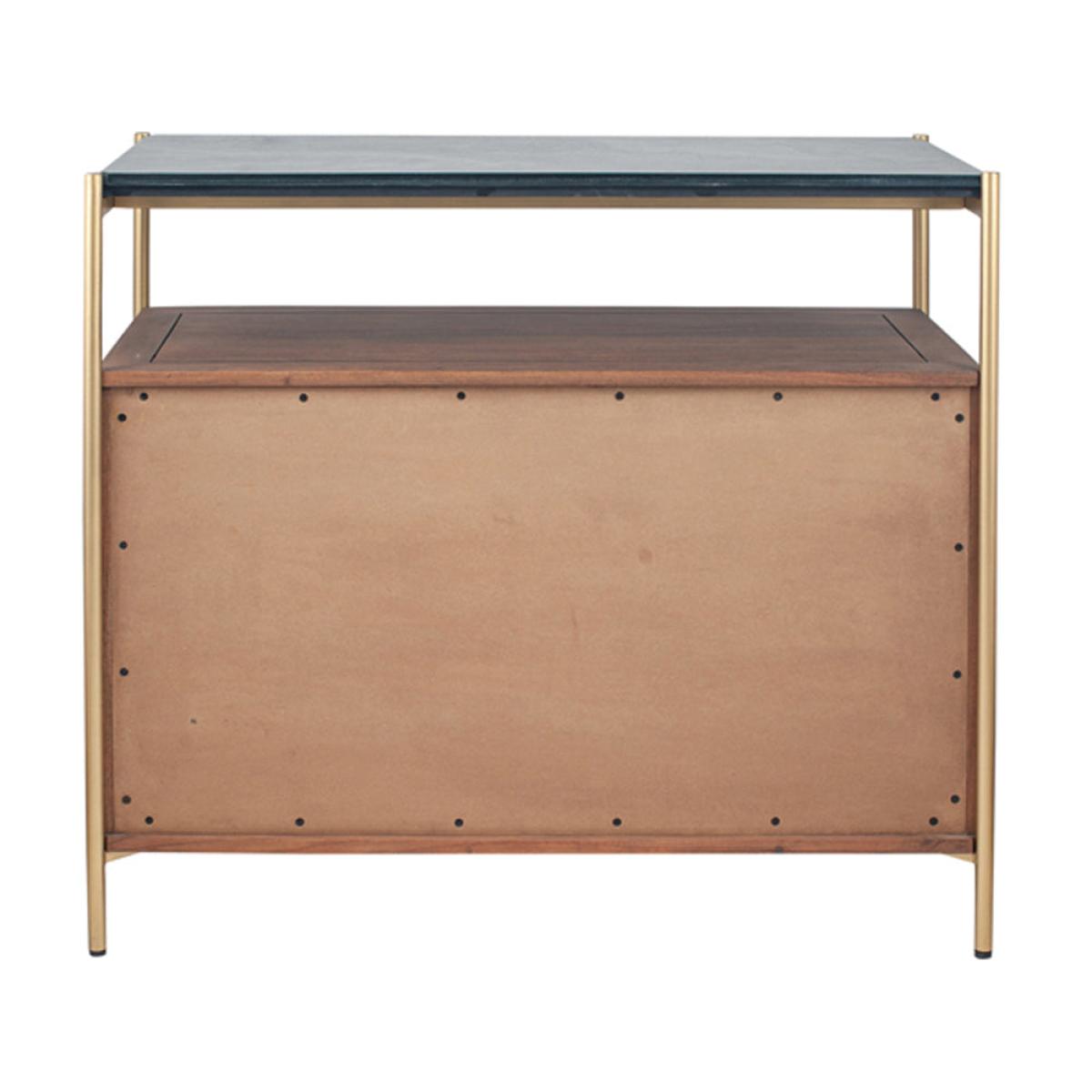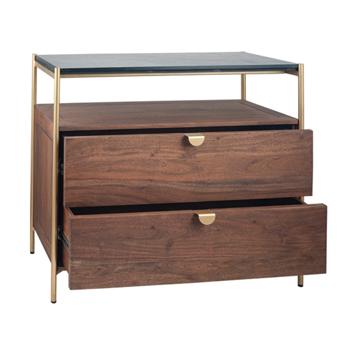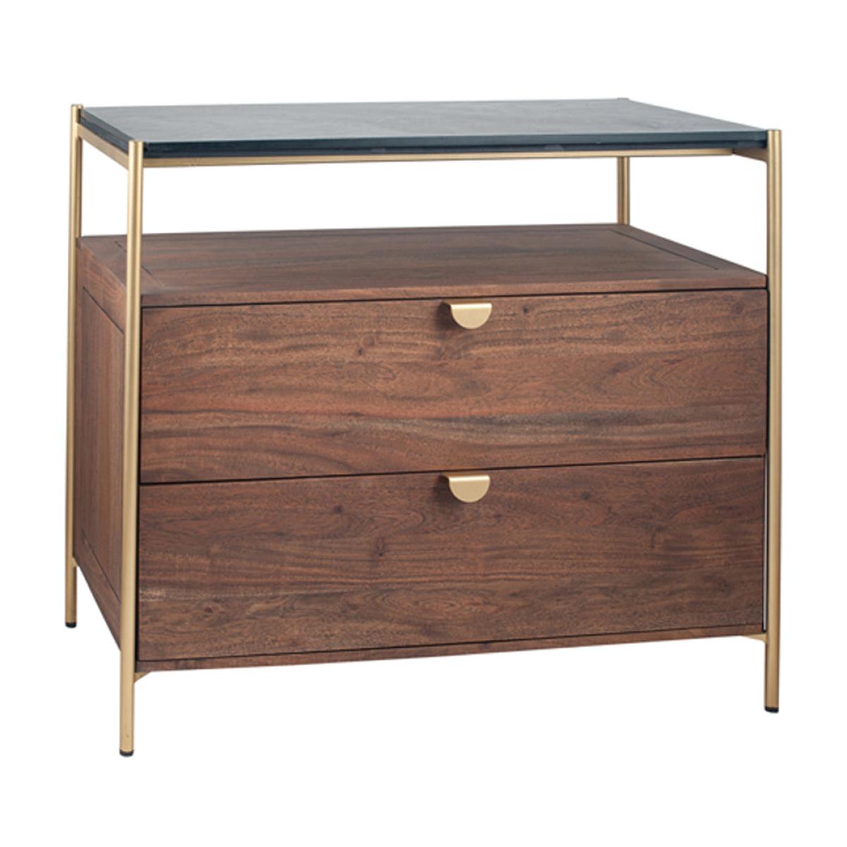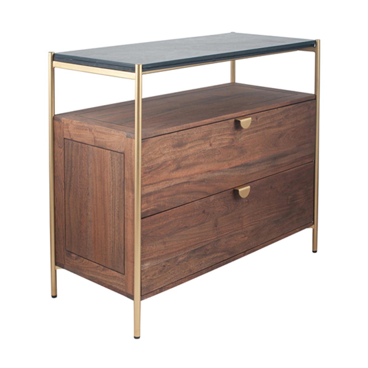A supremely useful piece, this drawer unit houses two drawers and a shelf and has the same beautiful styling as well as the rest of the Oslo range. The black marble top is set off beautifully by the gold effect metal frame and the softly stained acacia wood body, be it for living room, hallway or bedroom, this piece is at home anywhere in your interior. Take a look at other pieces in the Oslo range.