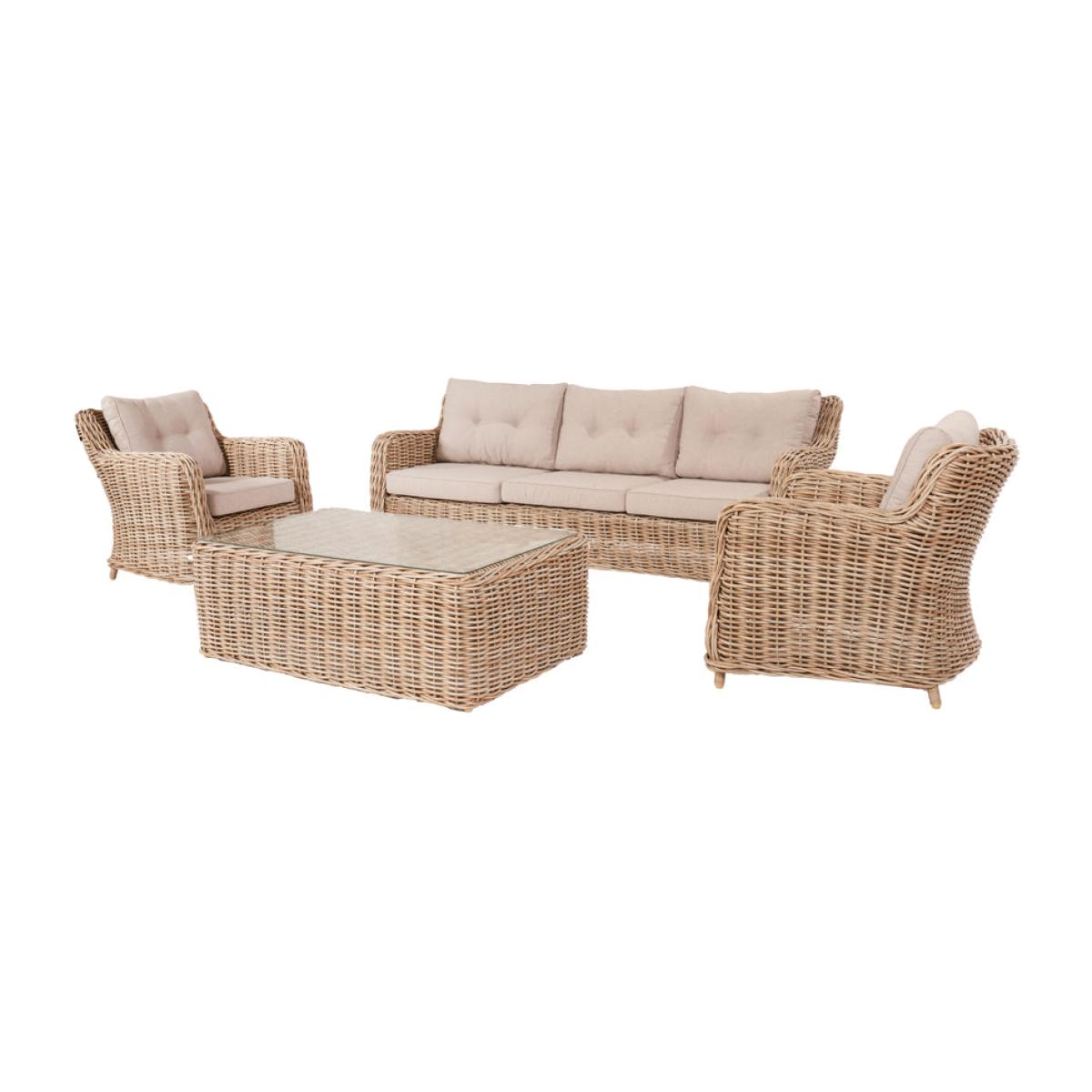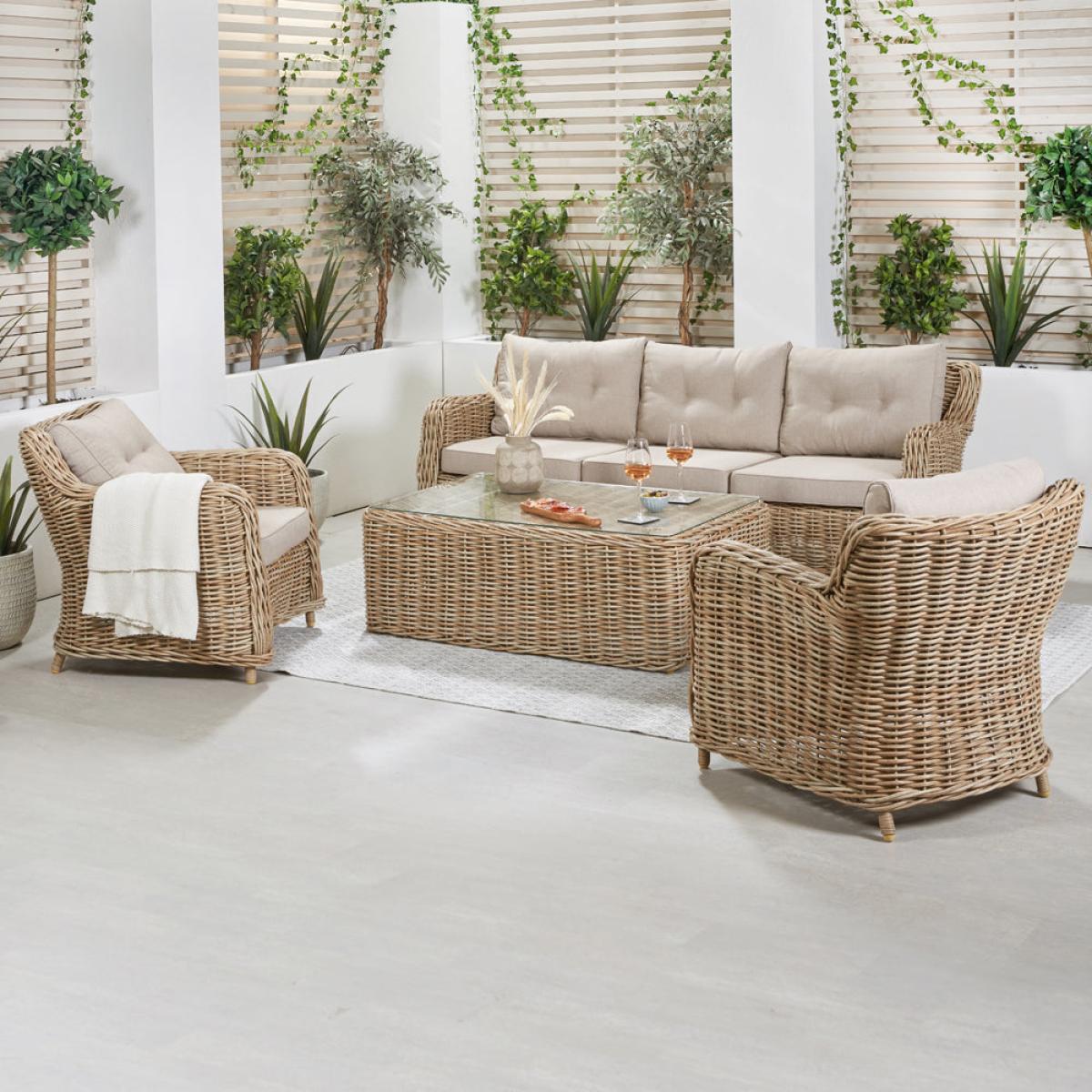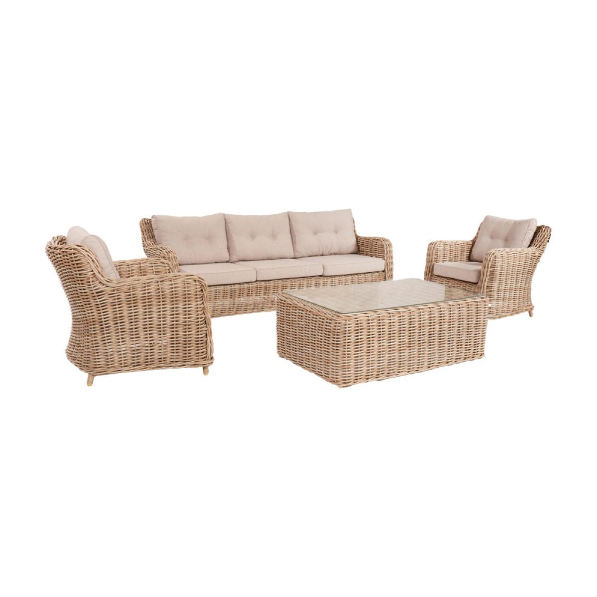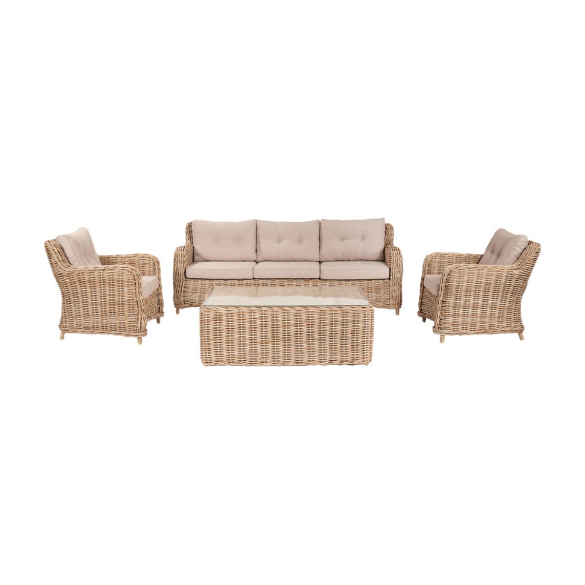 Elevate your outdoor lounging experience with Olivia"s Outdoor Baramino Natural Antique Lounge Set. Handcrafted in Vietnam, this set exudes classic modernity with its mid-height back design and stylish Natural Antique Bamboo colored finish. Comprising a 3-seater sofa, 2 armchairs, and a spacious rectangular coffee table with tempered glass, it offers both comfort and sophistication. Crafted from 10mm gauge, double-skinned, synthetic rattan weave, this set boasts luxurious styling and a durable weather-resistant finish. The Medium Weave Soft Beige season-proof cushions ensure added comfort and style. With a powder-coated aluminum frame, this outdoor set guarantees high quality, robustness, and long-lasting durability. Transform your outdoor space into a luxurious retreat with this timeless and elegant lounge set, perfect for relaxing and entertaining in style. Dimensions: 3 Seater Sofa Dimensions: H: 83 cm x W: 221 cm x D: 89 cm Armchair Dimensions: H: 83 cm x W: 80 cm x D: 89 cm Coffee Table Dimensions: H: 45 cm x W: 127 cm x D: 81 cm Overall Area Dimensions: H: N/A cm x W: 425 cm x D: 275 cm