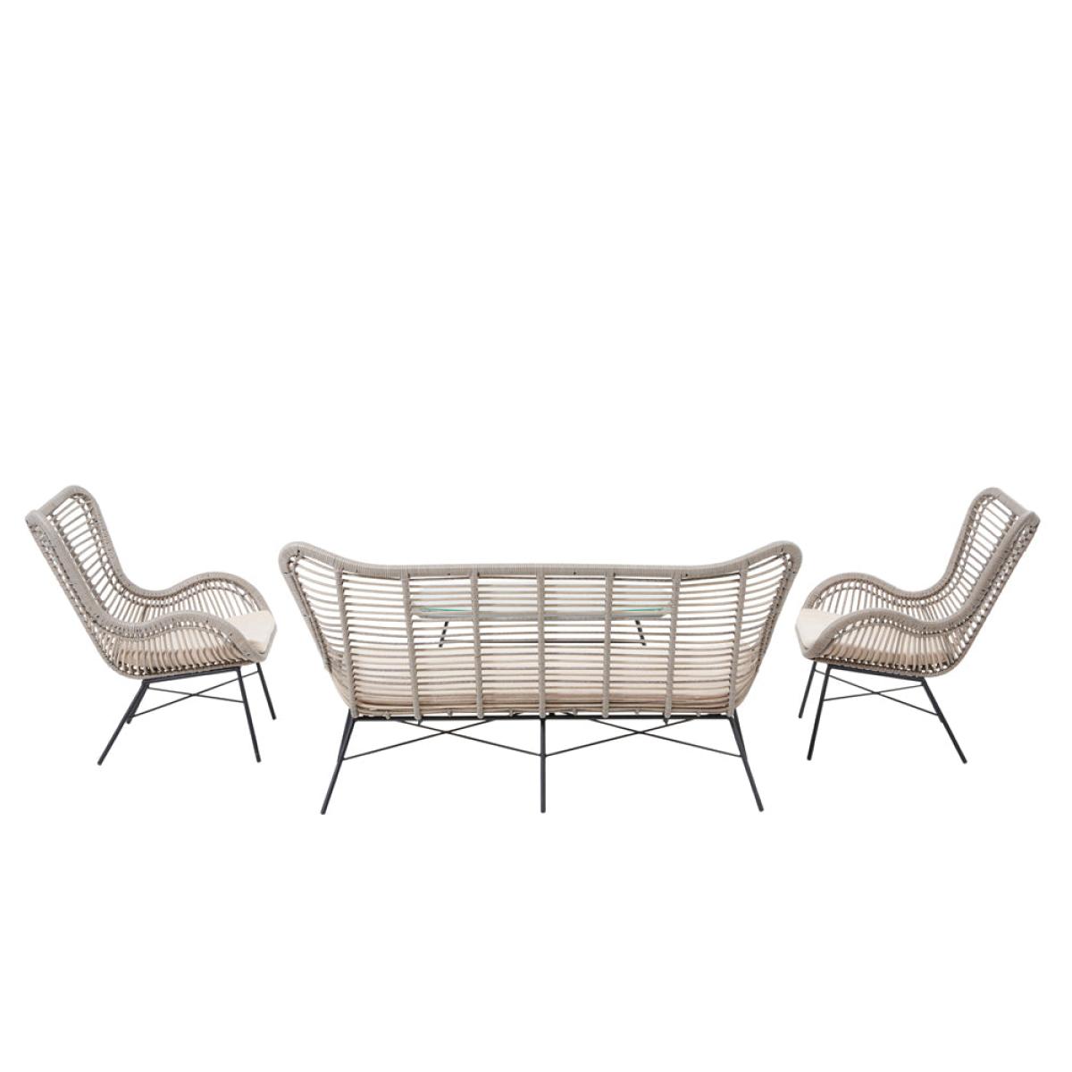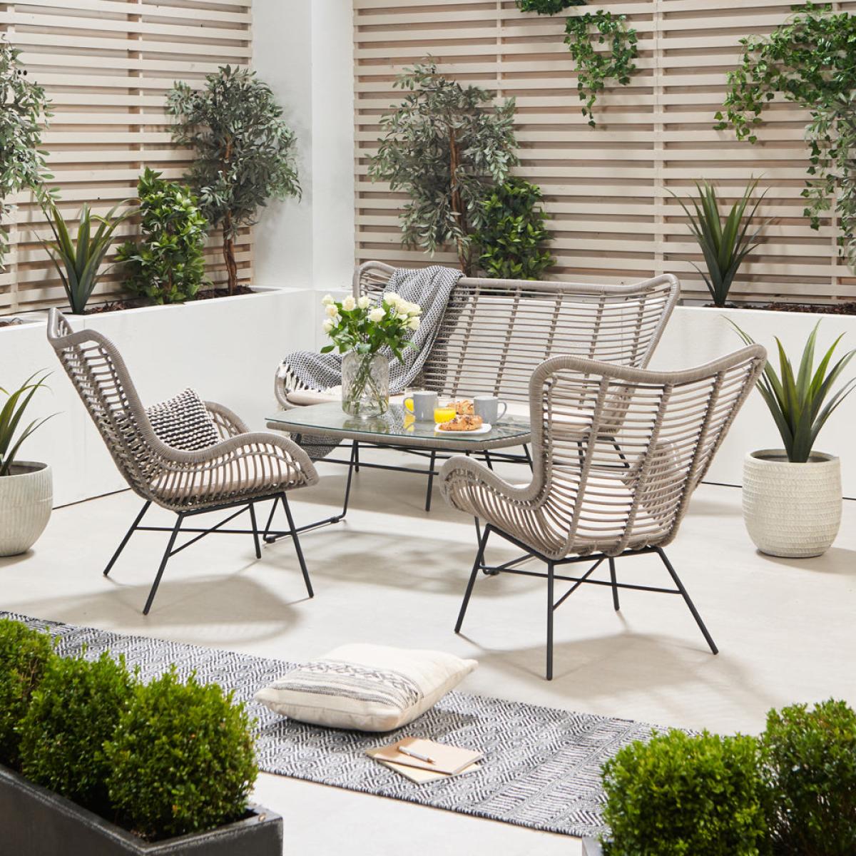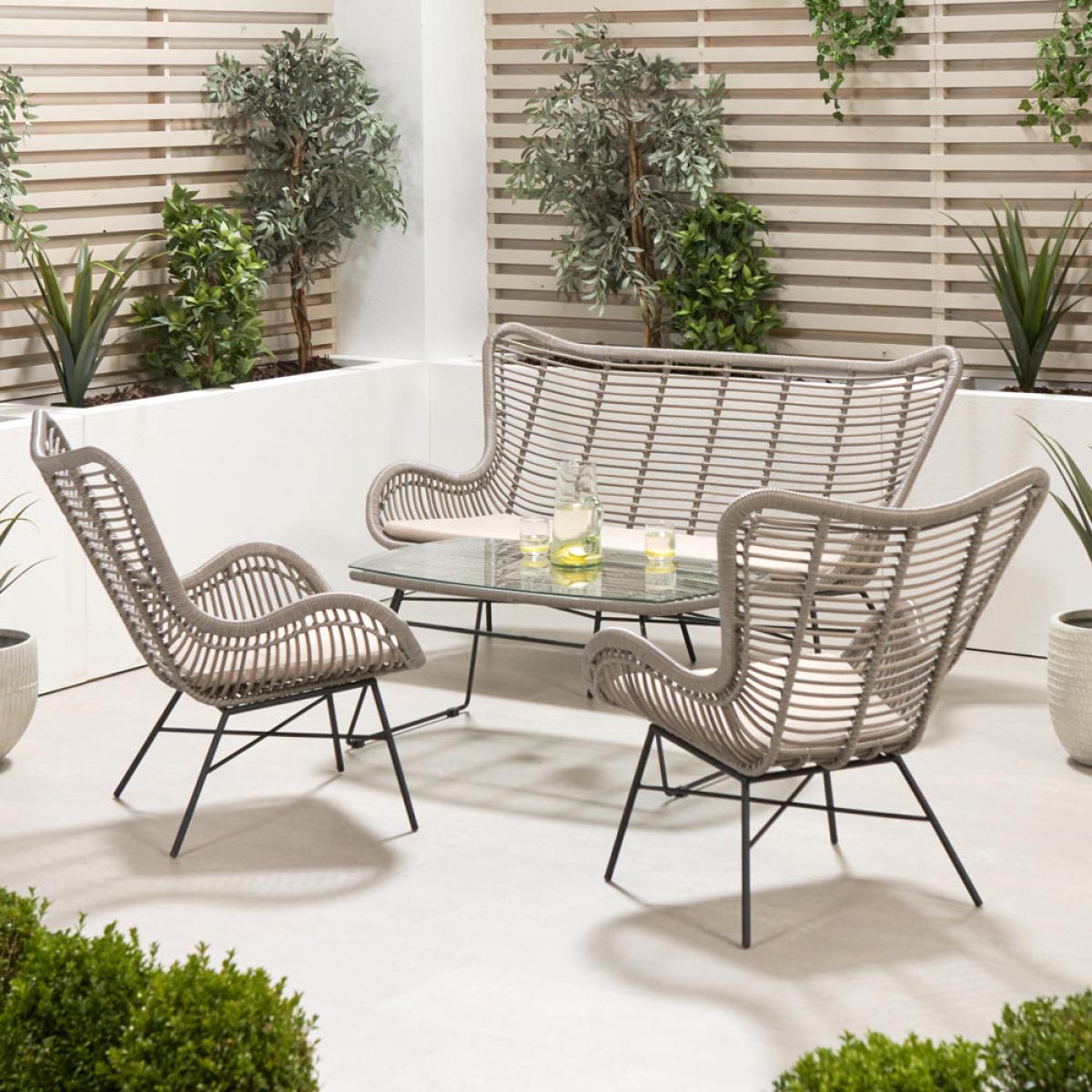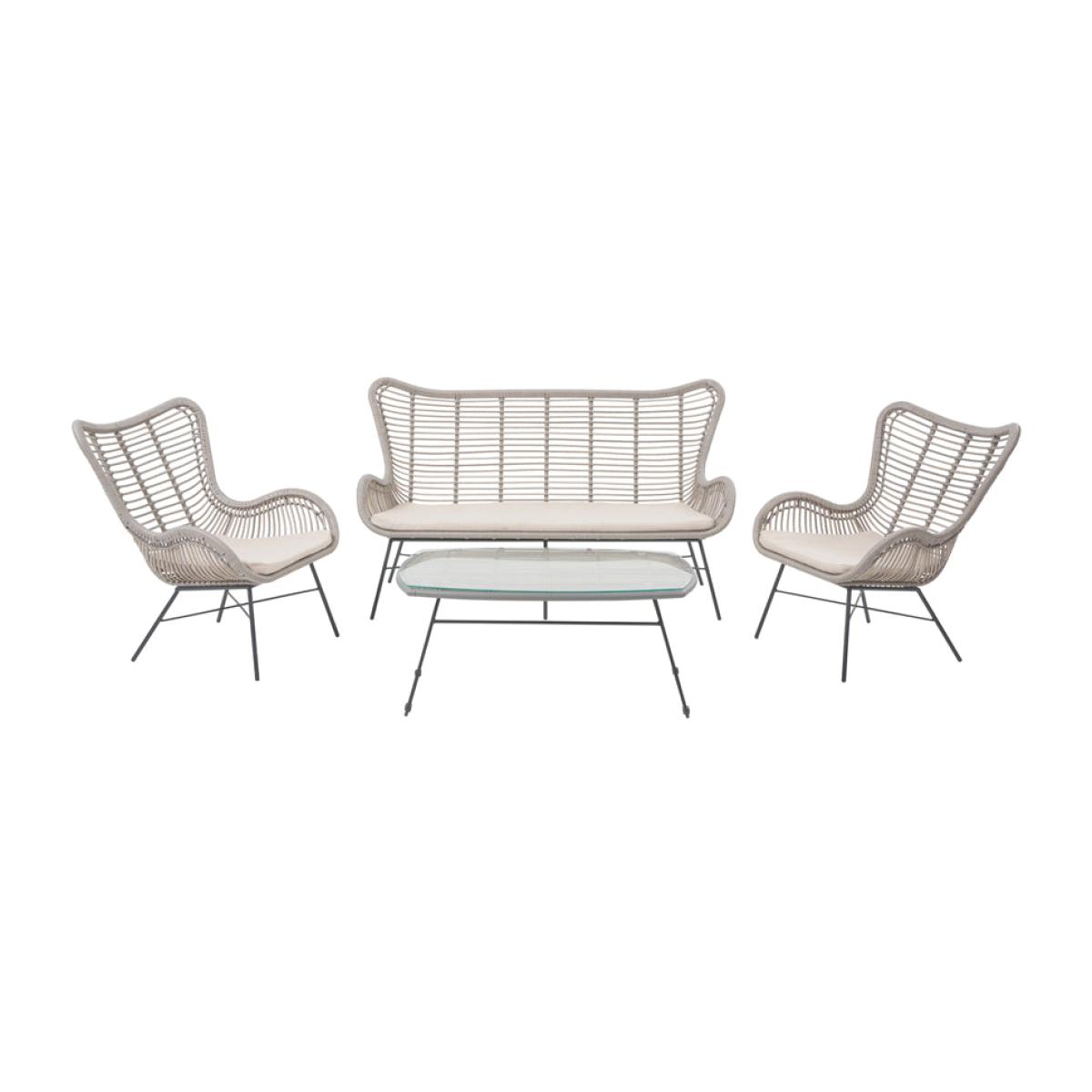 Create a stylish and inviting outdoor oasis with Olivia"s Outdoor Brisbay Lounge Set Grey. This contemporary set features an open cane weave finish in a soft grey wash, complemented by clean-lined matt black legs for a striking contrast. Including a two-seater sofa, two armchairs, and a central coffee table, this set effortlessly blends modern design with timeless elegance. Crafted from durable and weather-resistant mixed-tone outdoor wicker, it retains a natural feel while ensuring longevity. The powder-coated aluminum frame adds to its high-quality and robustness, while the British Standard safety glass top on the table provides a heavy-duty, quality finish. Complete with season-proof, fire-retardant cushions, this comfortable set guarantees endurance and style. Transform your outdoor space into a cozy and inviting retreat with the Brisbane Lounge Set, perfect for enjoying leisurely moments with family and friends. Dimensions: Coffee Table Dimensions: H: 45 cm x W: 101 cm x D: 60 cm Chair Dimensions: H: 89 cm x W: 73 cm x D: 80 cm Sofa Dimensions: H: 89 cm x W: 155 cm x D: 80 cm Overall Area Dimensions: H: N/A cm x W: 260 cm x D: 150 cm