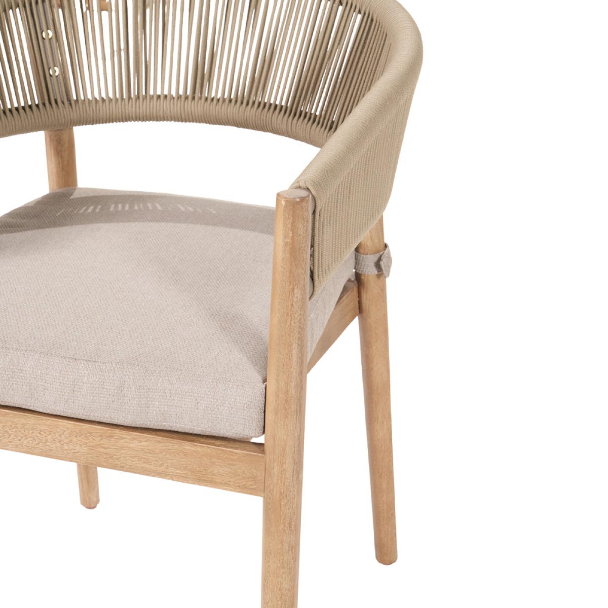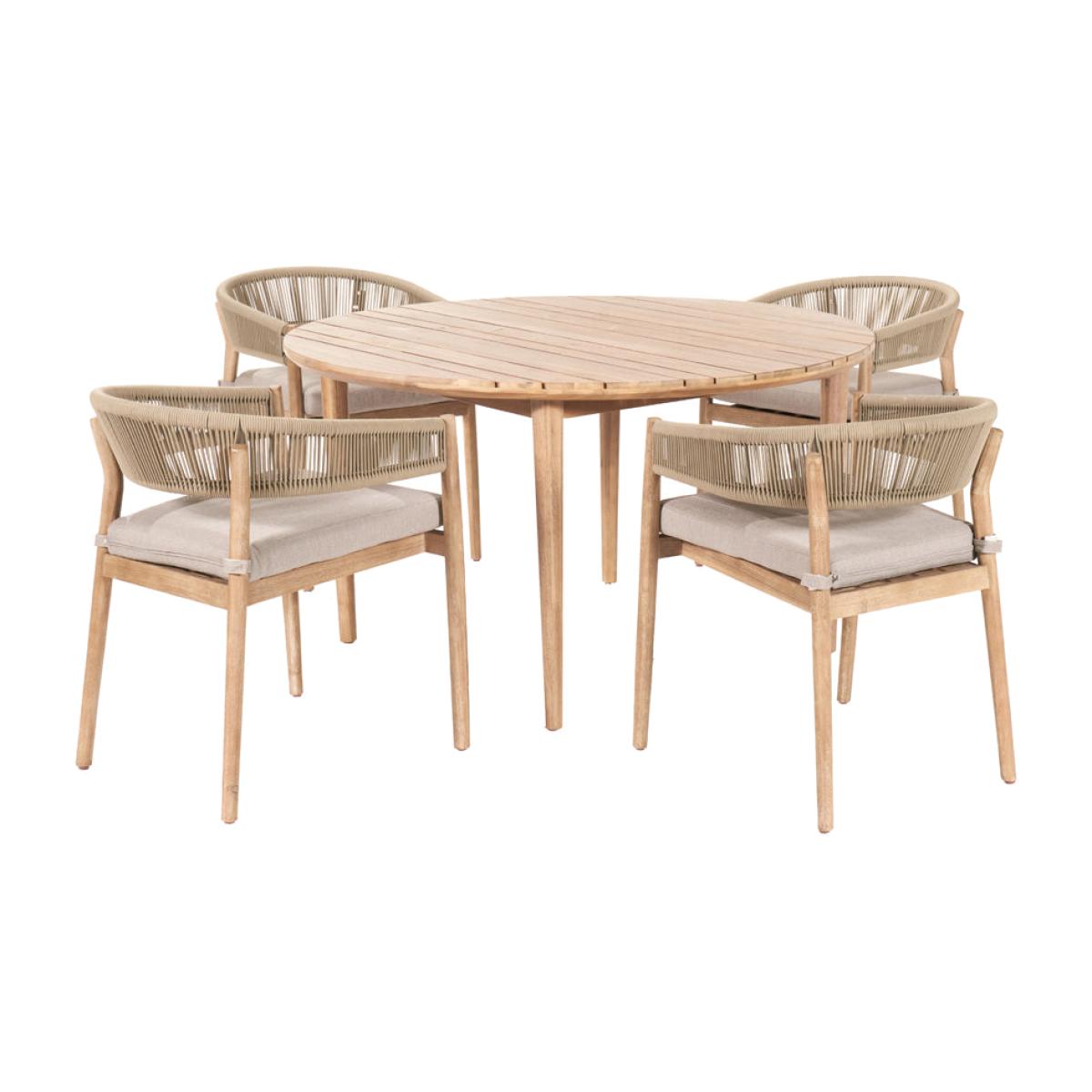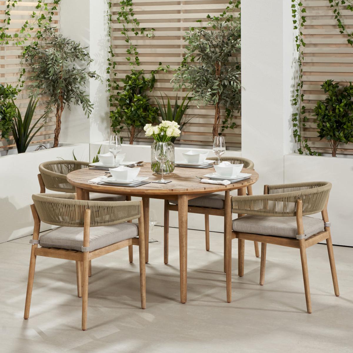 Enhance your outdoor dining experience with Olivia"s Outdoor Dala Sage Green 4 Seater Dining Set. Crafted with care by skilled artisans in Vietnam, the Denver Outdoor Dining Set offers a sleek design that will modernize your garden. The table and chairs feature an Antique Teak Effect Acacia Wood frame with twisted polyrope back in sage green, providing both style and comfort. The Medium Weave Soft Beige fabric cushions add a subtle contrast and ensure comfort during dining. This set includes 4 dining chairs and a dining table, perfect for any outdoor space. The slimline acacia wood frame is not only environmentally friendly but also durable, making it an excellent choice for outdoor furniture. Each comfortable cushion is season-proof and fire-retardant, guaranteeing the highest quality for your outdoor dining experience. Enjoy stylish and comfortable dining with the Denver Outdoor Dining Set, a perfect addition to your garden or patio. Dimensions Dining Chair Dimensions: H: 77 cm x W: 56 cm x D: 60 cm Dining Table Dimensions: H: 76 cm x W: 120 cm x D: 120 cm x Dia: 120 cm Overall Area Dimensions: H: N /A cm x W: 240 cm x D: 240 cm x Dia: 240 cm