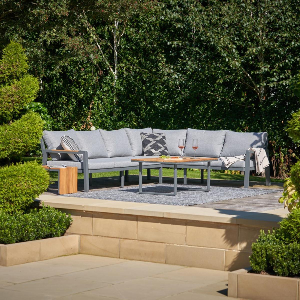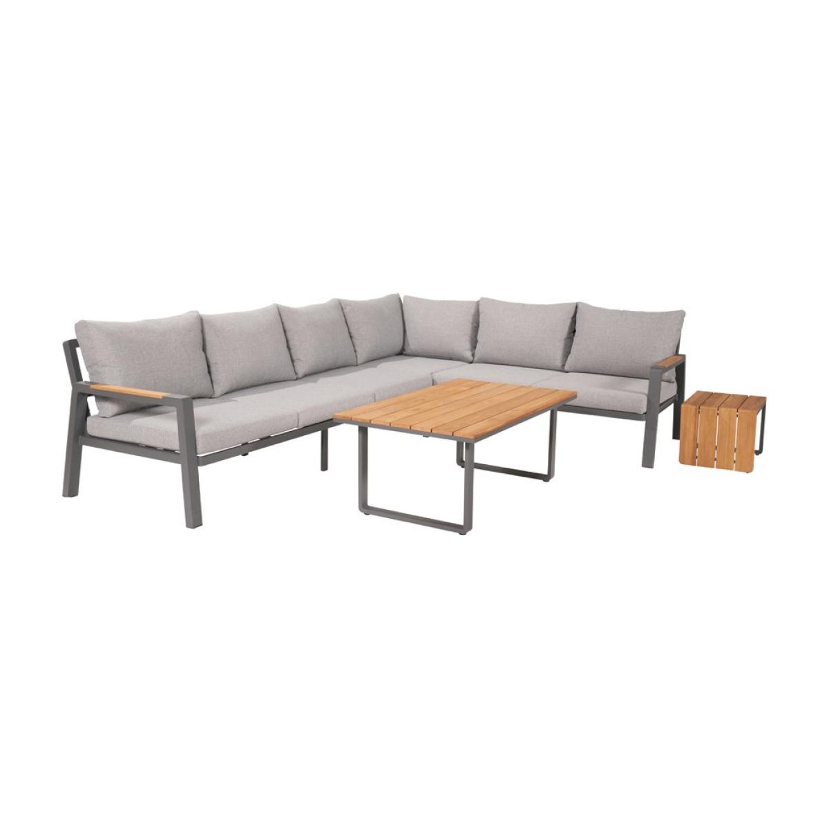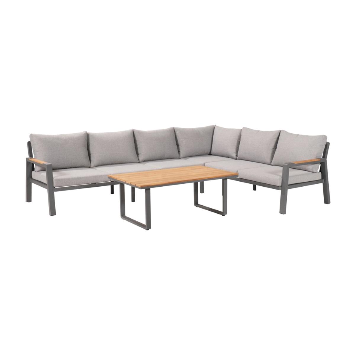 Transform your garden into a lounging haven with Olivia"s Outdoor Oslo Anthracite Corner Set. This set includes 1 Left Arm Sofa, 1 Right Arm Sofa, 1 Side Table, and 1 Coffee Table, all featuring a powder-coated aluminum frame finished in Anthracite with natural Teak Wood detailing. The versatile side table offers multiple surface options to suit your needs. The Linen Effect Marl Grey cushions provide comfort and style, while being season-proof and fire-retardant for added safety. Experience ultimate comfort and sophistication with this traditional yet stylish corner set, perfect for relaxing outdoors in style. Dimensions: Sofa: W226xD212xH83cm Coffee Table:W120xD70xH47cm Side Table: W40xD35xH50cm