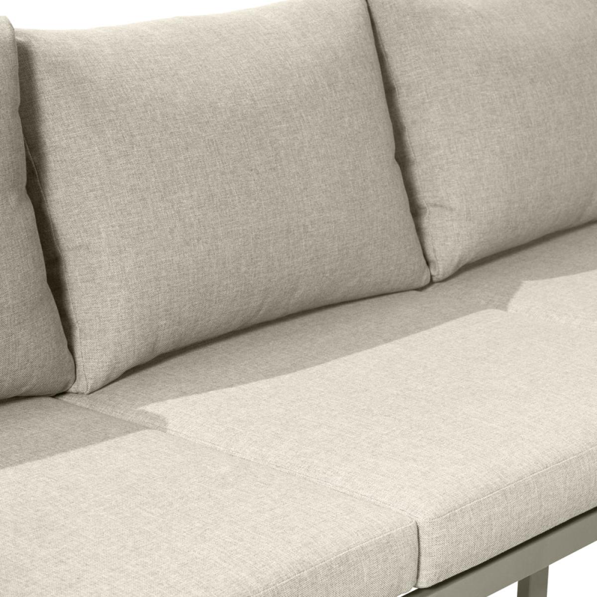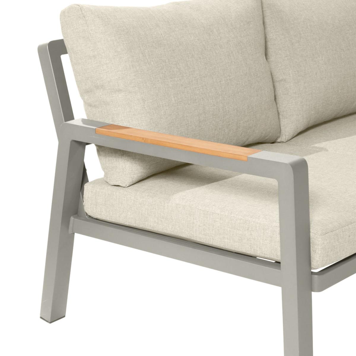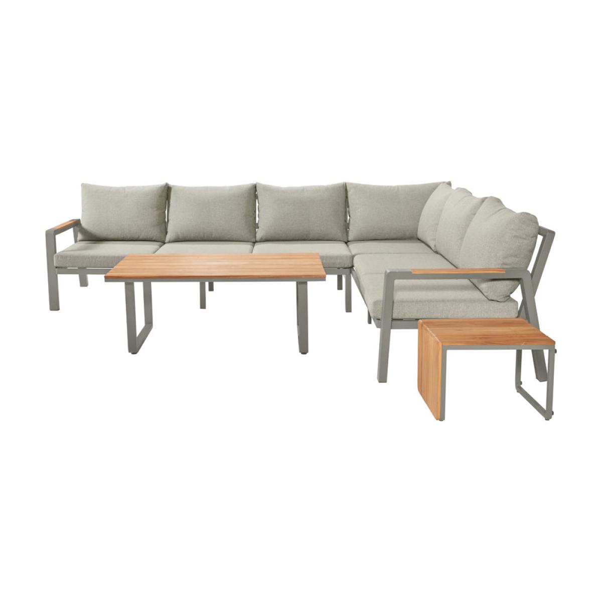 Elevate your outdoor lounging experience with Olivia"s Outdoor Oslo Limestone Corner Set. This set includes 1 Left Arm Sofa, 1 Right Arm Sofa, 1 Side Table, and 1 Coffee Table, all featuring a powder-coated aluminum frame finished in a Limestone colorway with natural Teak Wood detailing. The versatile side table offers multiple surface options to suit your needs. The Linen Effect Biscuit cushions provide comfort and style, while being season-proof and fire-retardant for added safety. Create a cozy and inviting lounging space in your garden with this traditional yet elegant corner set, perfect for relaxing outdoors with friends and family. Dimensions:Sofa: W:226xD:212xH:83cm Coffee Table: W:120xD:70xH:47cm. Side Table: W:40xD:35xH:50cm