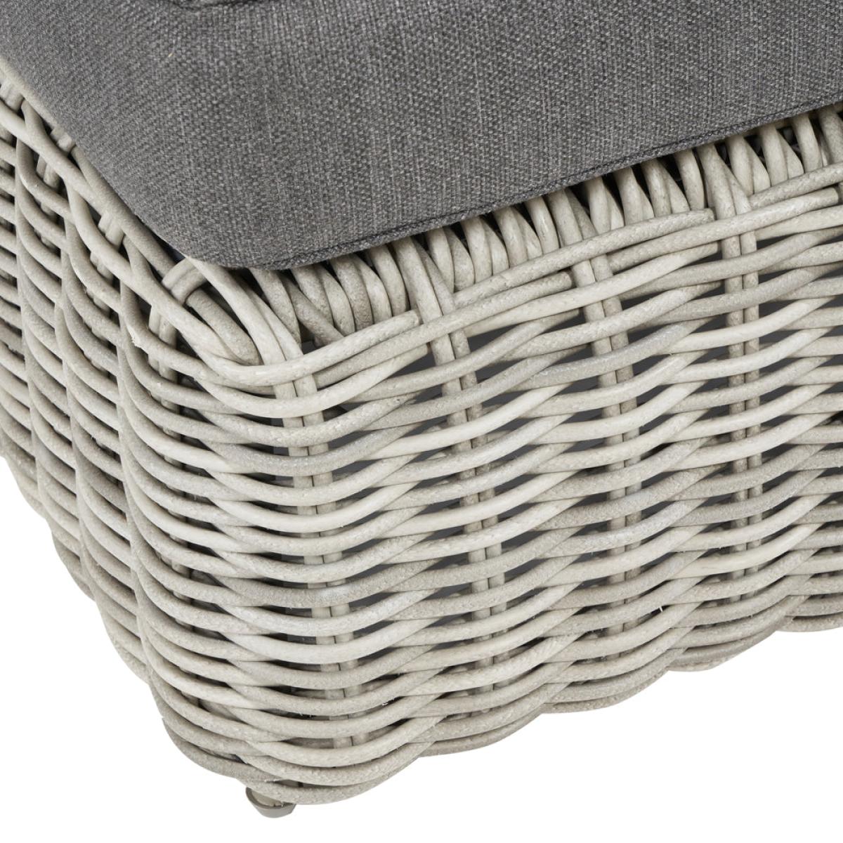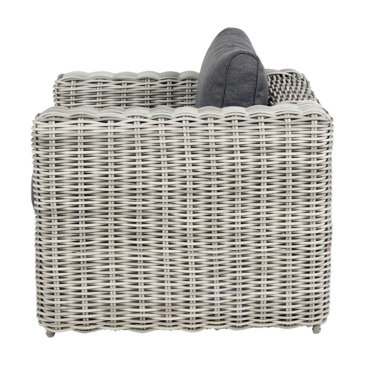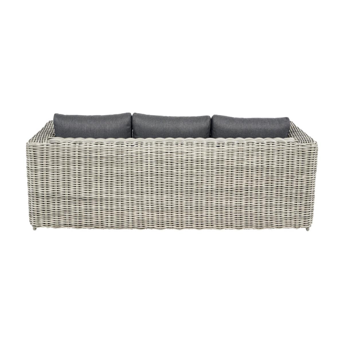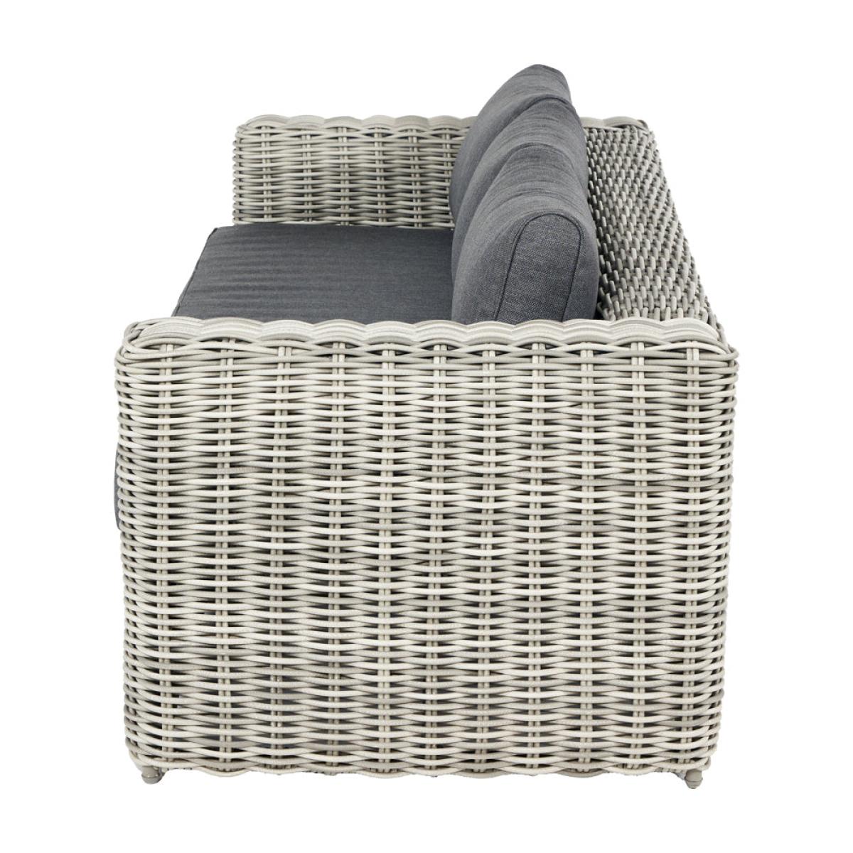 Elevate your outdoor lounging experience with Olivia"s Outdoor Roma Lounge Set. This stylish set features a modern double-skinned weave and a low back seating design for the ultimate lounging experience. Comprising a 3 seater sofa, 2 armchairs, and a central versatile footstool, this set offers a contemporary and comfortable seating arrangement for your garden. Crafted from synthetic double-skinned rattan weave for a modern look and durable weather-resistant finish, this set is complemented by a powder-coated aluminum frame for high-quality and robustness. The season-proof, fire-retardant cushions in a stylish grey provide comfort and style, while being water repellent for added durability. Create a chic and inviting outdoor space with this luxurious lounge set, perfect for relaxing and entertaining in style. 3 Seater Sofa Dimensions: H: 89 cm x W: 223 cm x D: 95 cm