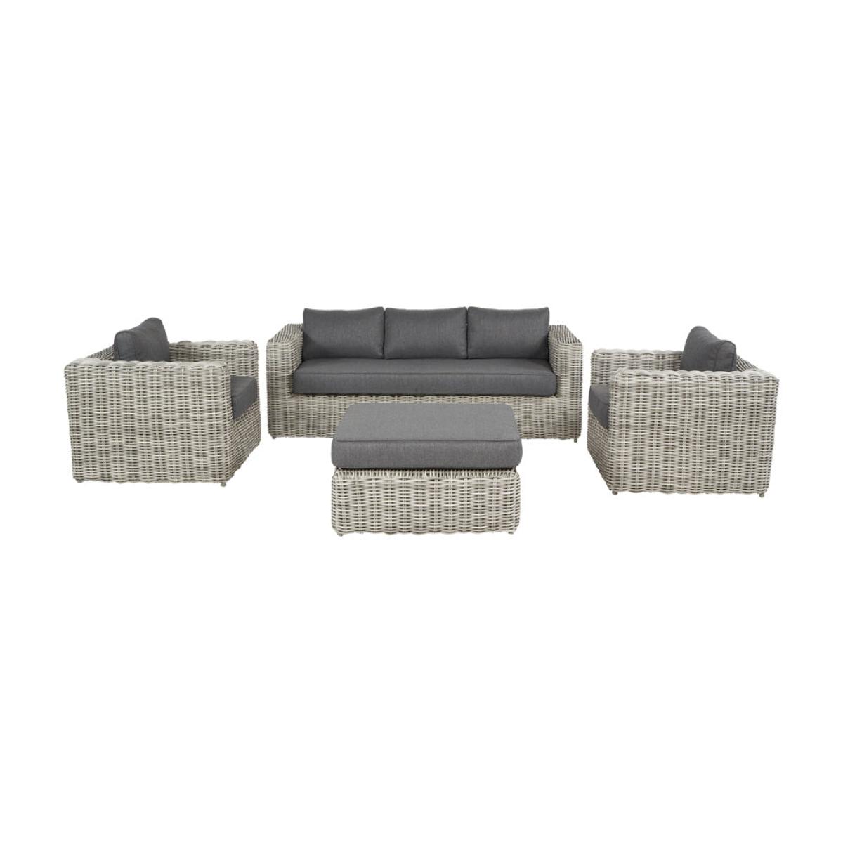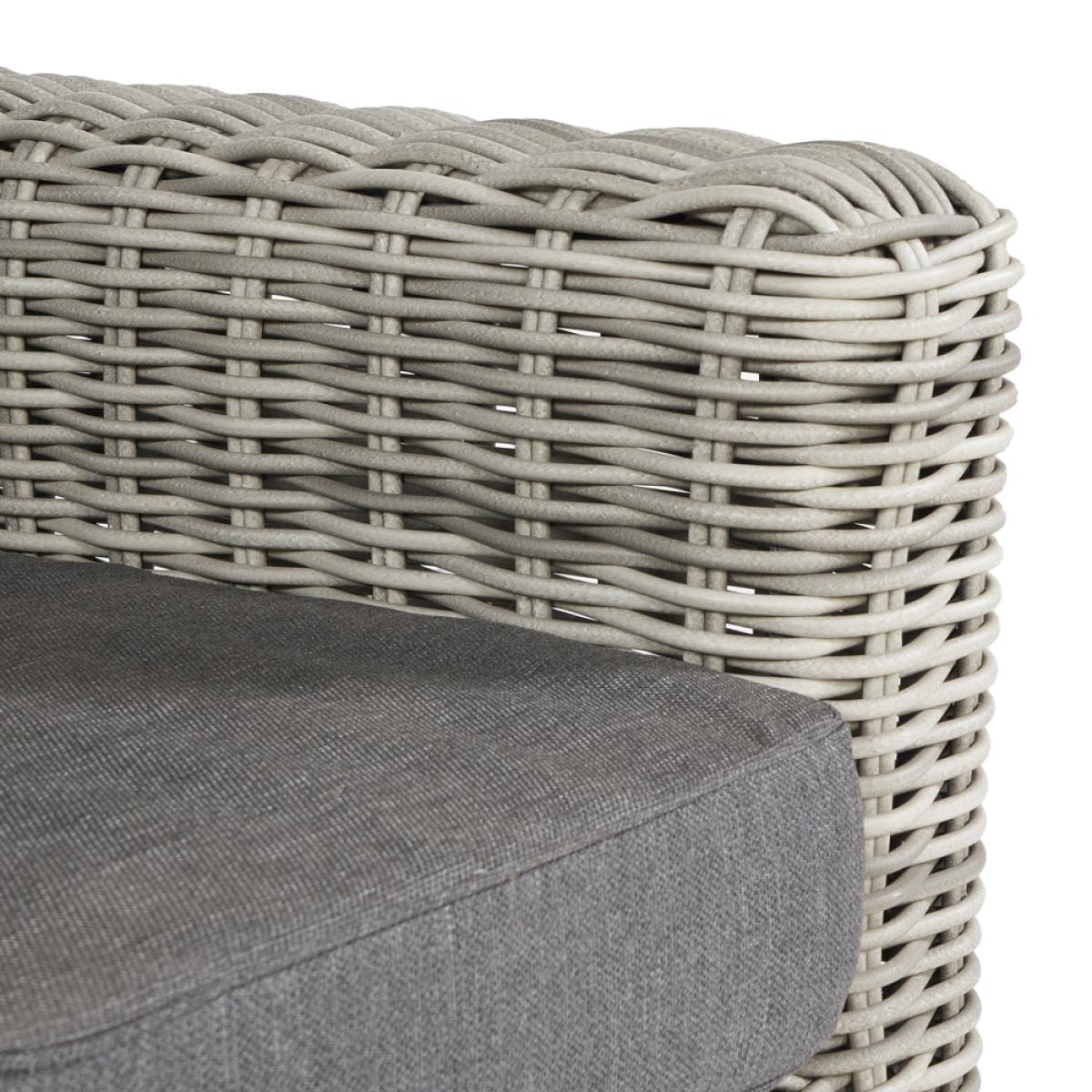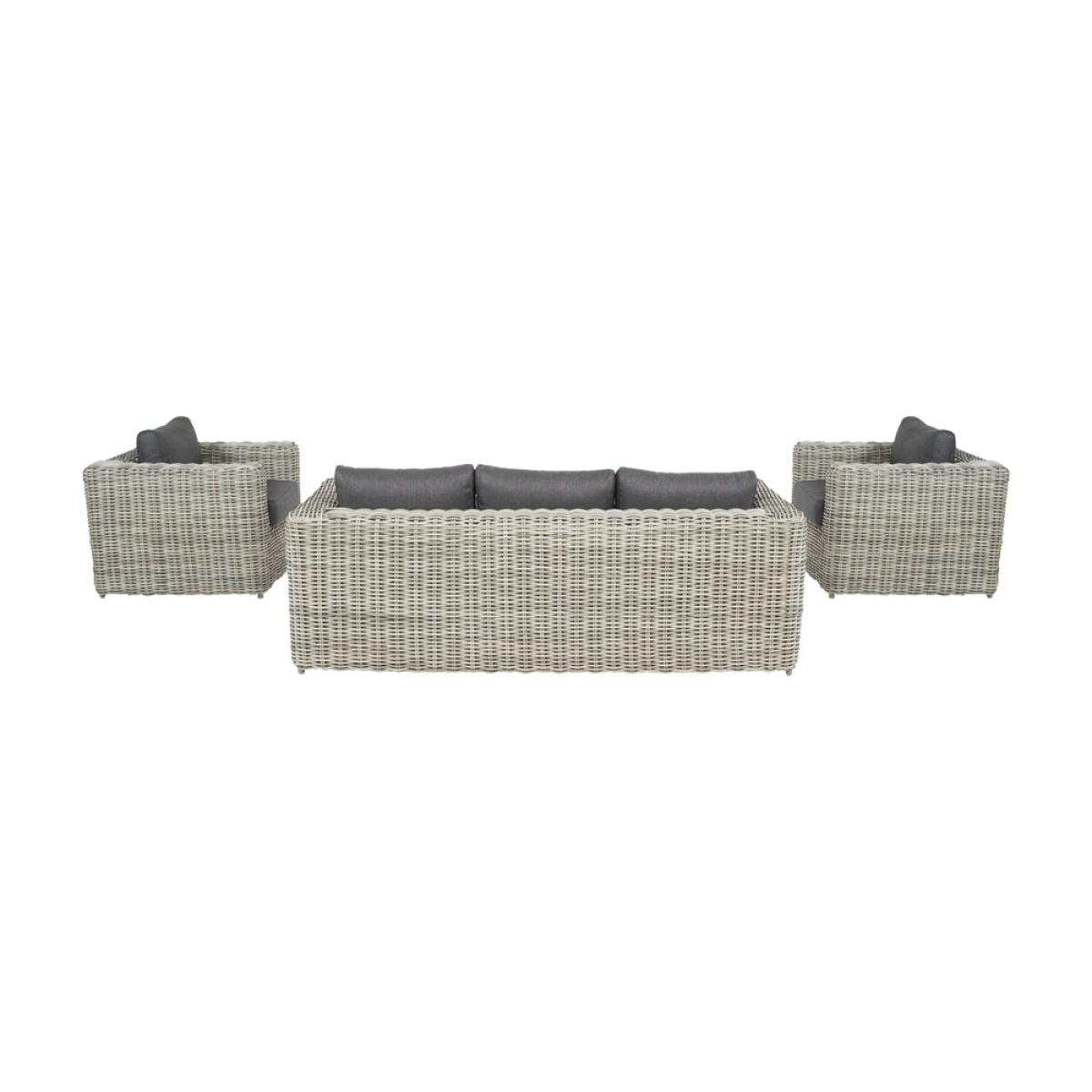 Elevate your outdoor lounging experience with Olivia"s Outdoor Roma Lounge Set. This stylish set features a modern double-skinned weave and a low back seating design for the ultimate lounging experience. Comprising a 3 seater sofa, 2 armchairs, and a central versatile footstool, this set offers a contemporary and comfortable seating arrangement for your garden. Crafted from synthetic double-skinned rattan weave for a modern look and durable weather-resistant finish, this set is complemented by a powder-coated aluminum frame for high-quality and robustness. The season-proof, fire-retardant cushions in a stylish grey provide comfort and style, while being water repellent for added durability. Create a chic and inviting outdoor space with this luxurious lounge set, perfect for relaxing and entertaining in style. 3 Seater Sofa Dimensions: H: 89 cm x W: 223 cm x D: 95 cm