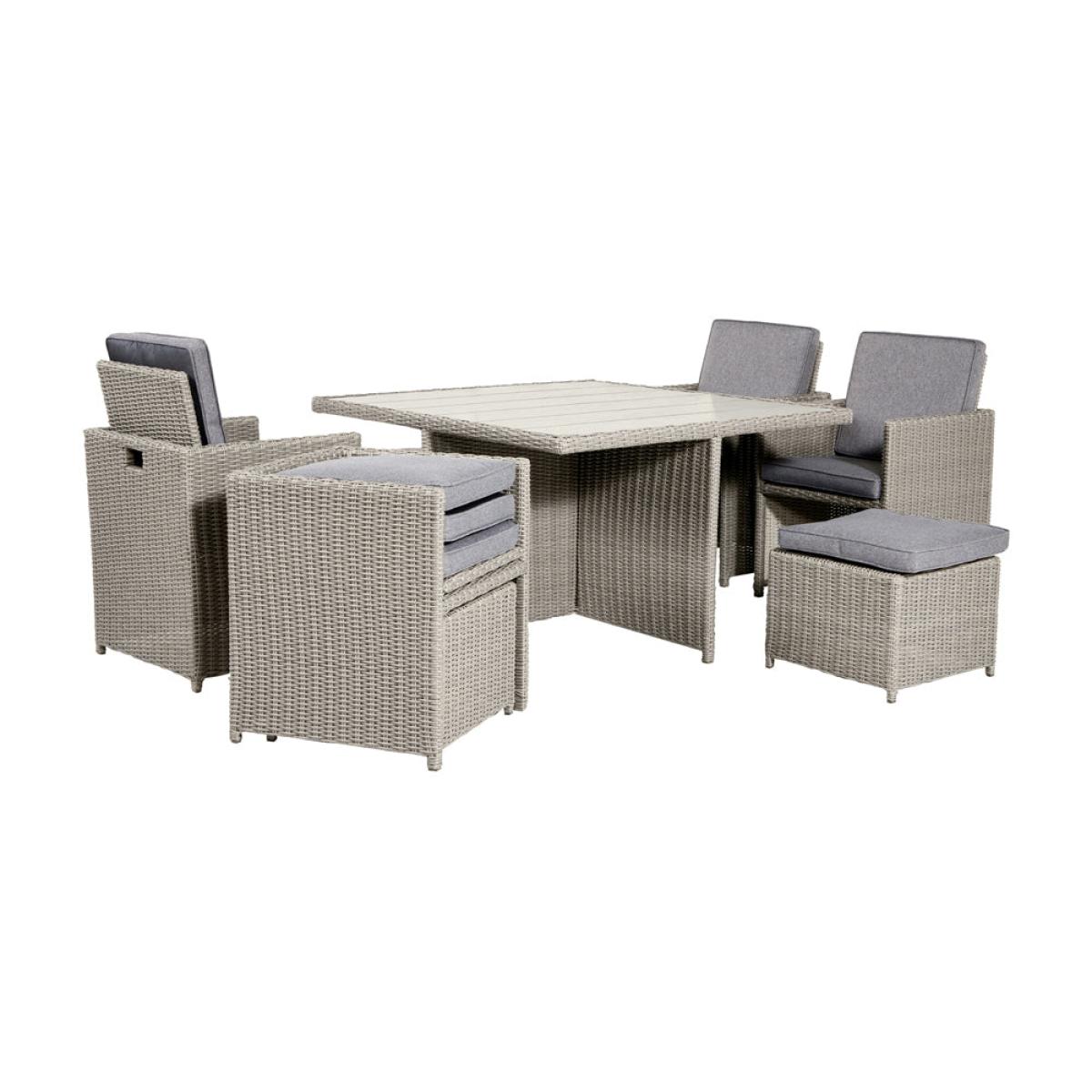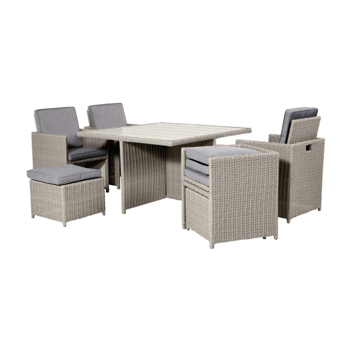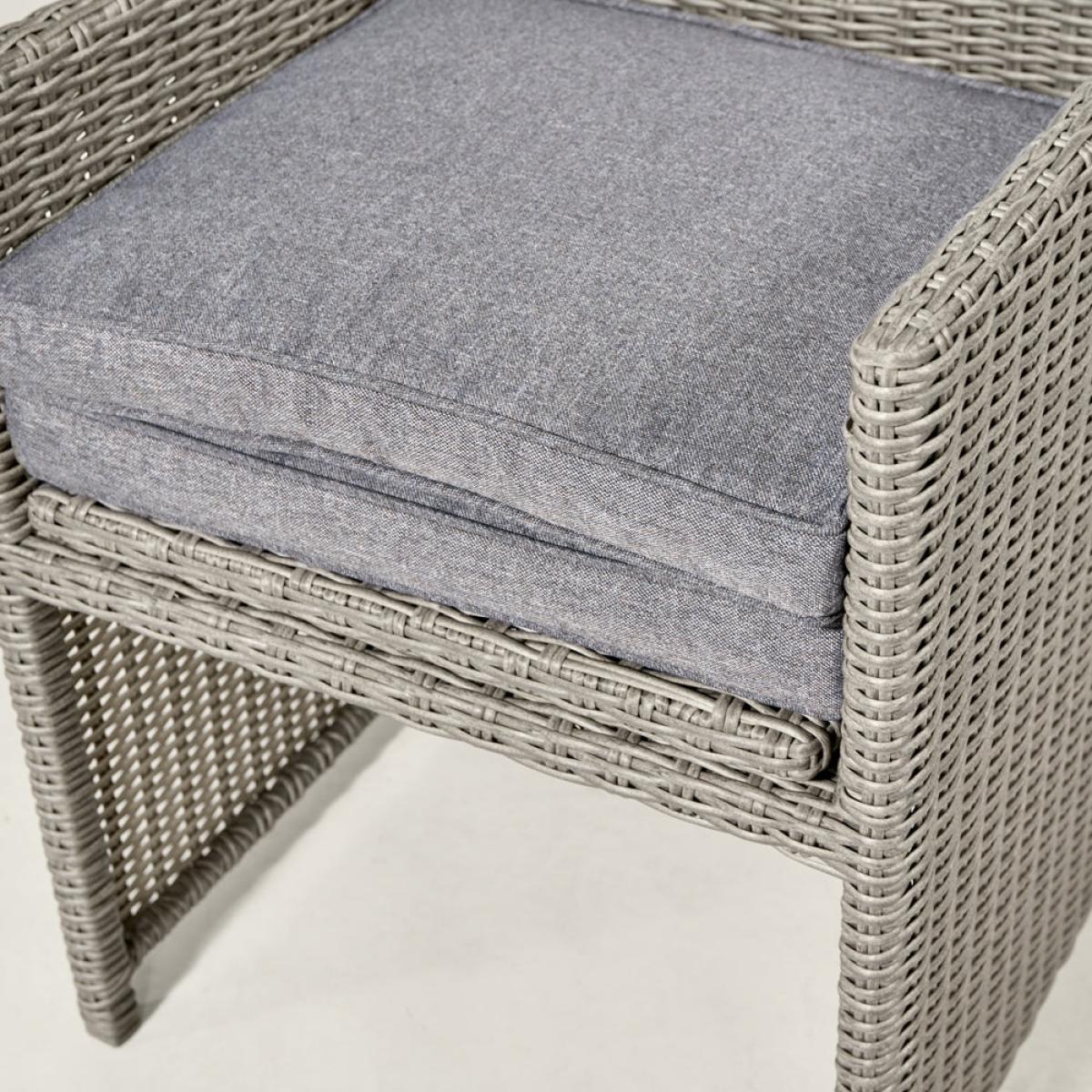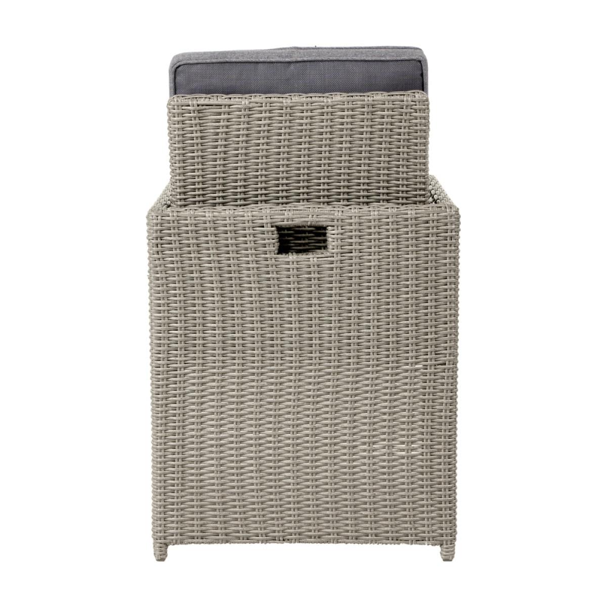Create a versatile outdoor dining space with Olivia"s Outdoor Stone Grey Coasta Cube Set featuring a Ceramic Top. This set includes 1 dining table, 4 arm chairs, and 4 footstools, offering seating for 4-8 guests and easily transforming into a compact cube when not in use. Crafted from synthetic half round rattan weave for a modern look and durable weather-resistant finish, this set is complemented by a powder-coated aluminum frame for high-quality and robustness. The premium ceramic top of the table adds a touch of sophistication, while the season-proof, fire-retardant cushions provide comfort and style, while being water repellent for added durability. Enjoy relaxed gatherings and sunny garden days with this elegant and practical dining set, perfect for entertaining friends and family in style. Chair Dimensions: H: 89 cm x W: 59 cm x D: 59 cm