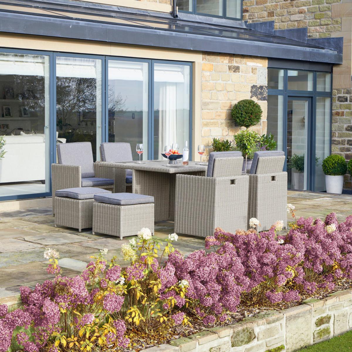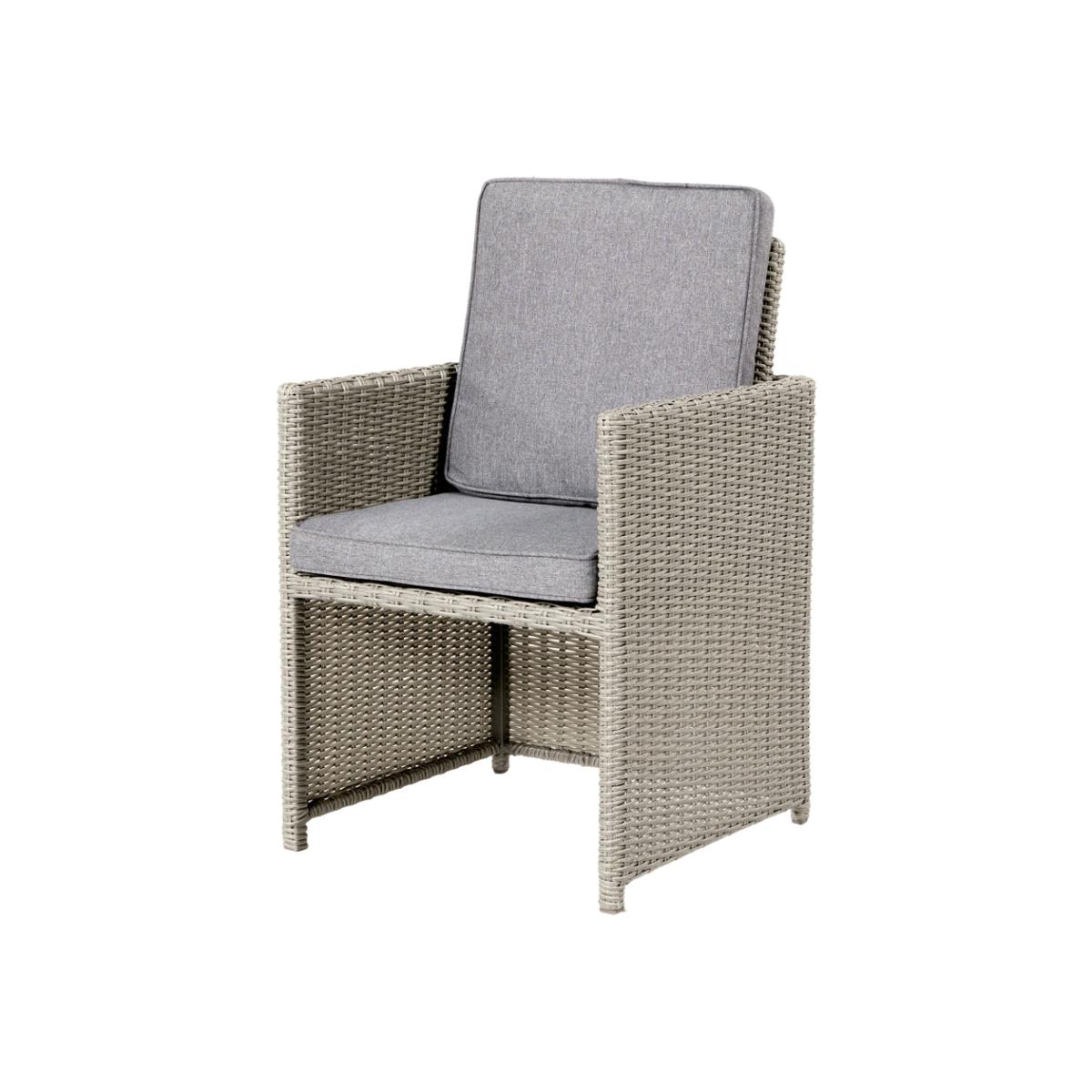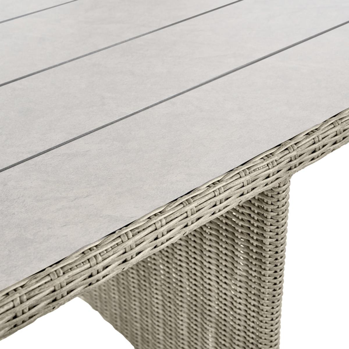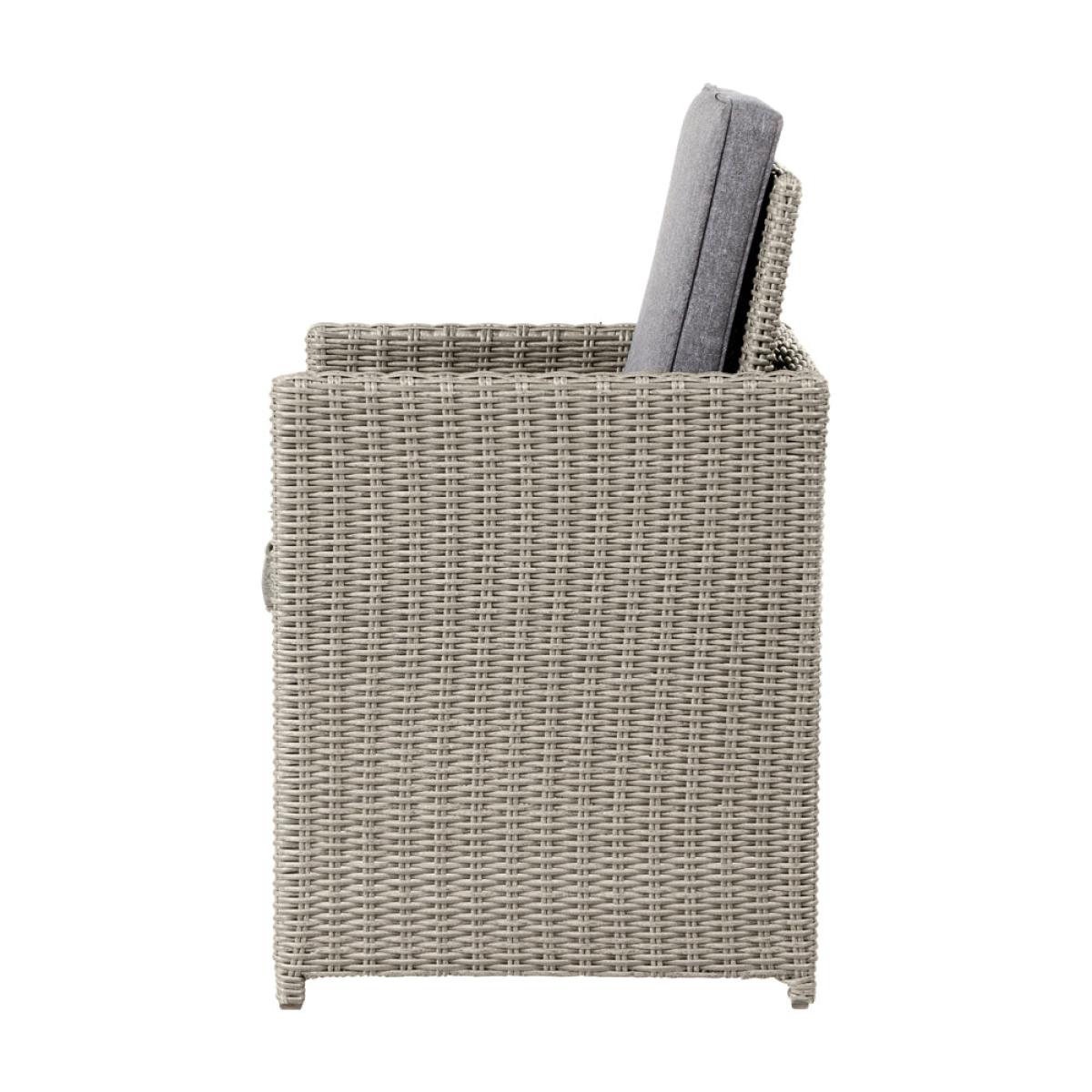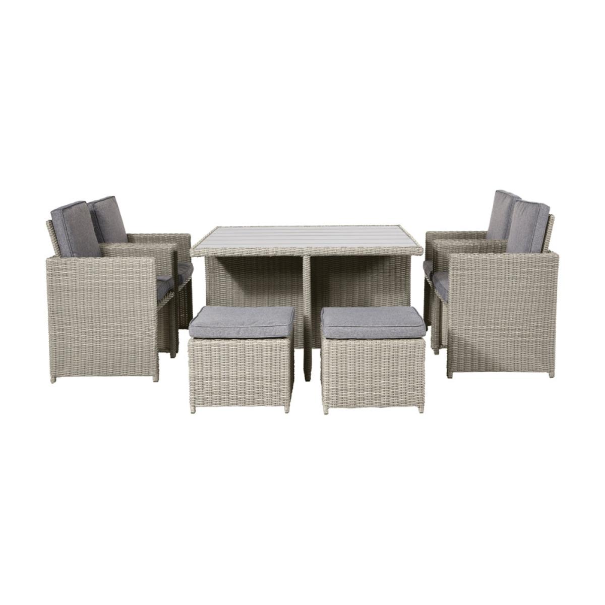 Create a versatile outdoor dining space with Olivia"s Outdoor Stone Grey Coasta Cube Set featuring a Ceramic Top. This set includes 1 dining table, 4 arm chairs, and 4 footstools, offering seating for 4-8 guests and easily transforming into a compact cube when not in use. Crafted from synthetic half round rattan weave for a modern look and durable weather-resistant finish, this set is complemented by a powder-coated aluminum frame for high-quality and robustness. The premium ceramic top of the table adds a touch of sophistication, while the season-proof, fire-retardant cushions provide comfort and style, while being water repellent for added durability. Enjoy relaxed gatherings and sunny garden days with this elegant and practical dining set, perfect for entertaining friends and family in style. Chair Dimensions: H: 89 cm x W: 59 cm x D: 59 cm