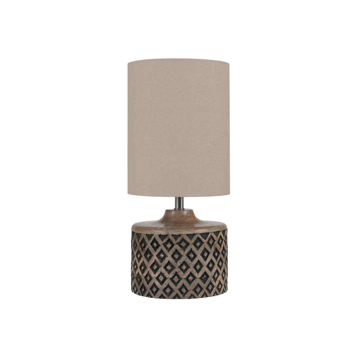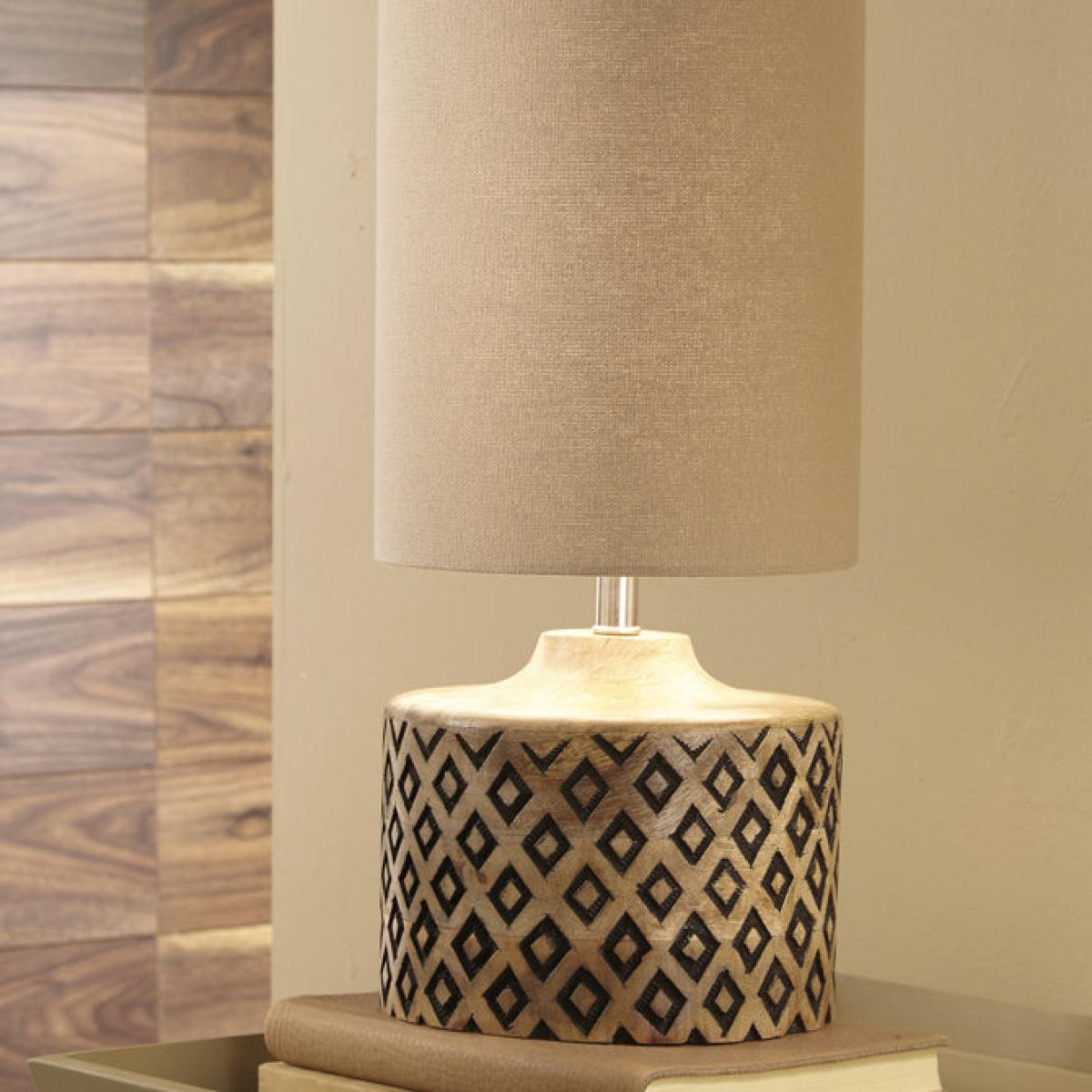 This compact cylindrical wooden base has been hand carved with diamond shapes to create a unique design. Paired with a tall taupe slubby cotton shade, this lamp makes a charming addition to any living area.